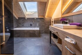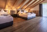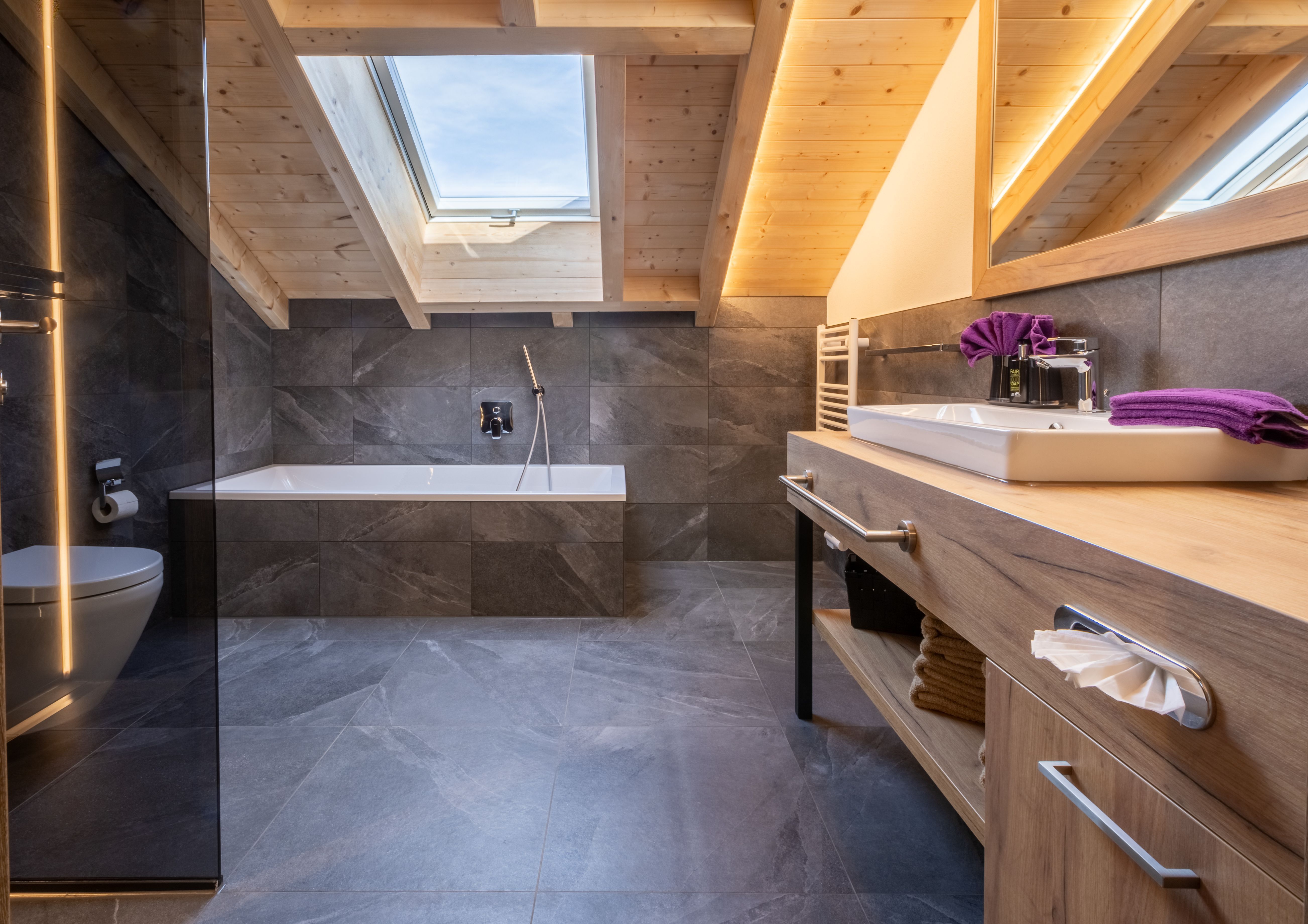 Das gemütliche Dreibettzimmer verfügt über komfortable Boxspringbetten, die für erholsame Nächte sorgen. Das Badezimmer ist luxuriös ausgestattet und bietet sowohl eine Badewanne als auch eine Regendusche sowie ein WC.