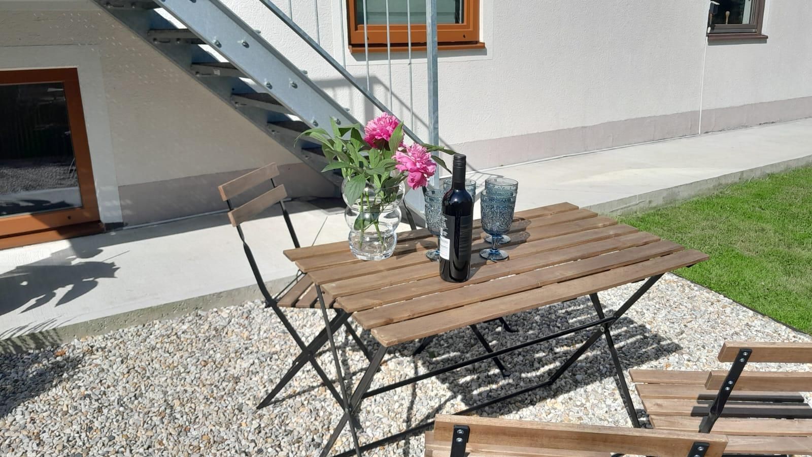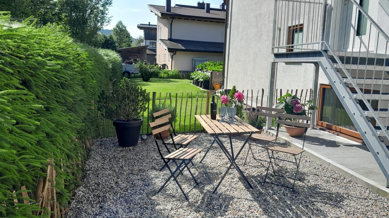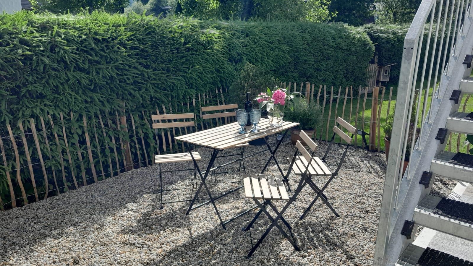 Ein kleiner Garten mit Sitzgelegenheit befindet sich direkt neben dem privaten Eingang.