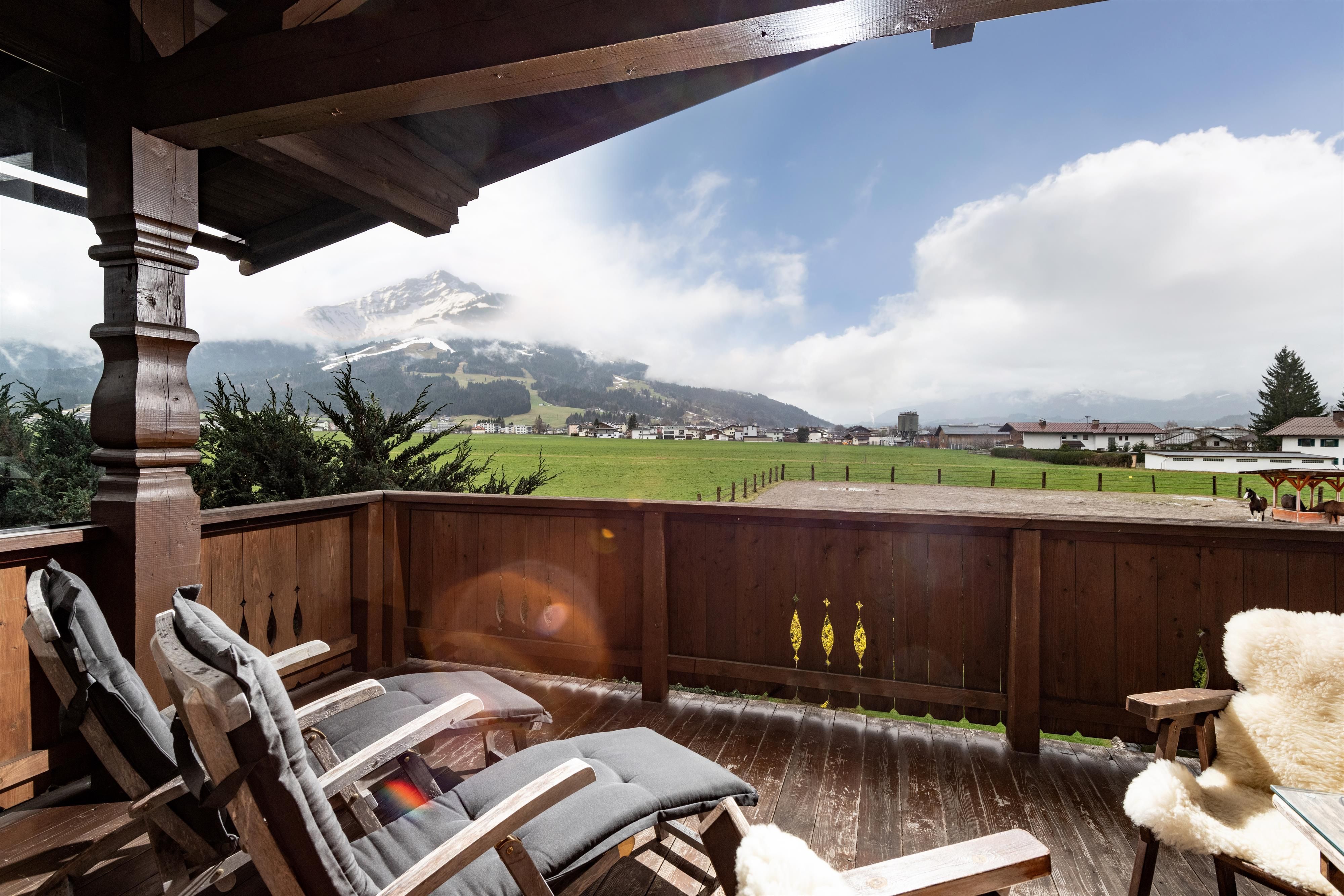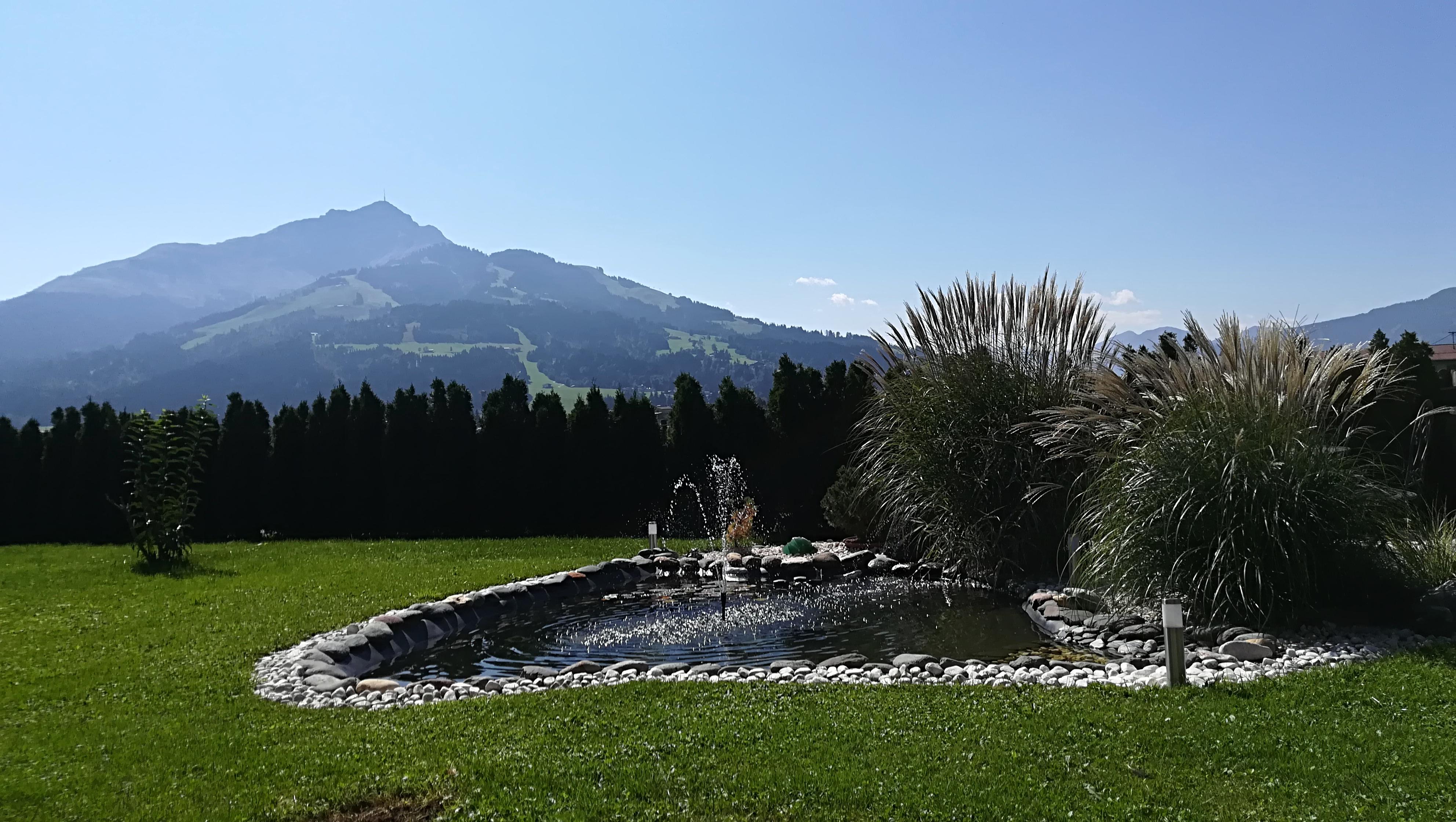 Sie erwartet ein unverbauter, herrlicher, freier Blick auf das Kitzbüheler Horn und die umliegende Bergwelt.