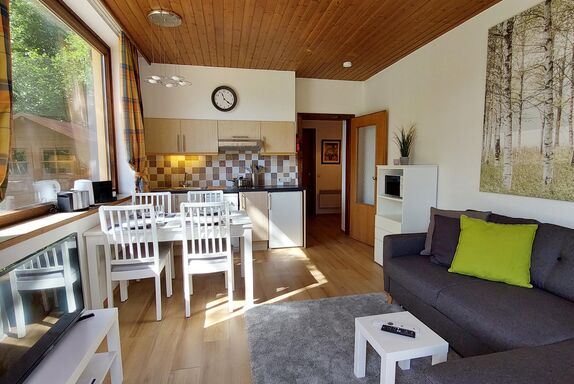Schöne 2-Zimmer-Wohnung 300 m von der Nockalmbahn und den Skipisten entfernt, ein ausgezeichneter Ausgangspunkt für herrliche Sommerwanderungen. Zwei Schlafzimmer, eines mit Doppelbett, eines mit Etagenbett, nur für Kinder geeignet. Badezimmer mit Dusche, Wohnzimmer mit Küchenzeile und Schlafsofa, große Terrasse mit Blick auf den Garten. Externer Parkplatz und Skiraum.