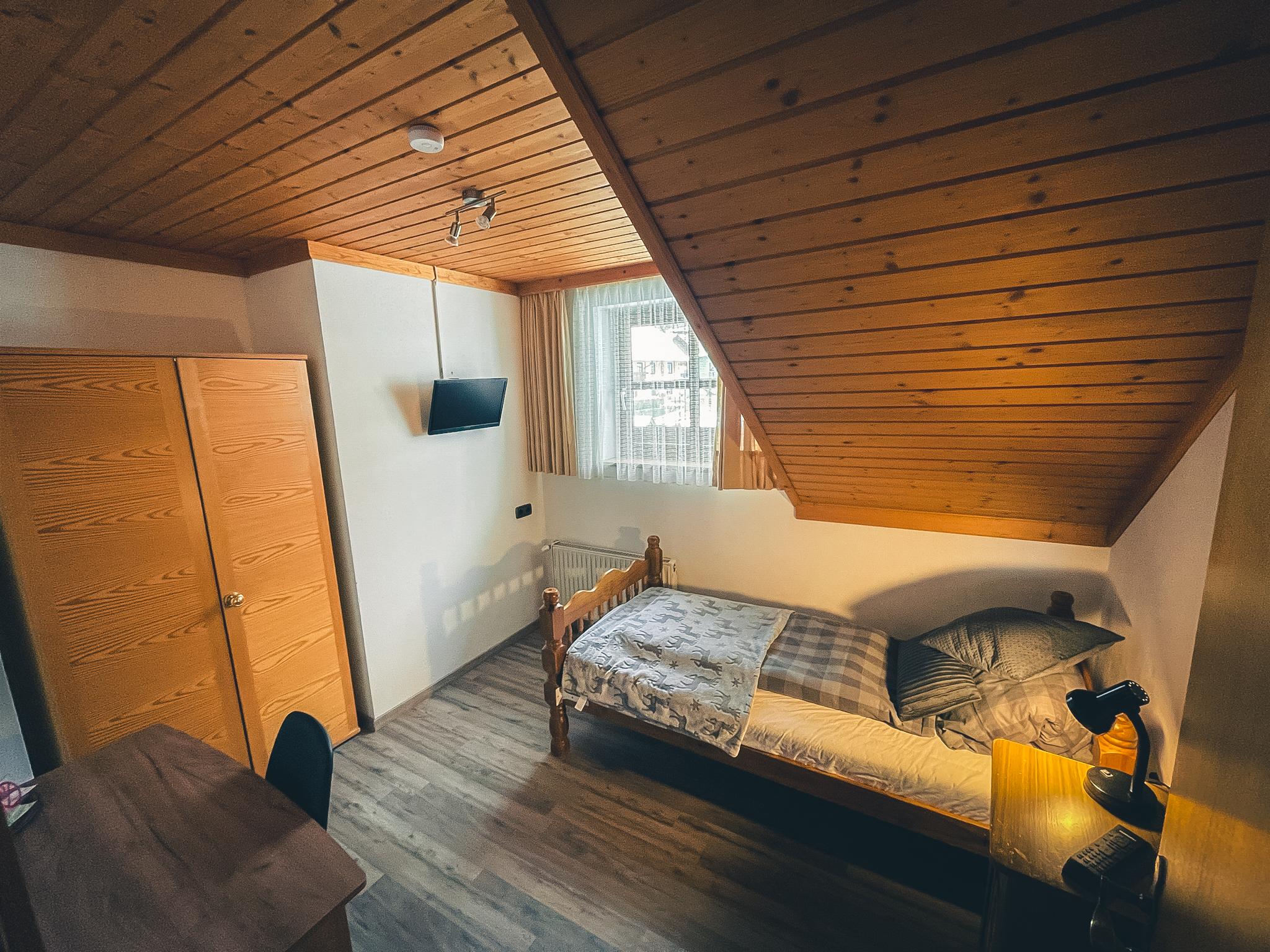 Zimmer 18 ist ein Zimmer für 1 Person. Darüber hinaus verfügt dieses Zimmer über ein Badezimmer mit Bad und WC.