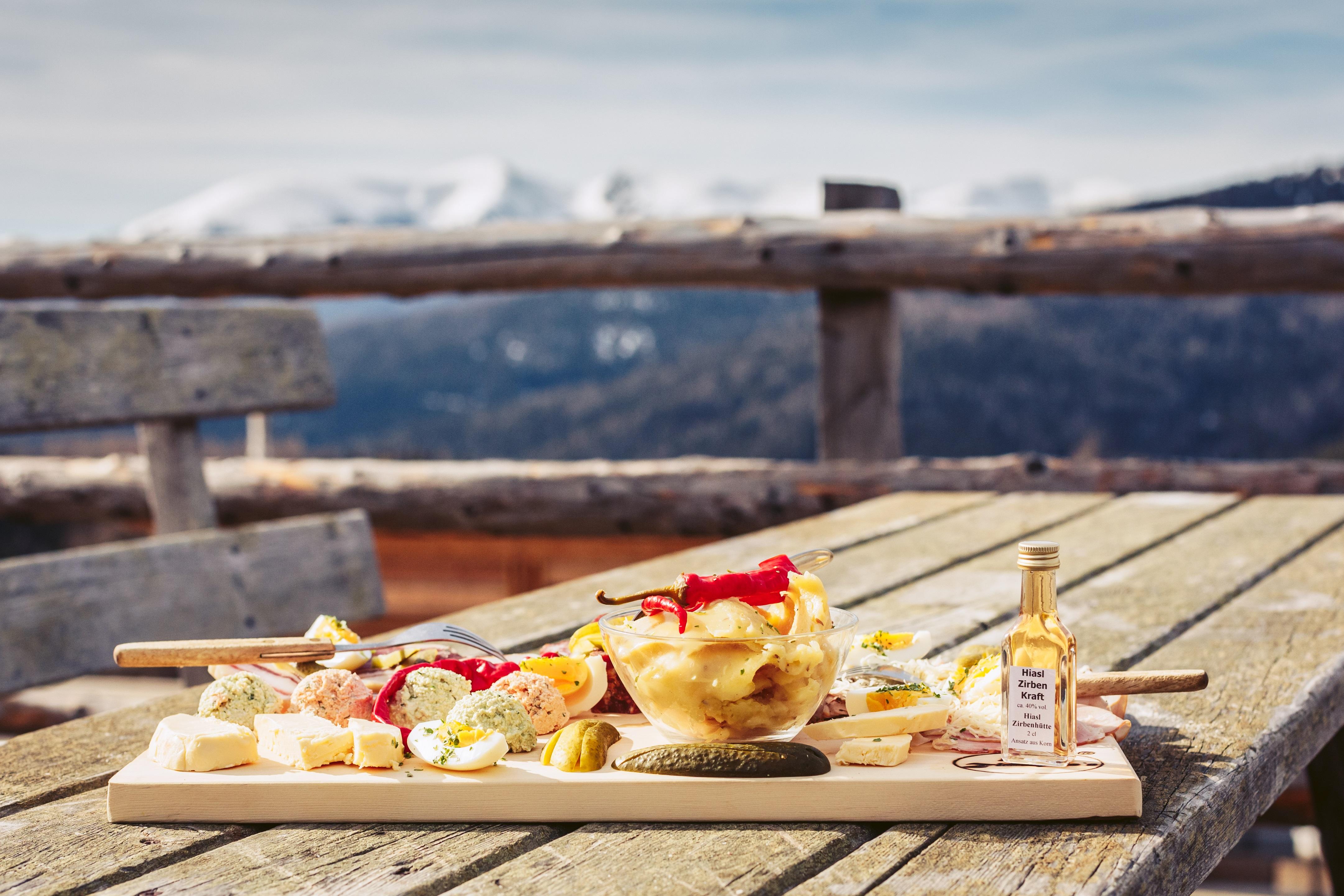 Wir verwöhnen Sie mit Gerichten von Nockfleisch: Gegrilltes Rindfleisch, Schweinsbraten mit Semmelknödel, Wiener Schnitzel, Bratwürste, unserem Hiasl Burger, Leberknödelsuppe... Weiters gibt es die Hiasl Zirbenjaus´n, den bereits berühmten Glundner Käse, Belegte Brote, Kaiserscharrn, Kärntner Reindling, Apfelkuchen, Topfenstrudel u.v.m.