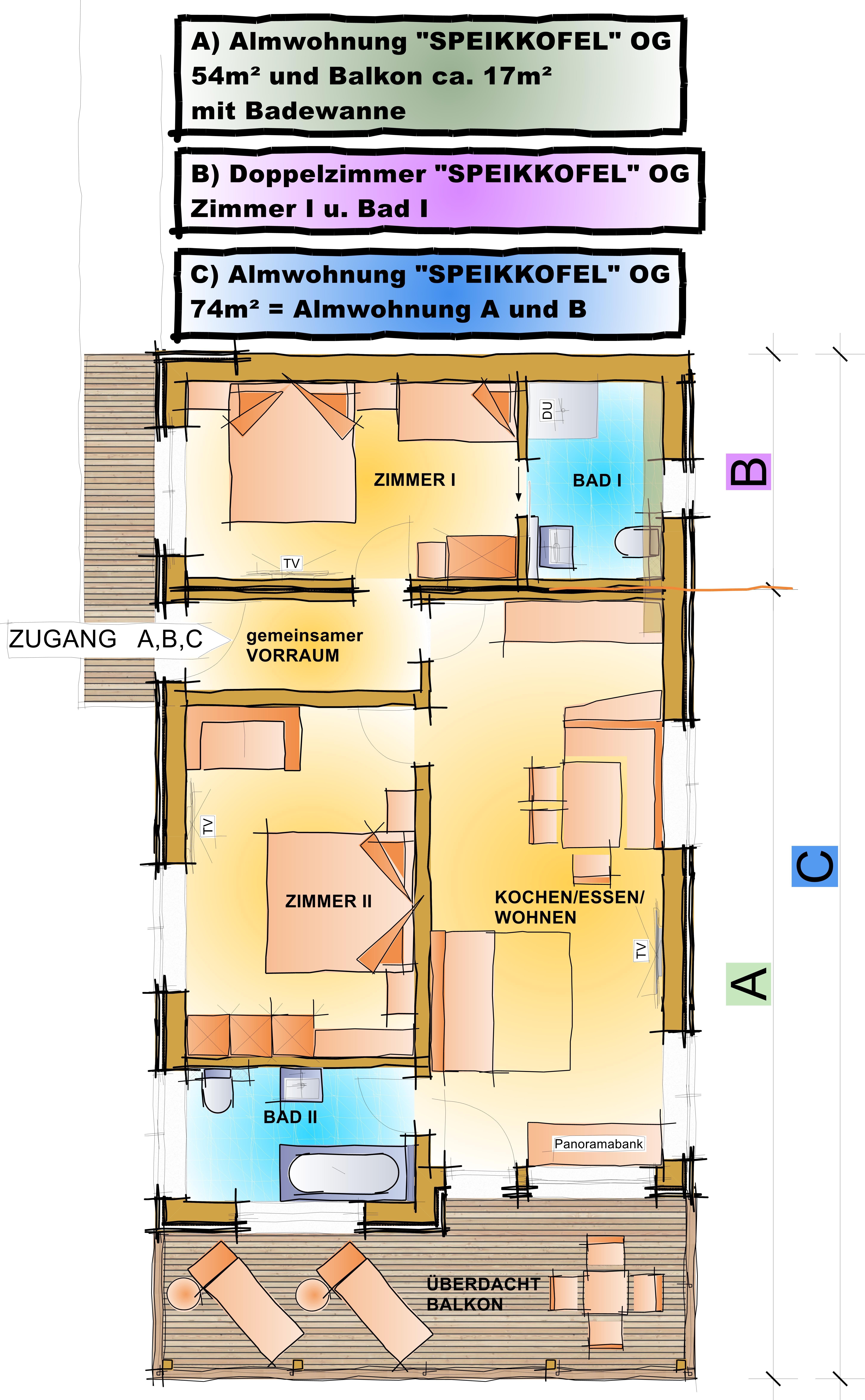 3, NEU ist unser Zubau mit 3 schönen, exklusiven, ökologisch errichteten Almwohnungen und einer Sauna mit Außenbadewanne! Es gibt die Almwohnung Speikkofel im Ganzen buchbar oder man bucht die kleine Almwohnung oder das Doppelzimmer extra. Weiters gibt es die Almwohnung Bretthöhe und die Almwohnung Lattersteig.
