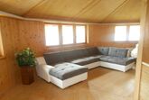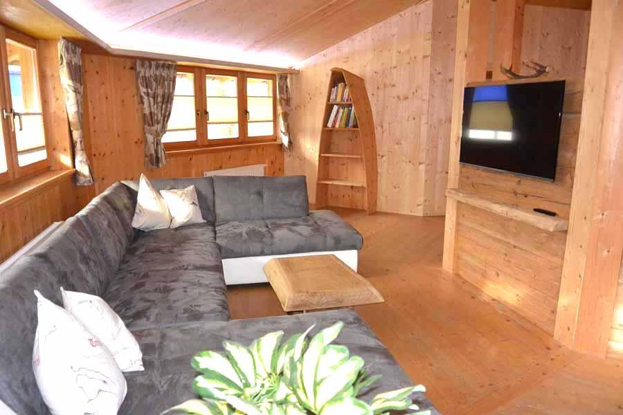 Im Wohnbereich befindet sich eine gemütliche Wohnlandschaft mit einem großen Flat-TV.