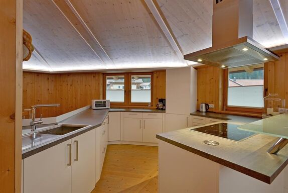 Im OG steht eine vollausgestattete, moderne Küche mit Geschirrspüler, Cerankochfeld, Backofen, Mikrowelle, Toaster, Filter-Kaffeemaschine, Wasserkocher und Kühlschrank zur Verfügung.