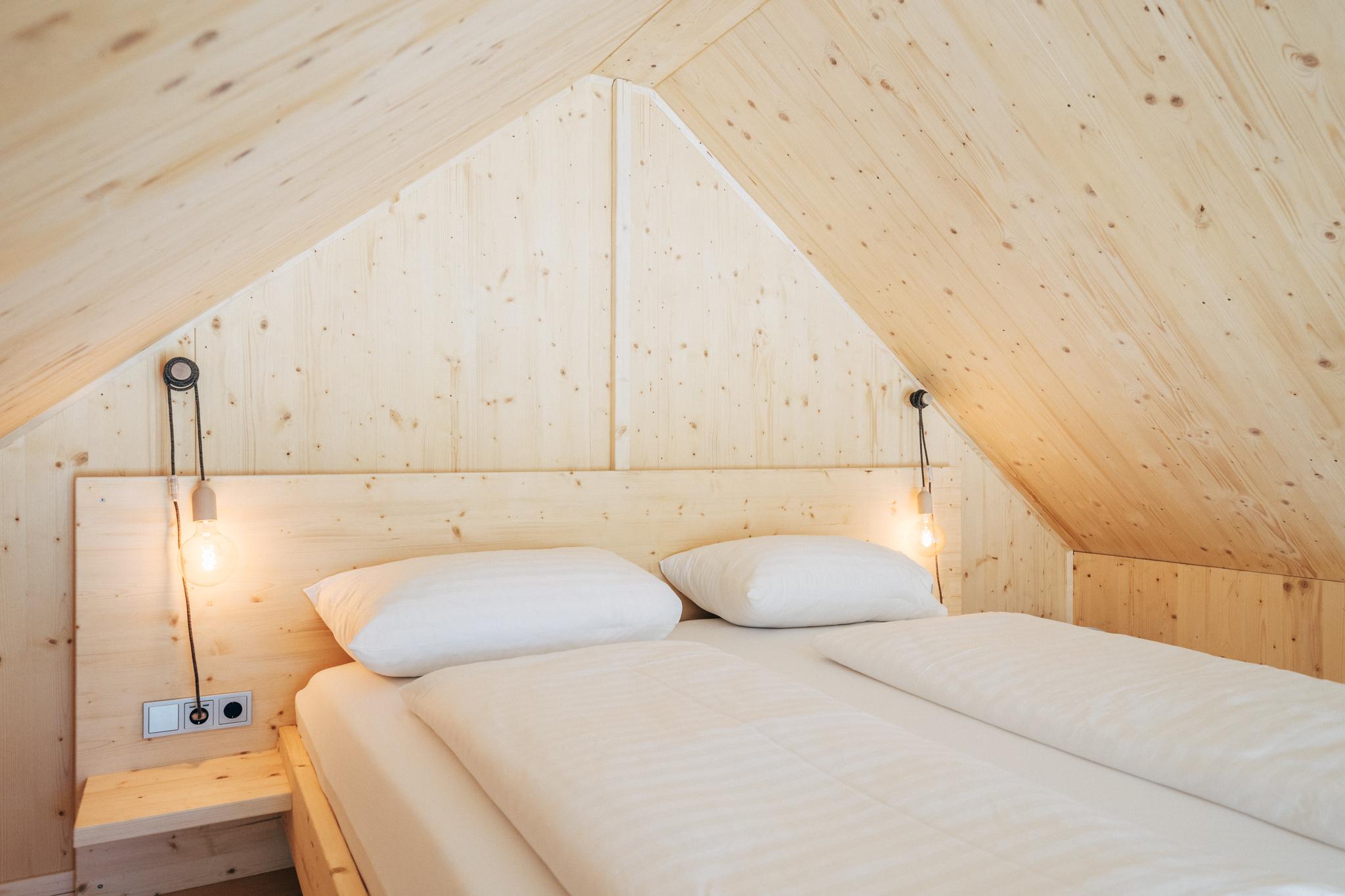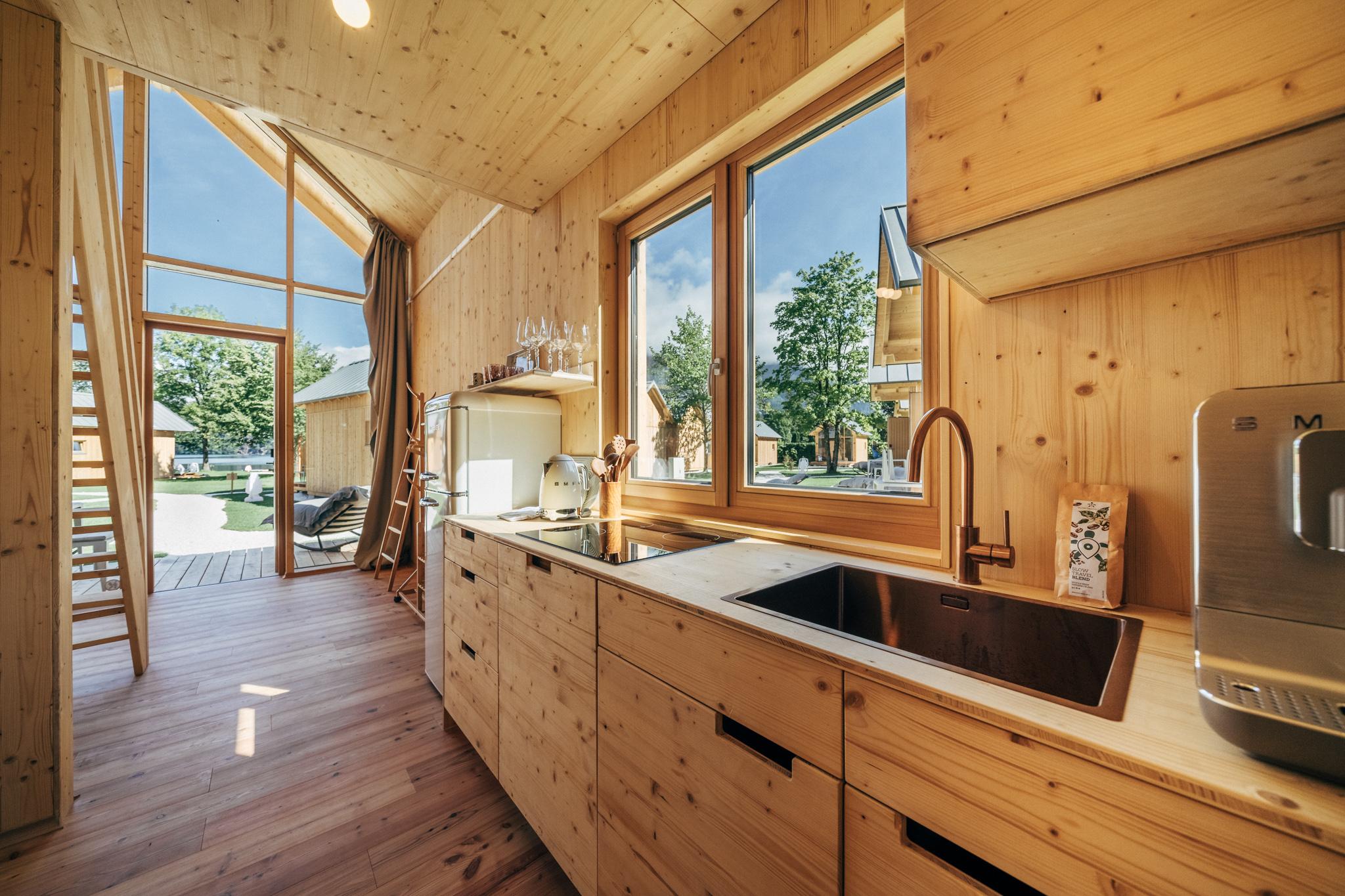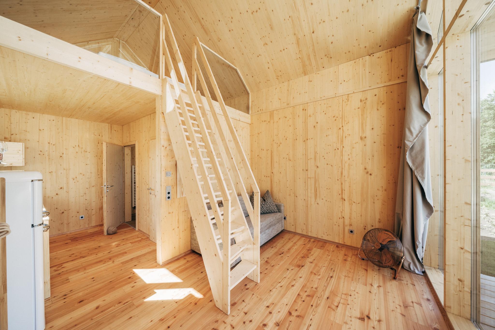 Salvia Green - View 34 Quadratmeter und dennoch reichlich Platz für vier Personen. Im Erdgeschoß befindet sich die moderne Küche samt geräumigem Wohnraum, das Badezimmer und ein separates WC. Über eine Treppe gelangen Sie in den 1. Stock, wo das Schlafzimmer mit Traumblick durch die große Glasfront bezaubert. Wie alle Lodgen verfügt Salvia Green über eine tolle möblierte Terrasse, WLAN, einer Grundausstattung an Wäsche und Geschirr sowie 3 Yogamatten. Ob als Familie, mit Freunden oder zu zweit. Entspannte Stunden im schönen Ambiente von Salvia Green sind garantiert!