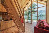 Ruby Red WOW View Die beste Entscheidung für Romantiker. Das große Badezimmer im Erdgeschoß verfügt über eine freistehende Badewanne für entspannte Stunden zu zweit. Im Erdgeschoß befindet sich die moderne Küche samt geräumigem Wohnraum, das erwähnte Bad und ein separates WC. Über eine Treppe gelangen Sie in den 1. Stock, wo das Schlafzimmer mit Traumblick durch die große Glasfront bezaubert. Wie alle Lodgen verfügt Ruby Red über eine tolle möblierte Terrasse, High Speed Internet, einer Grundausstattung an Wäsche und Geschirr sowie 3 Yogamatten. Designverliebte werden sich in dieser aus heimischem Holz und Glas erbauten Lodge besonders wohlfühlen.