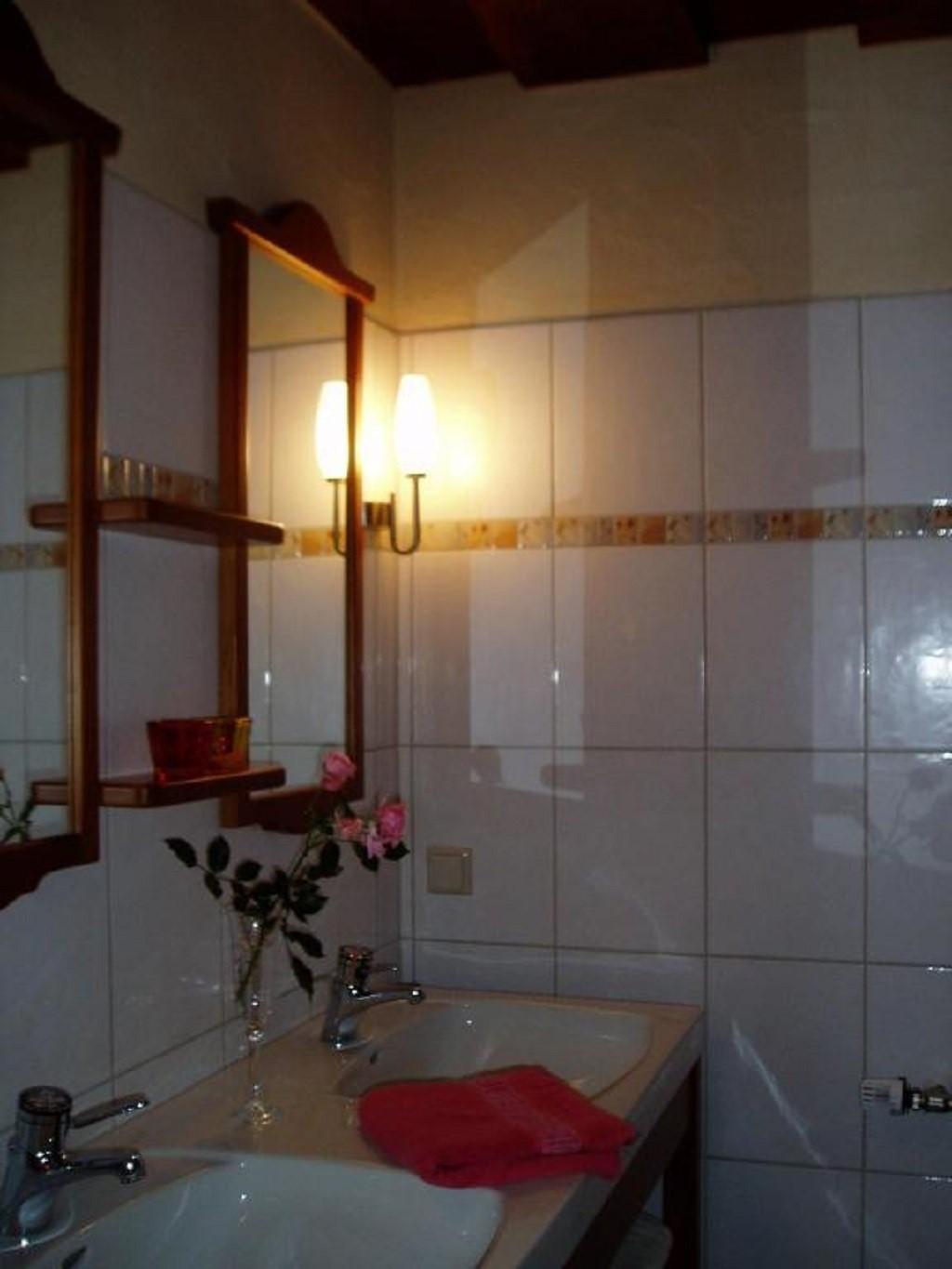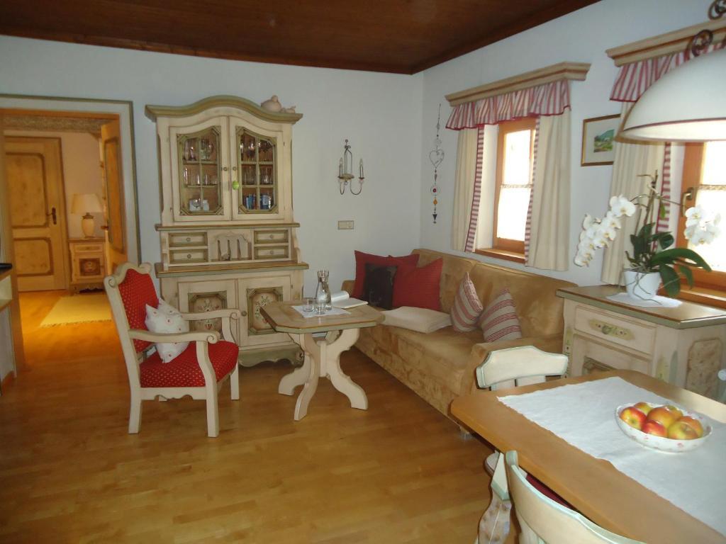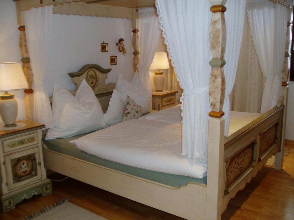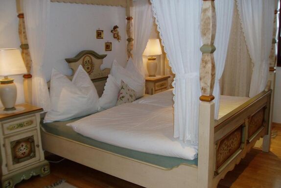 Rustikal, charmant und mit viel Liebe zum Detail eingerichtet, bietet die Ferienwohnung Maiglöckchen Platz für 2 bis 4 Personen. Herzstück ist das Schlafzimmer mit Himmelbett, ergänzt durch ein kleines Schlafzimmer mit zwei Einzelbetten (je 1,90 m Länge), die sich bei Bedarf auch als Doppelbett kombinieren lassen.