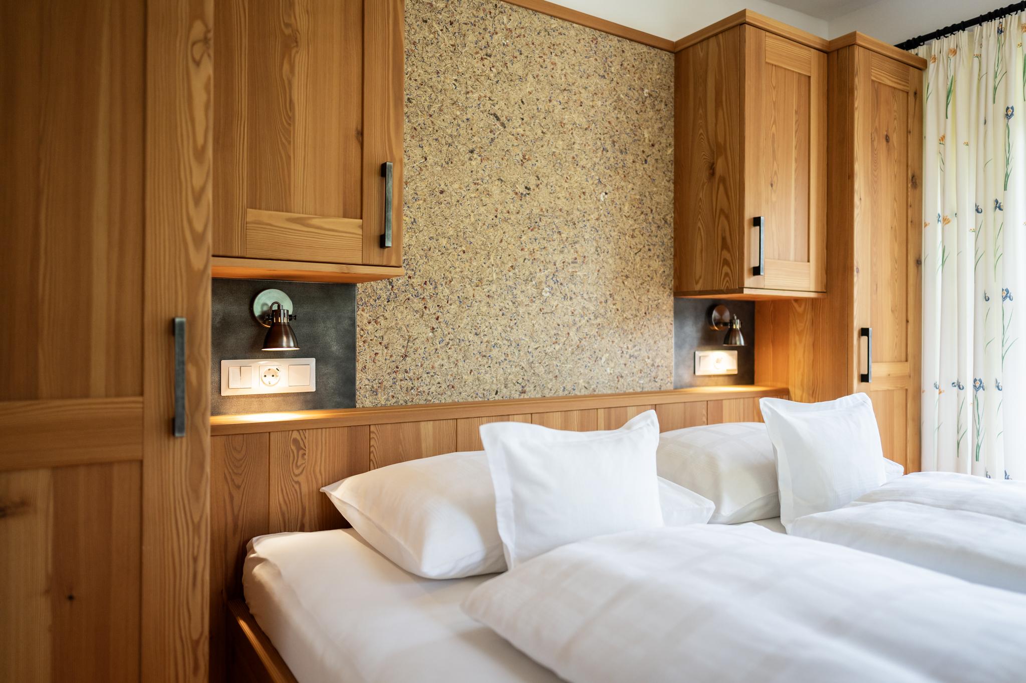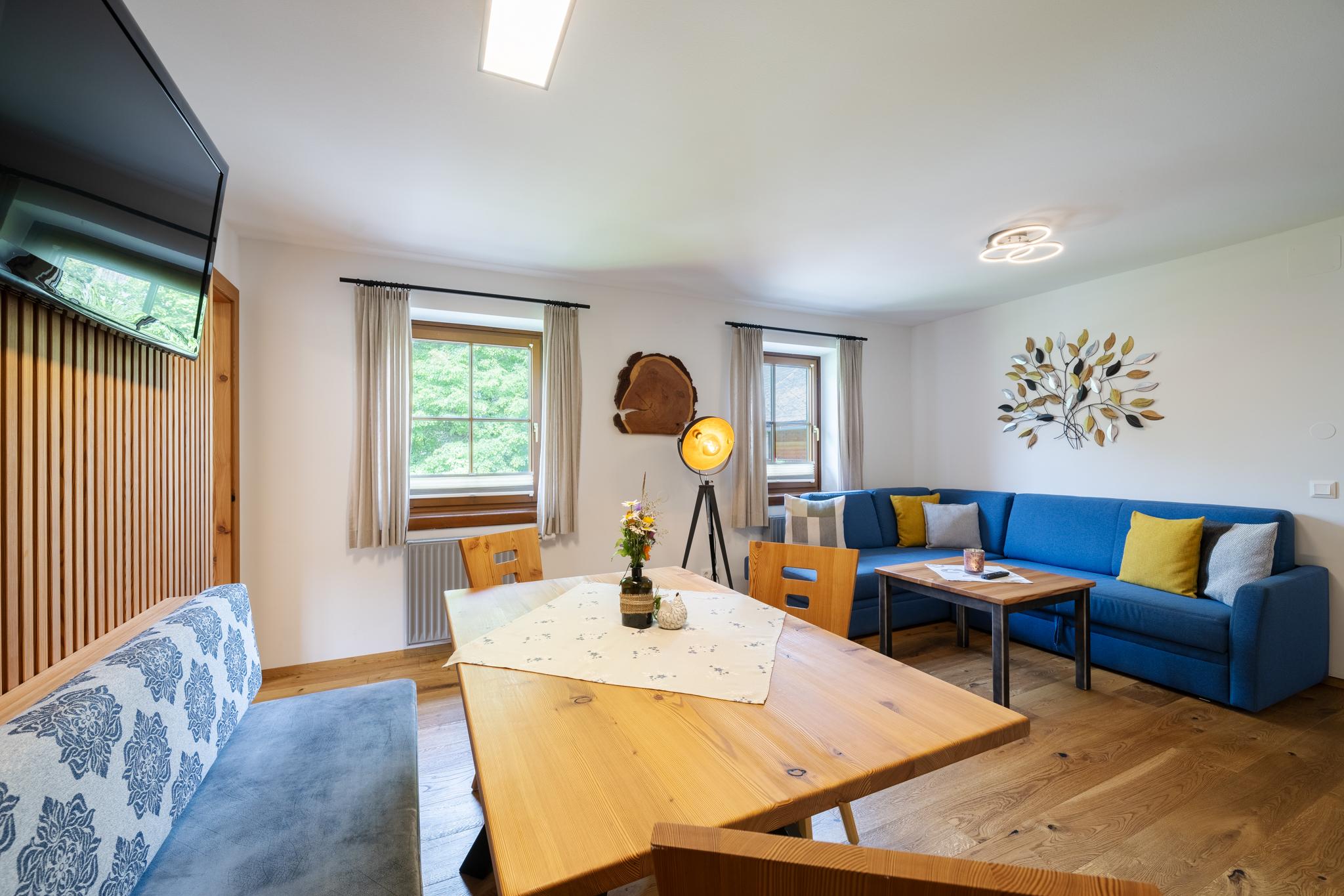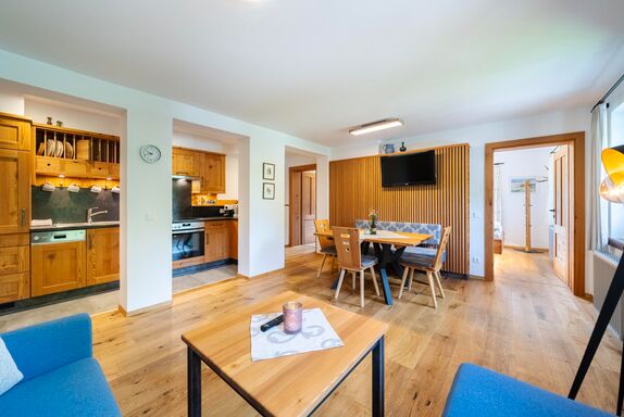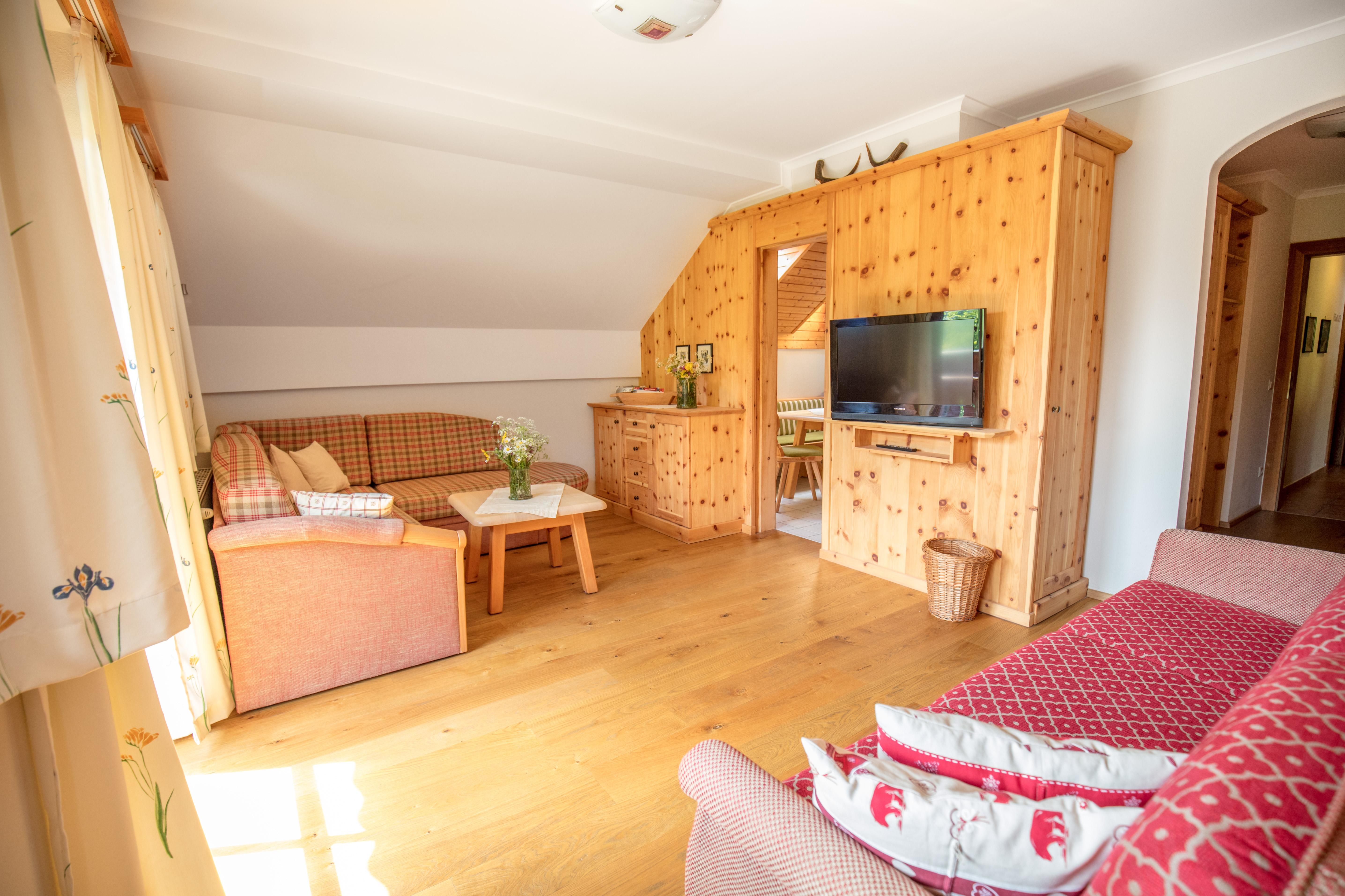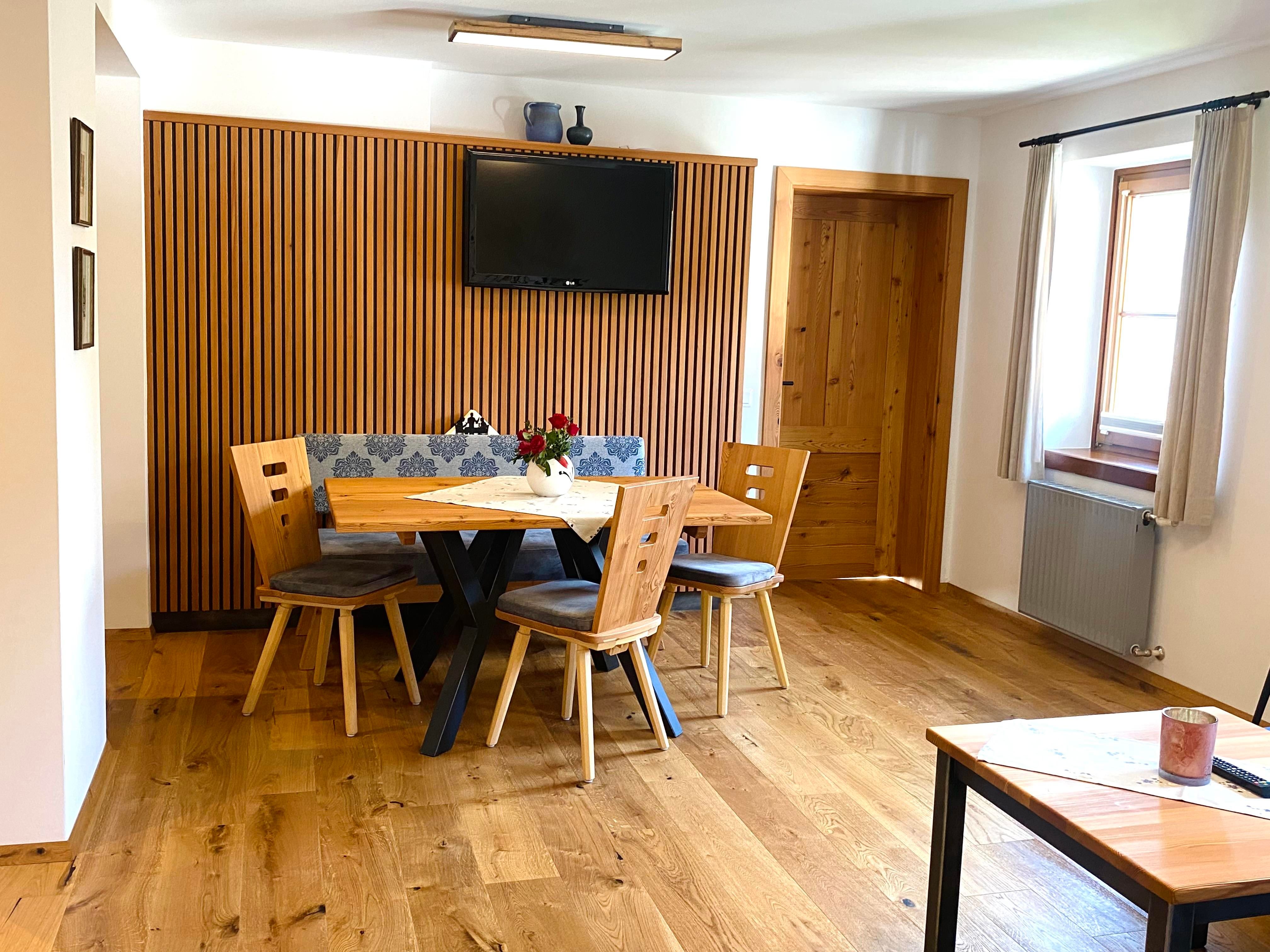 Unser neu gestaltetes Appartment aus heimischen Lärchenholz verfügt über eine voll eingerichteten Küche , zwei Schlafzimmer , Wohnraum, Bad, WC, Radio , Sat-TV , WLAN und eine Balkon mit Blick auf die Berglandschaft.