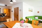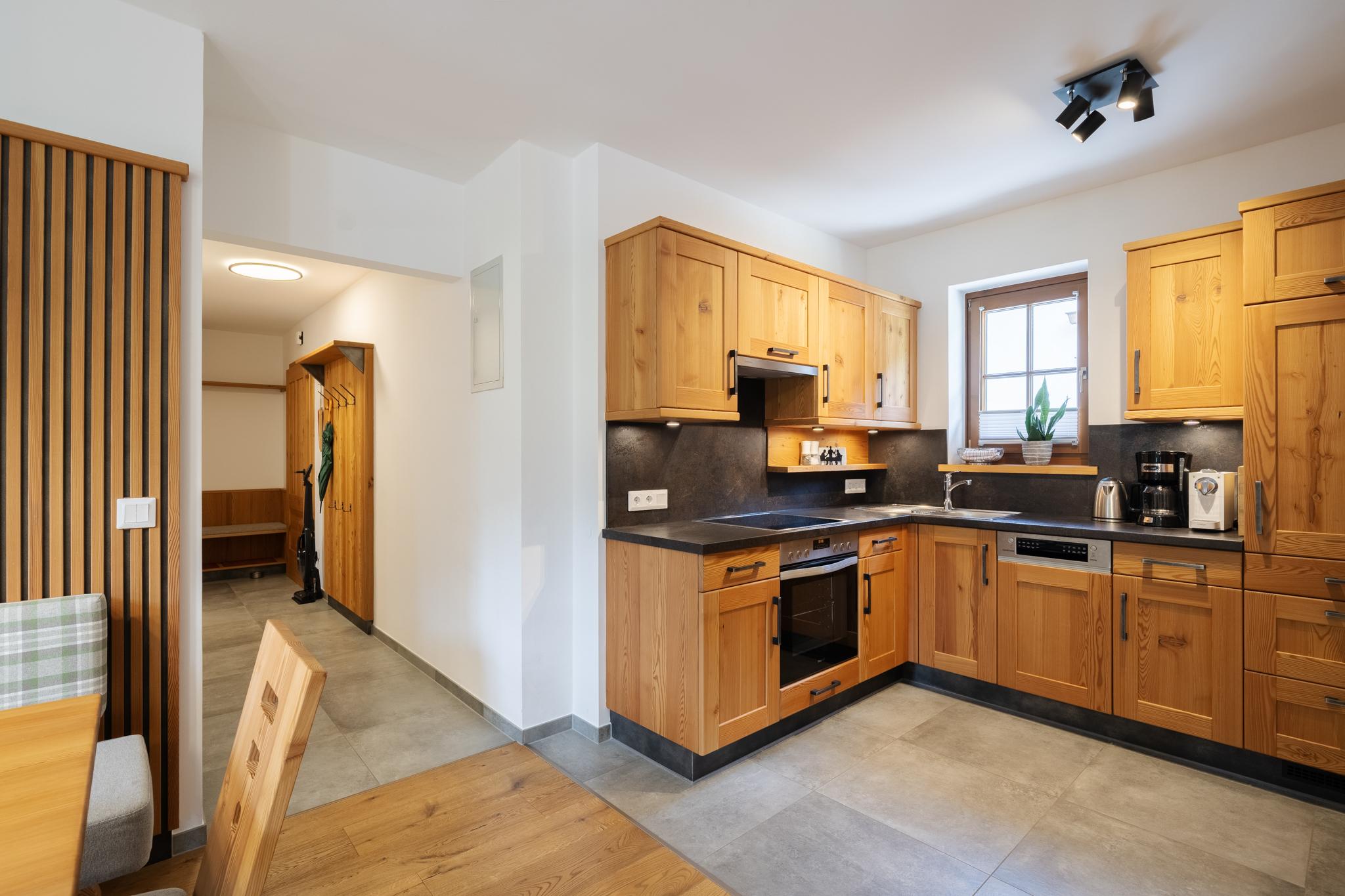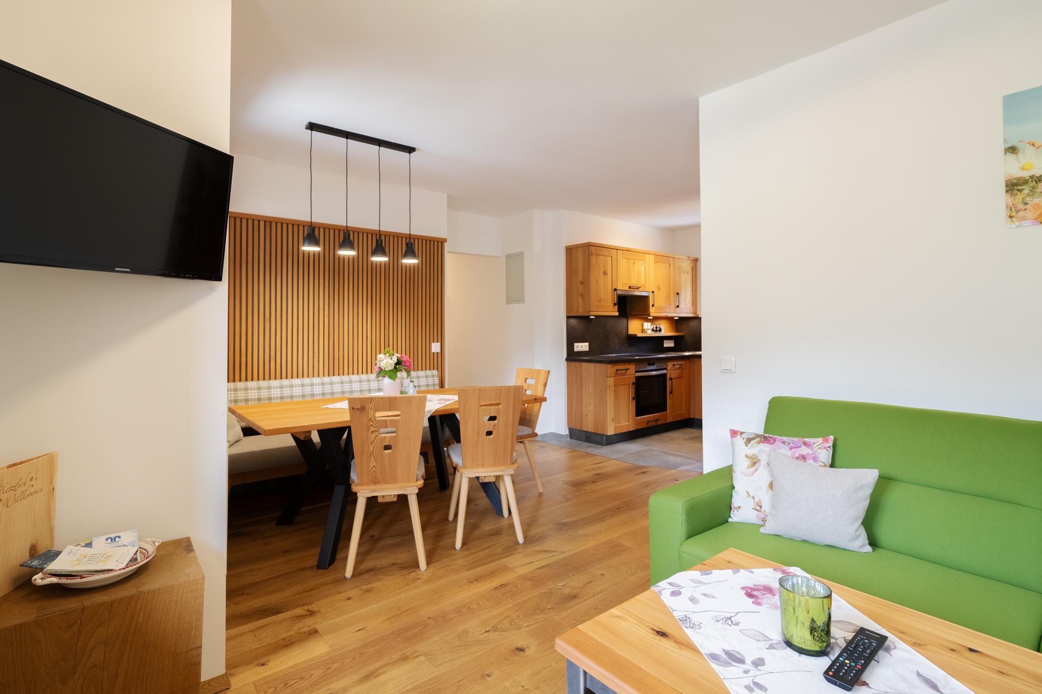 Appartement aus heimischen Lärchenholz ausgestattet mit einer voll eingerichteten Küche , zwei Schlafzimmer , Wohnraum, Bad, WC, Radio , Sat-TV , WLAN und einer großen Terrasse mit Blick auf das Kirchheimertal.