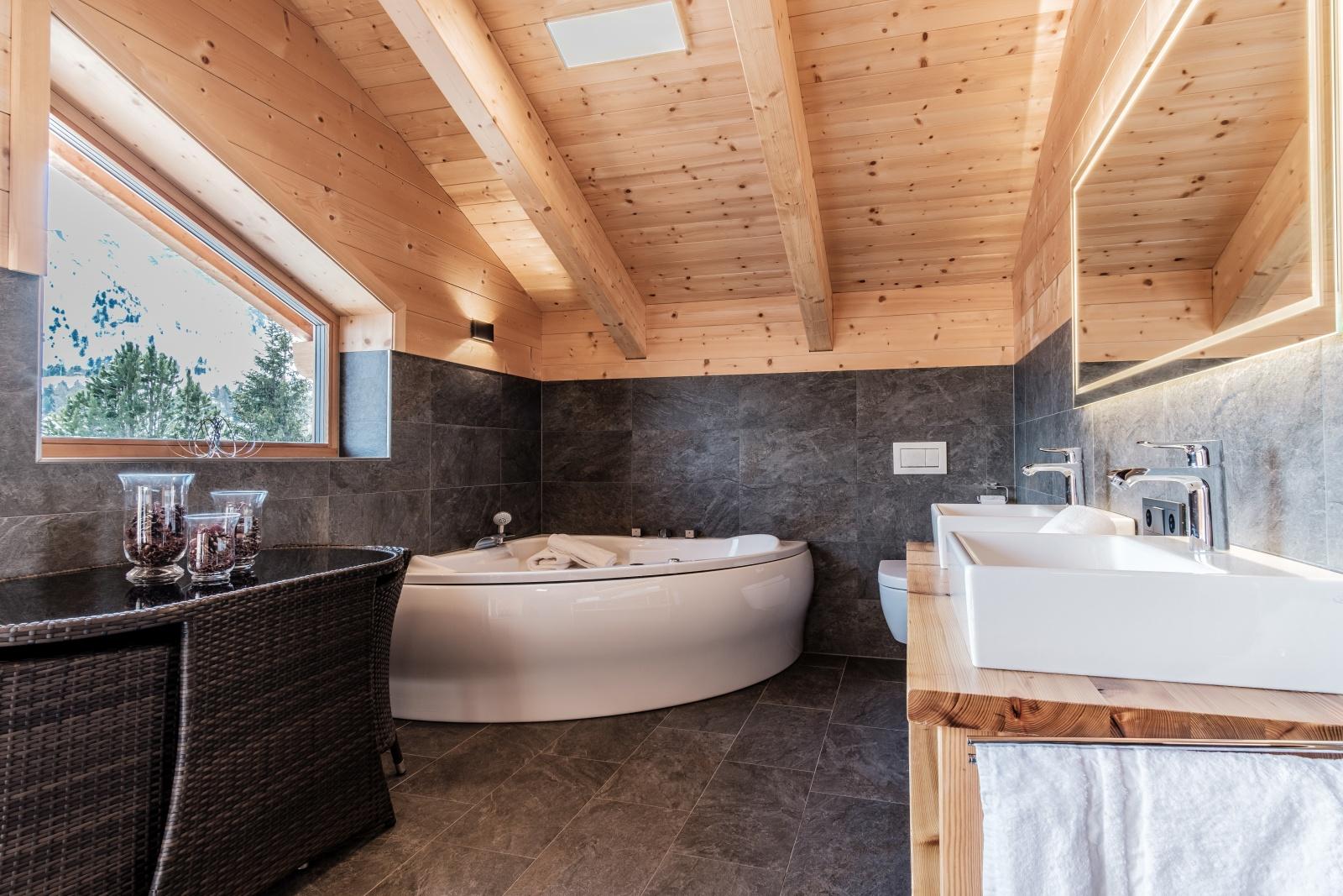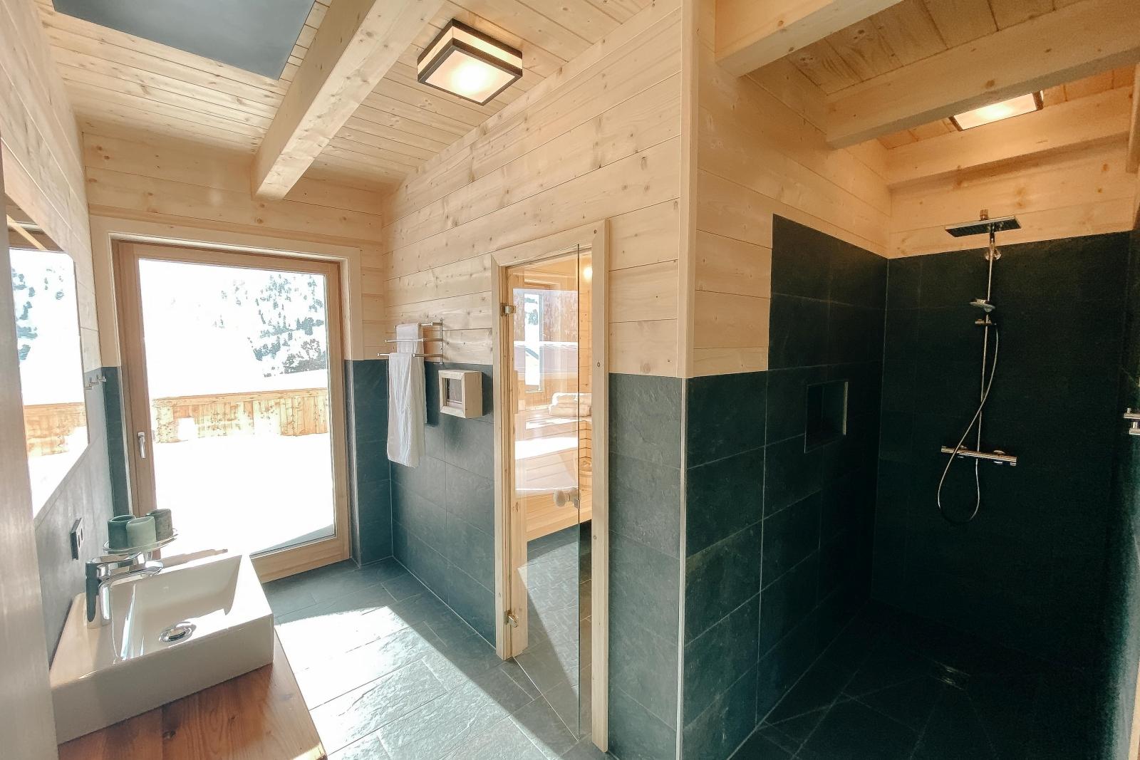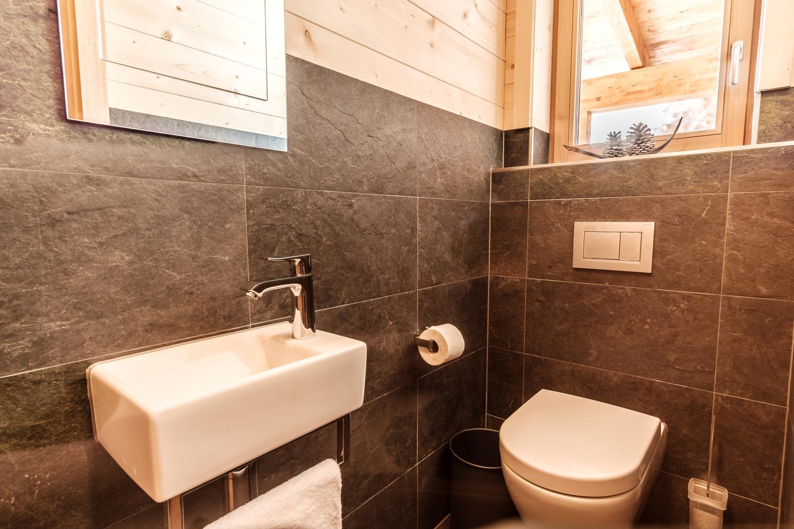 Die Chalets verfügen über 2 Bäder, jeweils mit offener Regendusche und hochwertiger Villeroy & Boch Ausstattung und ein separates Gäste-WC. Sie haben die Wahl: machen Sie erst einen Saunagang und kühlen sich dann im Schnee ab, oder möchten Sie doch zuerst den Hotpot auf der Terrasse einheizen und bei einem Glas Wein entspannen, während die Kinder in der Whirlpoolwanne ein Schaumbad nehmen? Oder möchten Sie lieber draußen den Außenkamin anheizen oder im Haus vor dem Kaminofen ein Buch lesen? Sie haben die Wahl und brauchen sich um nichts kümmern: Bettwäsche-, Handtücher und Endreinigung erledigen wir für Sie.