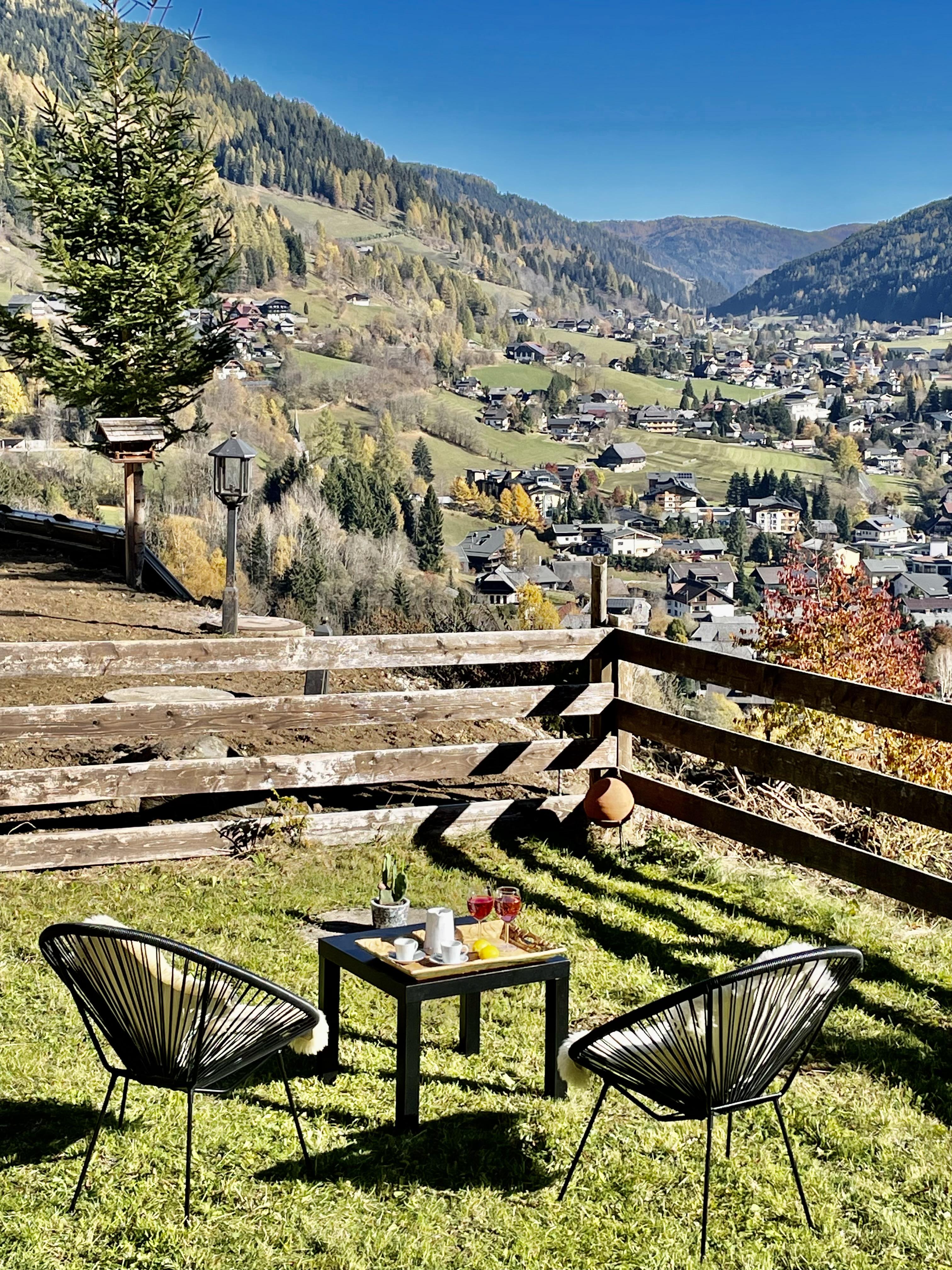 Wunderschöner Garten mit Tisch und Stühlen unter der Veranda mit Blick auf die Berge und das Tal.