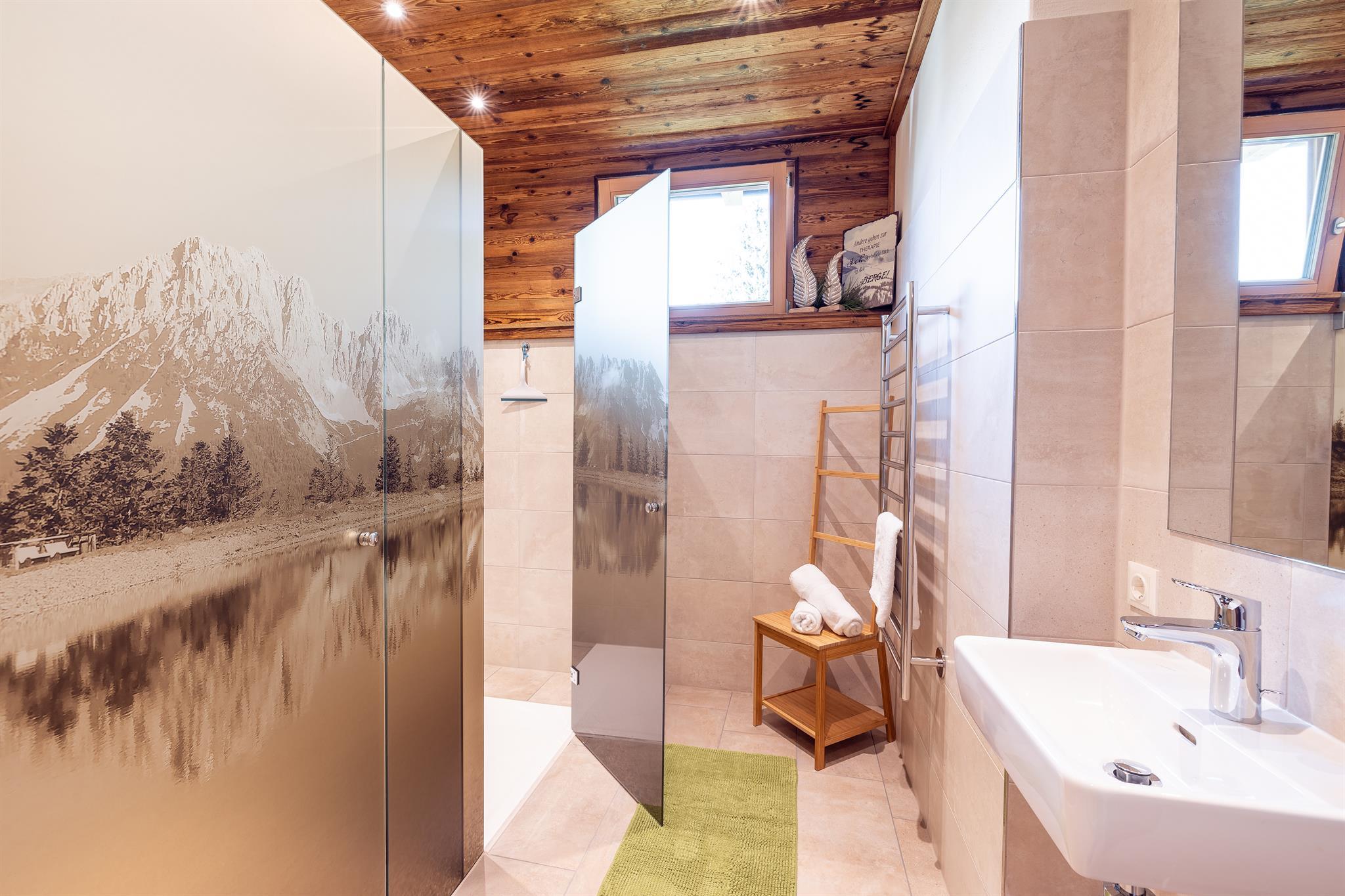 - 1 Badezimmer mit 2 Duschen, Waschbecken und Handtuchheizkörper