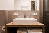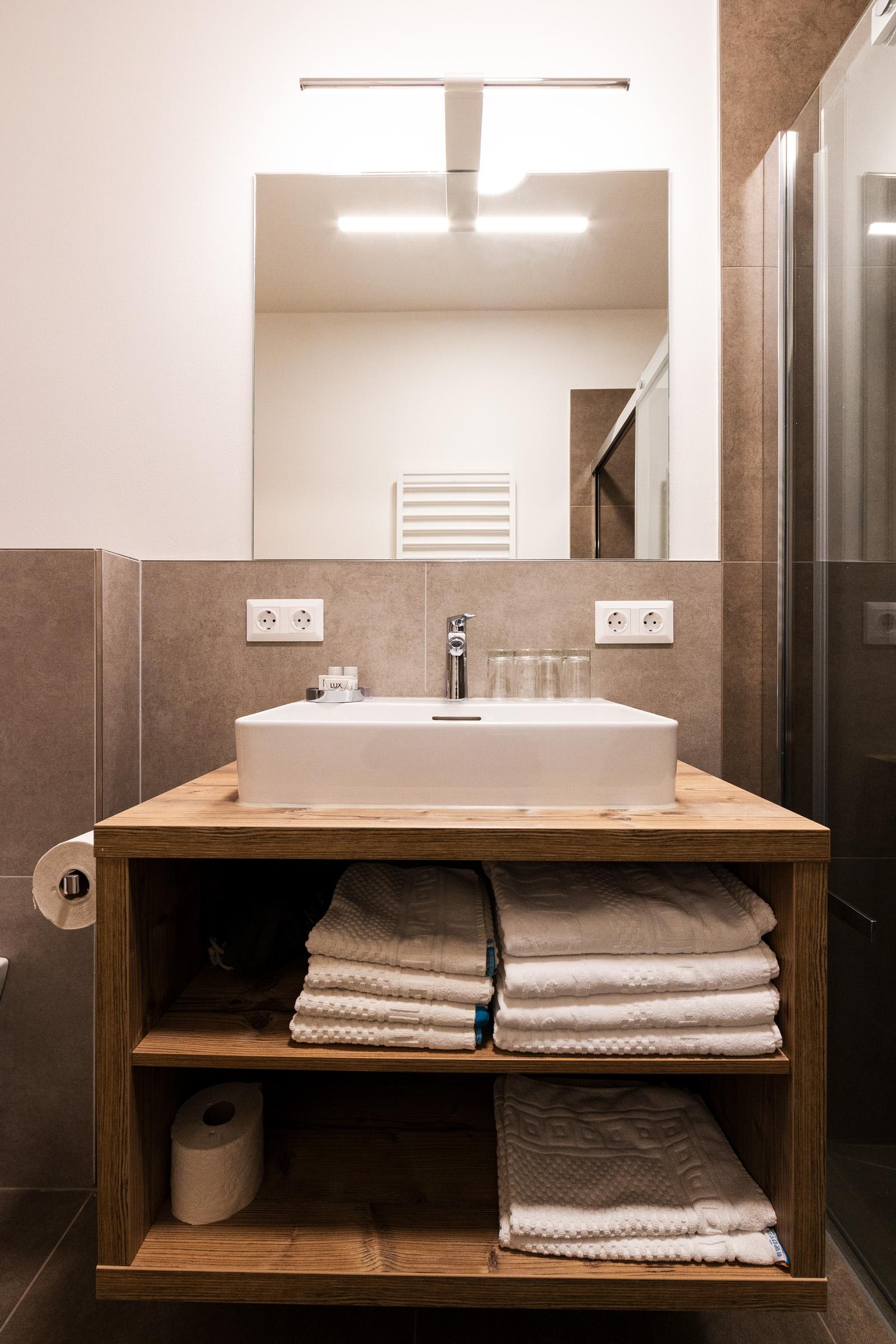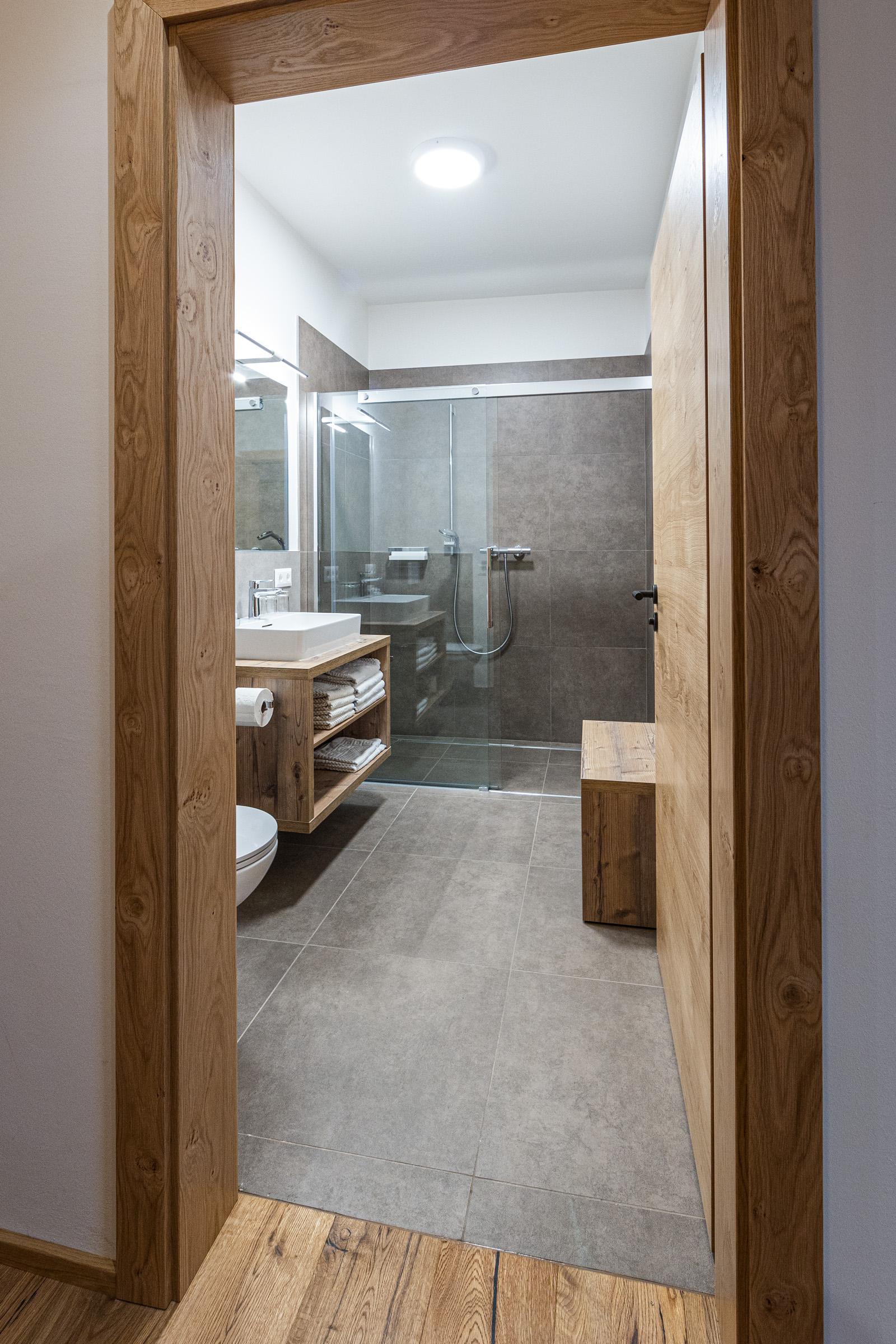 Das moderne und großzügige Badezimmer ist mit Dusche, Waschtisch, Haartrockner und WC ausgestattet.