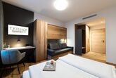 Unser modernes Stil-Mehrbettzimmer ist klimatisiert und verfügt zusätzlich zur klassischen Ausstattung wie Doppelbett, Schreibtisch, Sat-TV, W-Lan, Couch und der hochwertigen Möblierung auch über ein zusätzliches Kinderschlafzimmer mit eigenem Schrank und Stockbett, sodass ausreichend Platz für Ihre Familie geboten ist.