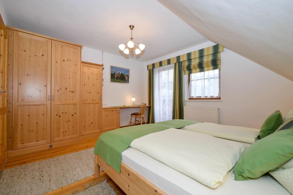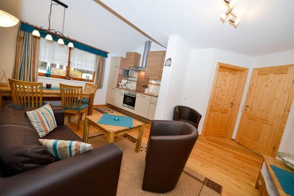 Die Ferienwohnung Dorfblick ist nach Westen ausgerichtet und besteht aus einem Doppelzimmer mit Balkon, einem weiteren Doppelzimmer mit Zustellbett für Kleinkinder, Wohnküche mit Küchenzeile, Esstisch, Couch und TV, einem WC und einem Duschbad mit Fenster. Außerdem gibt es eine Waschmaschine, Handtuchtrockner, Kosmetikspiegel und Föhn. Auf Wunsch steht WLAN zur Verfügung.