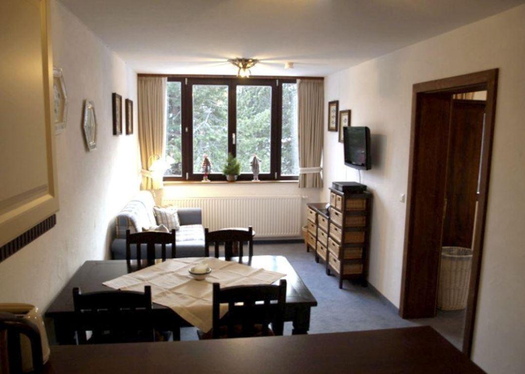 Wenn Sie die Wohnung betreten, stehen Sie im Vorraum mit der Garderobe. Von dort gelangen Sie zum WC, zum Badezimmer mit Dusche und zum Wohnbereich. Dieser ist eingerichtet mit einer gemütlichen Sitzcouch (ausziehbar auf Betthöhe für 2 Personen), SAT-TV, Radio mit CD und ein großes Panoramafenster mit einem herrlichen Ausblick auf die Berglandschaft. Neben der Sitzecke ist der Essbereich und eine offene, komplett eingerichtete Küche (Geschirrspüler, E-Herd mit Backrohr, Kühlschrank mit Gefrierfach, Mikrowelle, NESPRESSO Kaffeemaschine, Filter-Kaffeemaschine, Wasserkocher, Toaster, diverse Küchengeräte und ausreichend Geschirr). Vom Wohnbereich kommen Sie außerdem zum großzügigen Schlafzimmer (Doppelbett), von wo Sie zum südseitigen Balkon (mit Sonnenliegen und Sitzgelegenheit) kommen. Vom Bett erleben Sie einen außergewöhnlichen Ausblick!