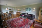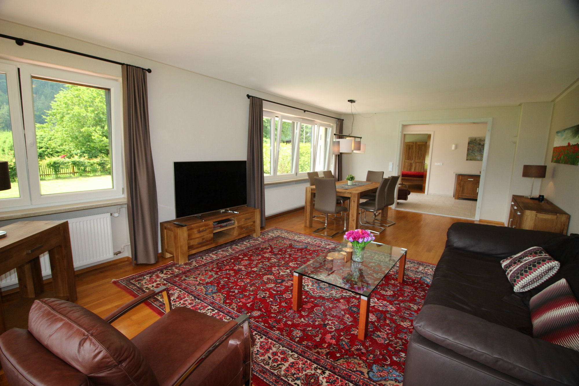 Großes Wohnzimmer mit Ledercouch, Leder-Drehsessel, elegante Essgruppe für 6 Personen, Orientteppich, großer Flatscreen-SAT TV, Kommode, Sideboard, Panoramafenster.
