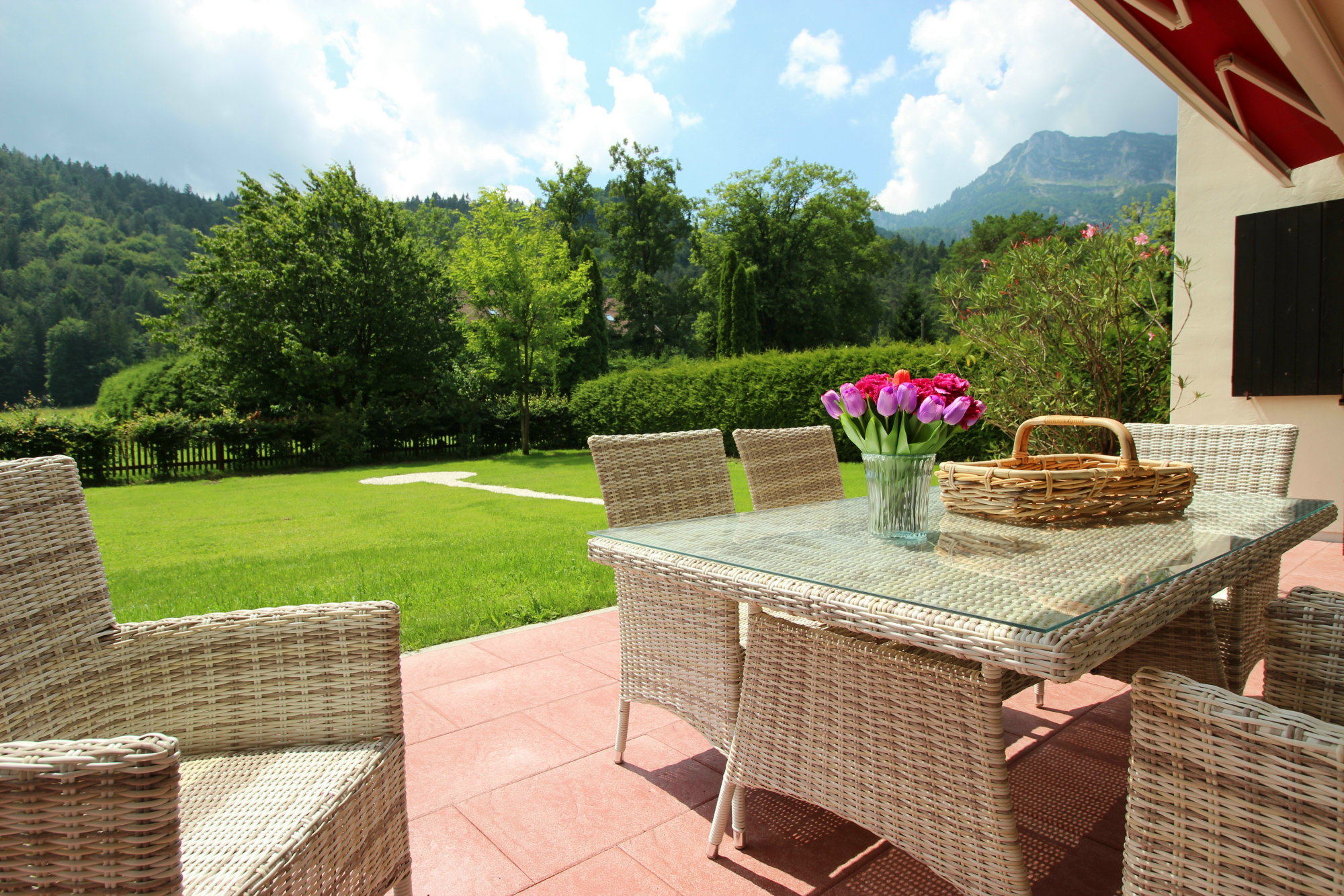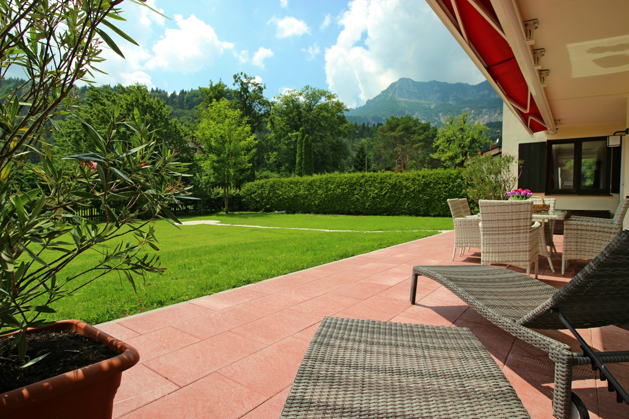 An die Ferienwohnung schließt sich eine große Terrasse an, mit hochwertigen Gartenliegen und Essgruppe. Die gesamte Terrasse ist von einer sehr breiten und langen Markise (elektrisch ausfahrbar) überdacht, so dass man angenehm im Schatten sitzen, essen oder auf den Liegen relaxen kann.