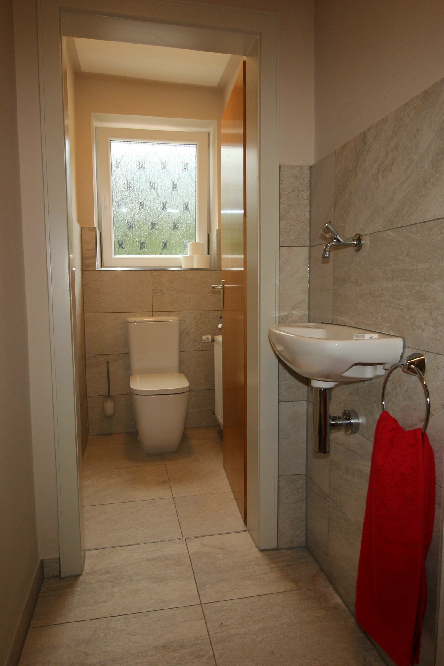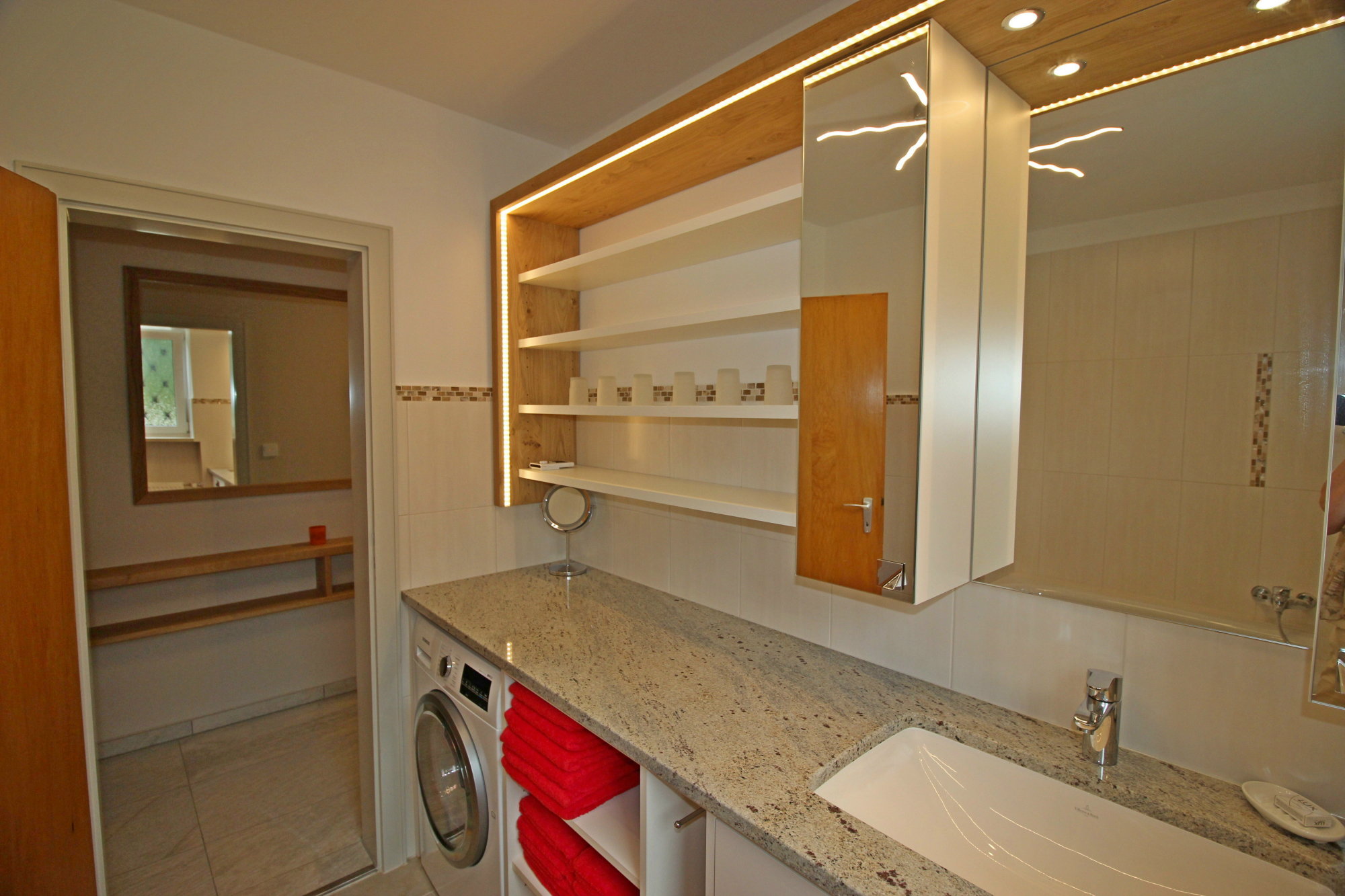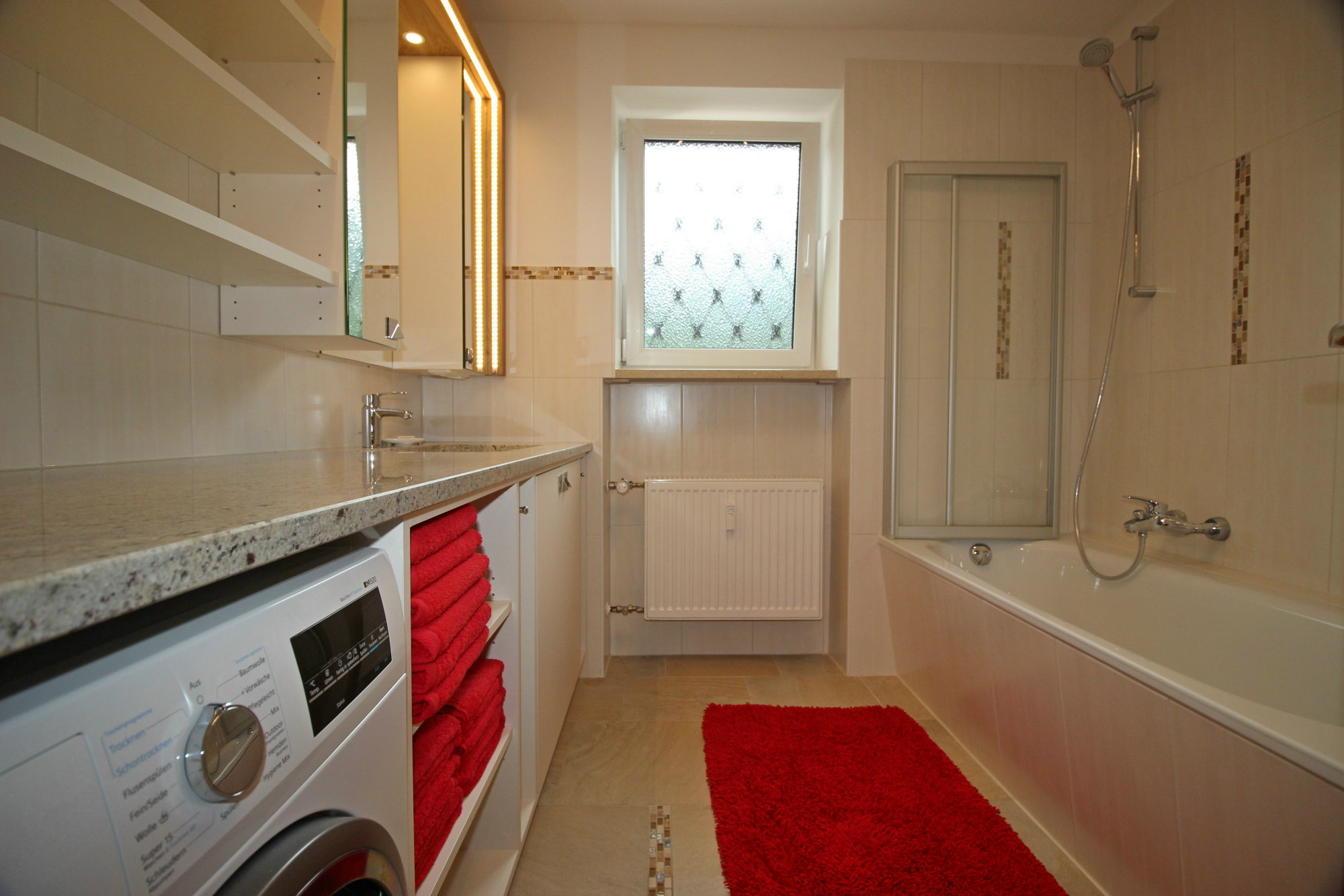 Bad mit hochwertiger Badewanne/Dusche, Waschmaschine/Trockner zur kostenlosen uneingeschränkten Nutzung, Waschtisch, Schränke mit sehr viel Stauraum, separate Toilette mit Handwaschbecken.