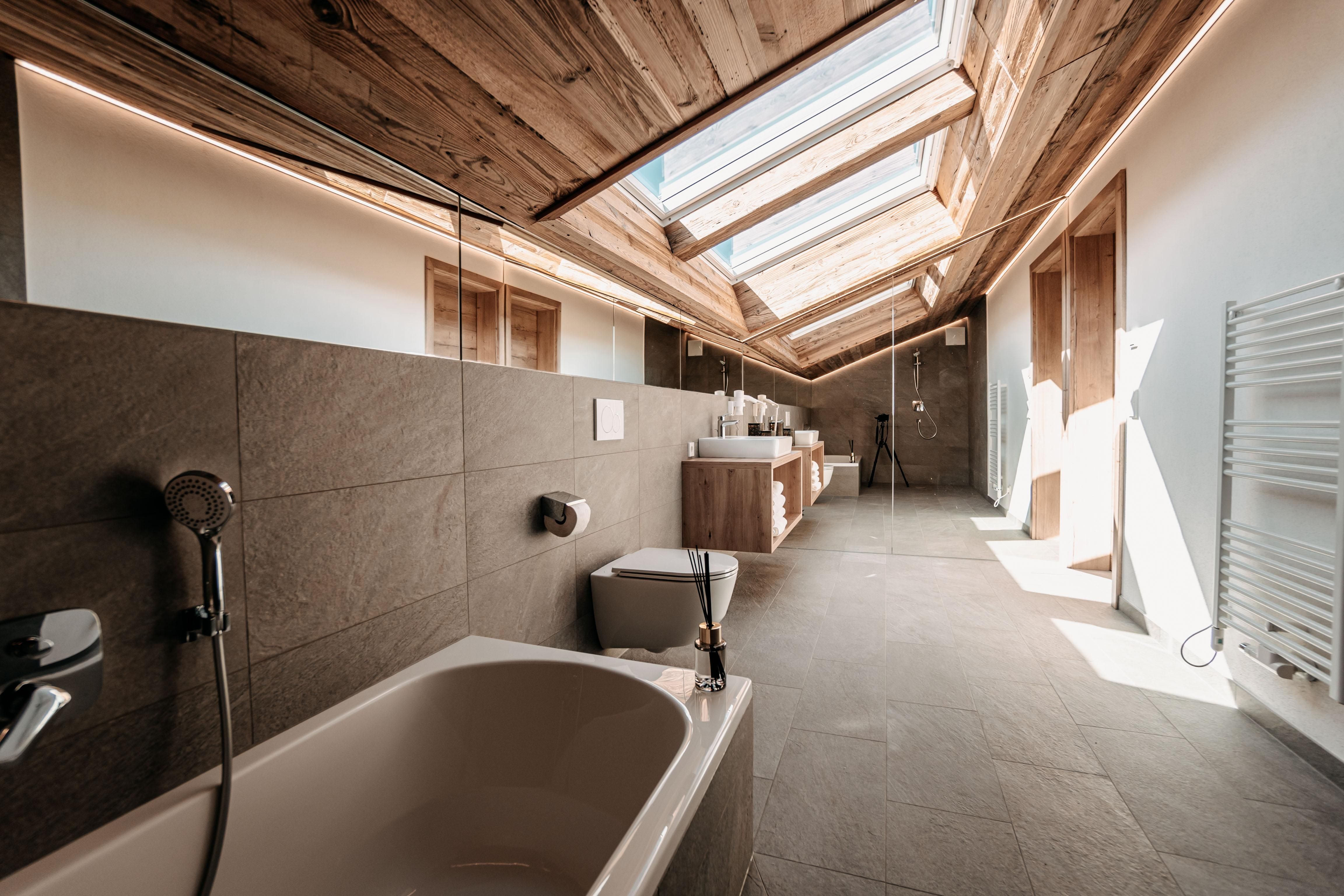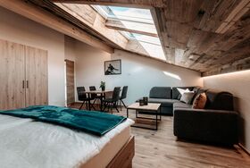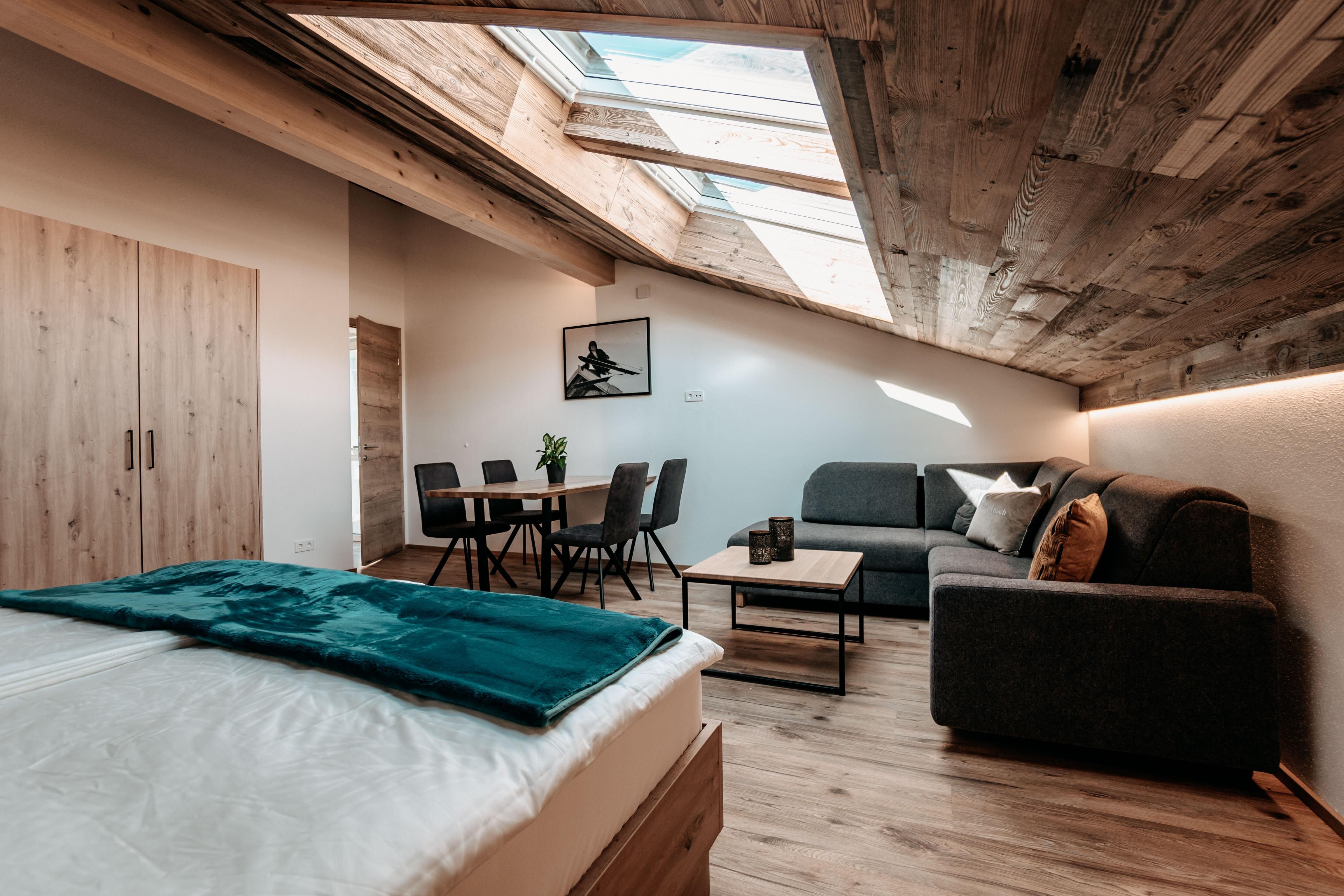 Das Apartment Roßbrand liegt im Dachgeschoss und bietet dir auf 40 m2 2 bis zu 4 Betten und ein großes Bad mit viel Holz.