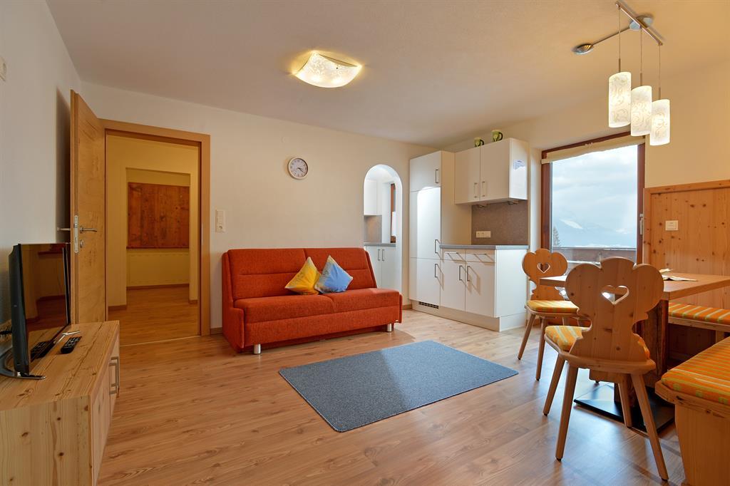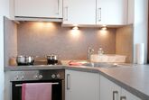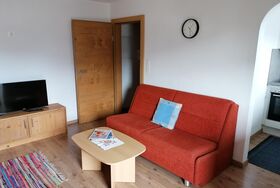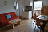 2-Zimmer-Wohnung, 1. Etage, ca. 50 m². Diele. Wohn-/Schlafraum mit Doppelbettcouch, Essecke und Balkonausgang. Kochnische (4 Ceranfelder, Backofen, Kaffeemaschine, Wasserkocher), zum Wohnraum offen. Doppelzimmer. Dusche/WC.