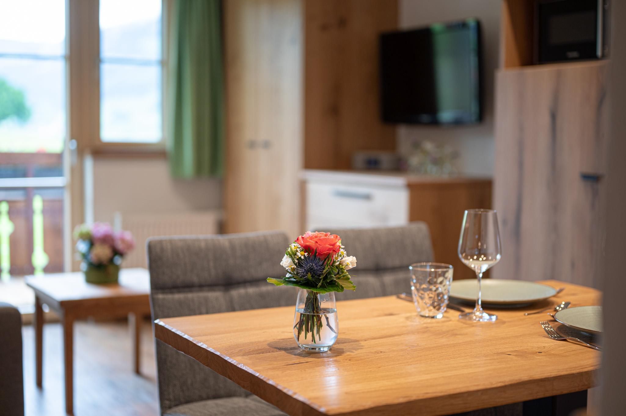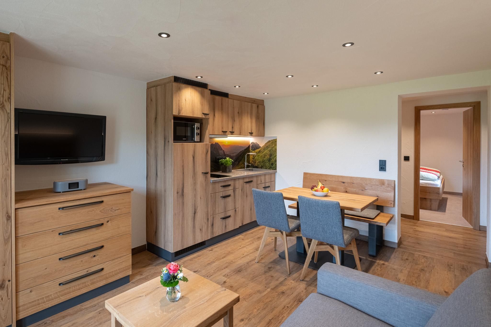 Ferienwohnung Sonnenkopf eignet sich ideal für Familien mit bis zu 2 Kindern oder Ruhesuchenden, die gerne ein wenig mehr Platz möchten. Das getrennte Schlafzimmer und die großzügig, ausklappbare Schlafouch im Wohnbereich bieten eine Heimat für 1-4 Personen. Balkon mit Morgensonne inklusive.