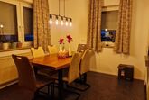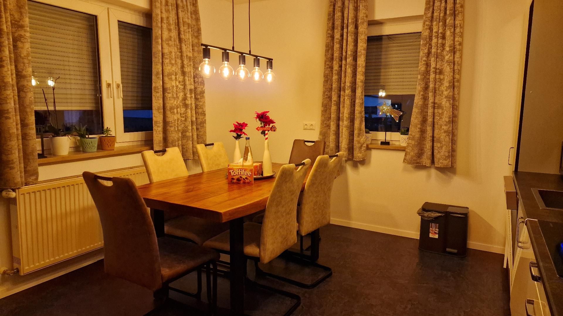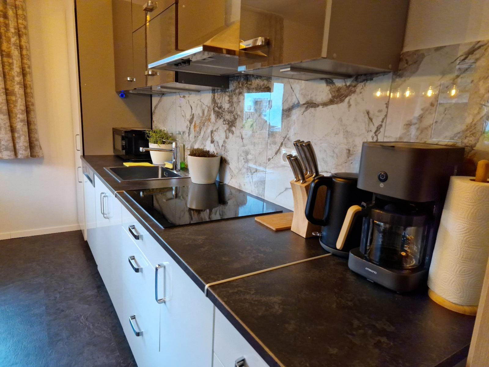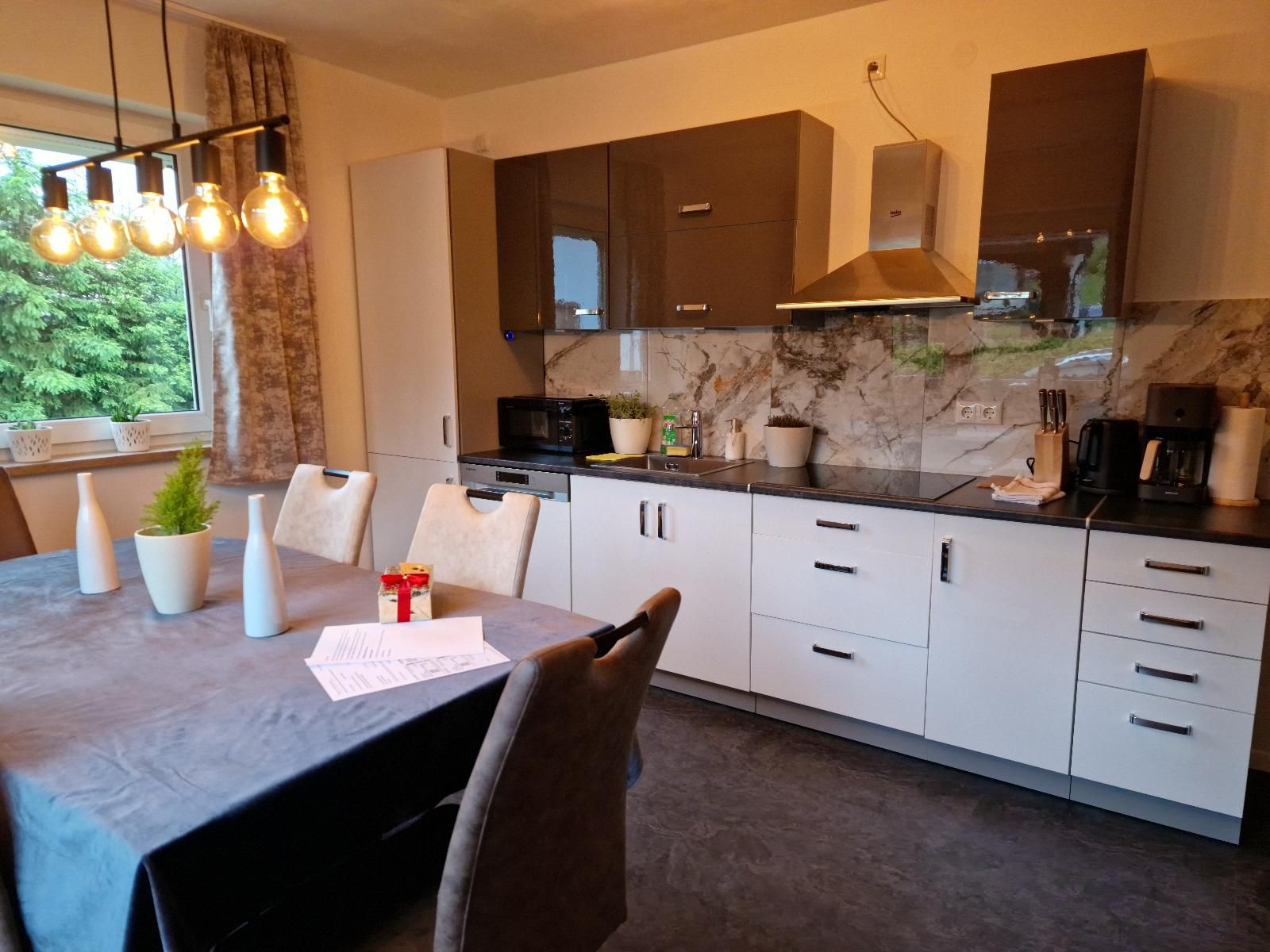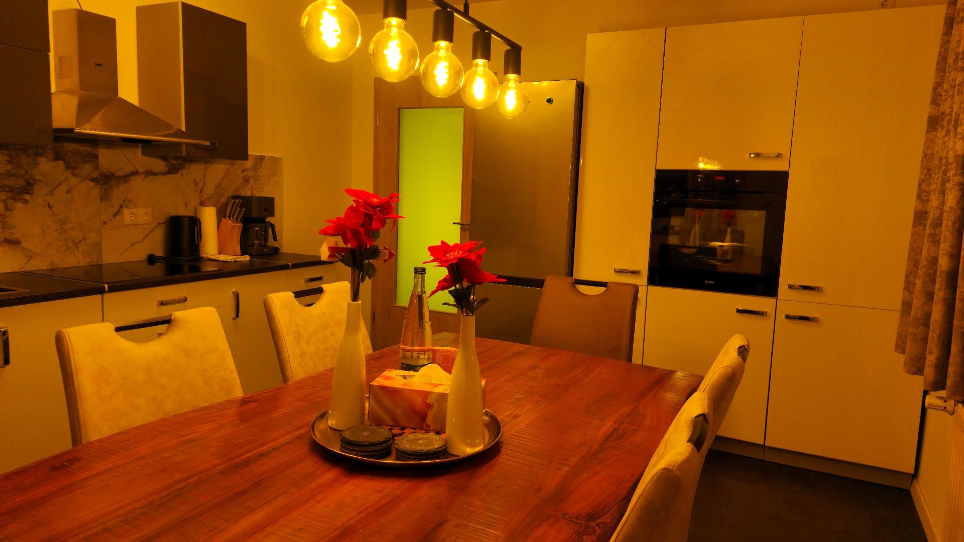 Die voll ausgestattete Küche lädt zum Kochen ein und verfügt über einen Kühlschrank, eine Mikrowelle, einen Induktionskochfeld und einen Grillofen. Ein großer Esstisch bietet Platz für gemeinsame Mahlzeiten und gesellige Abende.