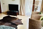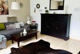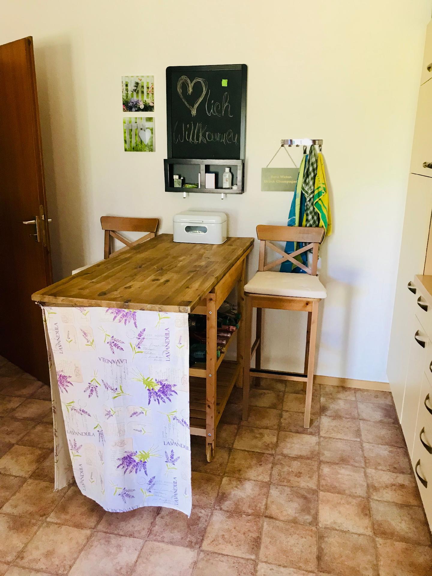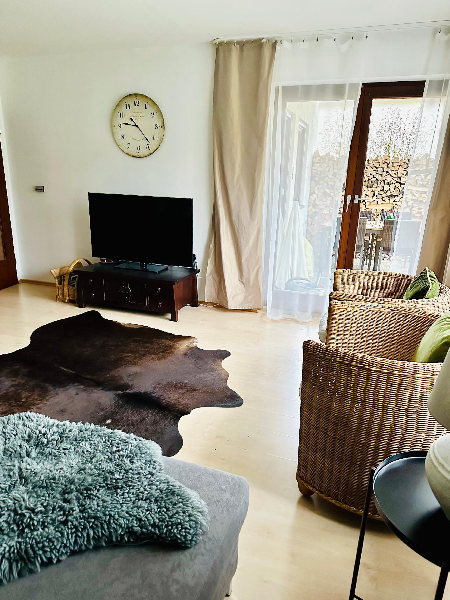 Die Ferienwohnung, etwa 80 m² groß, besteht aus folgenden Zimmern: Ein Wohnzimmer mit Flatscreen-Fernseher, großzügiger Couch und direktem Zugang zum Aussenbereich -Terrasse und Garten- ; eine vollausgestattete Küche mit Herd, Backofen, Mikrowelle, Kaffeemaschine, Kühl/Gefrierkombination und ebenfalls direktem Zugang zur Terrasse, sowie ein angrenzendes Bad mit Dusche, WC, Waschmaschine und Trockner; 1 Schlafzimmer mit 2 m Doppelbett und ein Gästezimmer mit 1,40 m Boxspringbett und direktem Zugang zum Balkon.