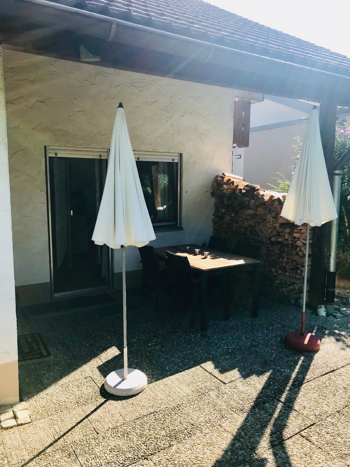 Die Terrasse bzw. der Garten ist nach Süden ausgerichtet. Die Terrasse ist überdacht und zusätzlich sind Sonnenschirme zur Beschattung vorhanden.
