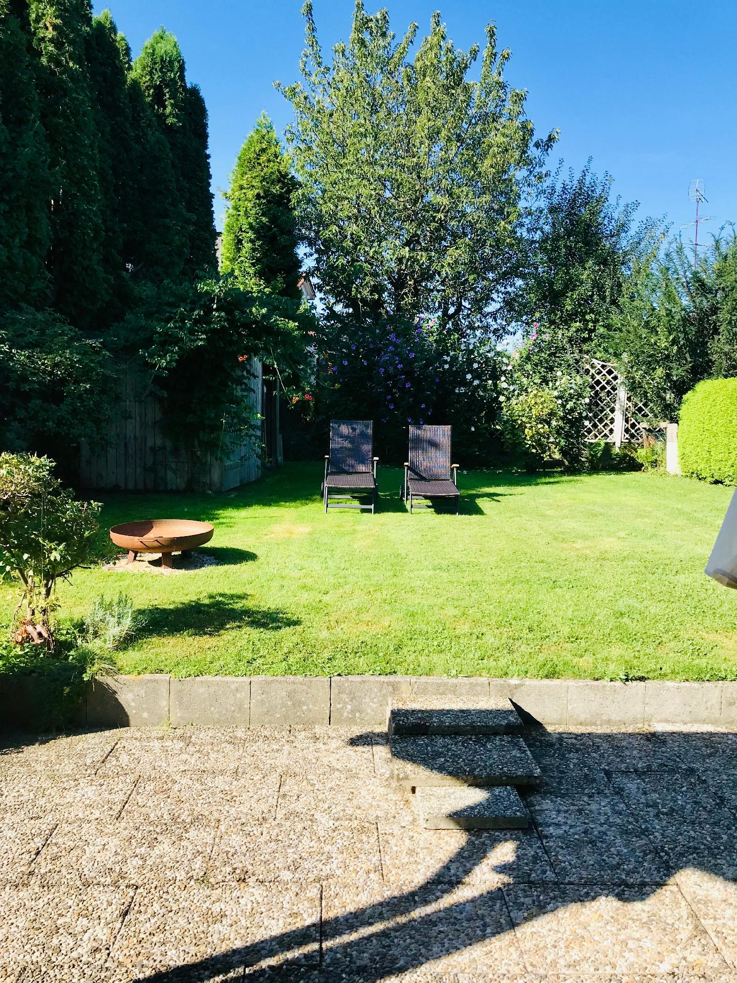 Die Terrasse ist mit Gartenmöbeln, Sonnenschirm und zwei Gartenliegen ausgestattet. Das Grundstück ist umzäunt und somit auch für Kinder und Hunde bestens geeignet.