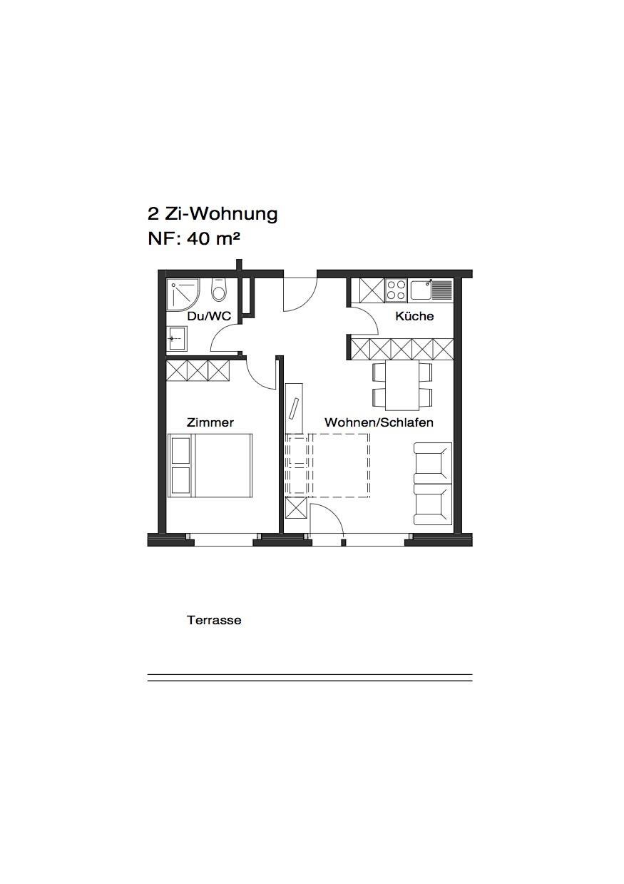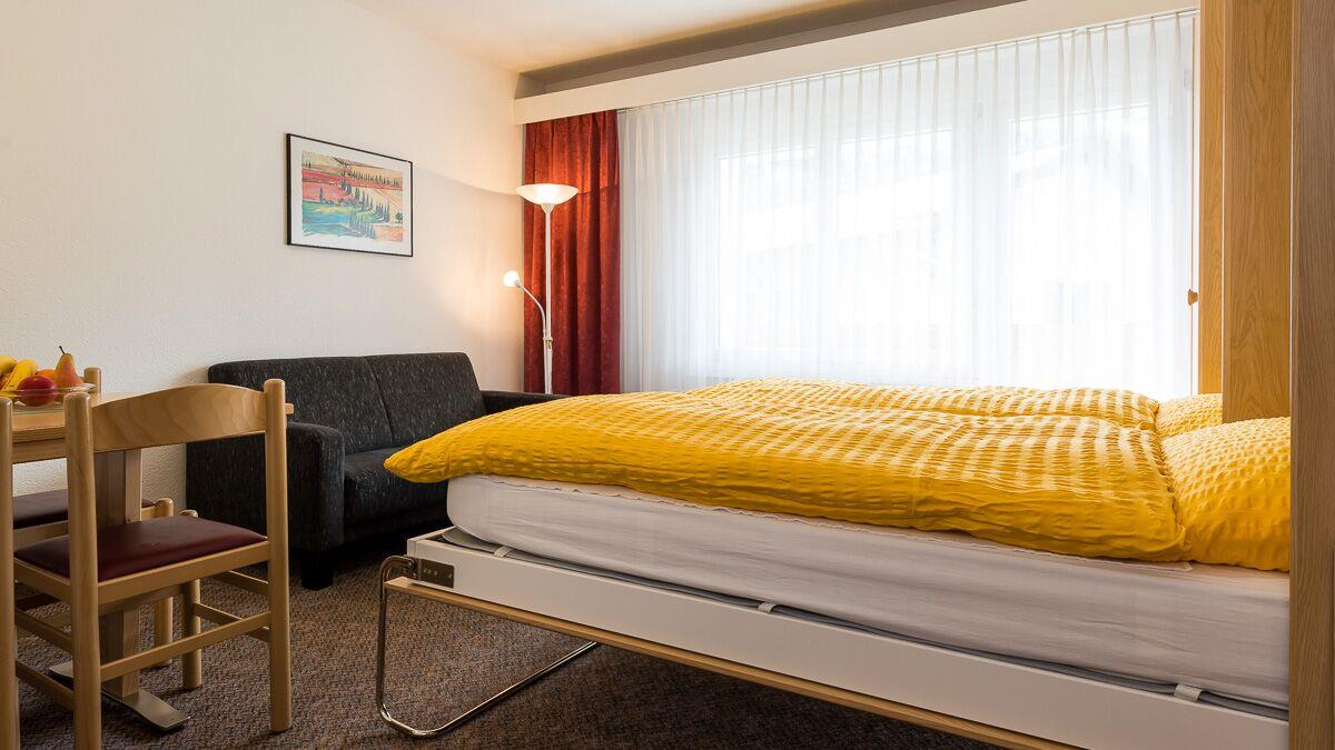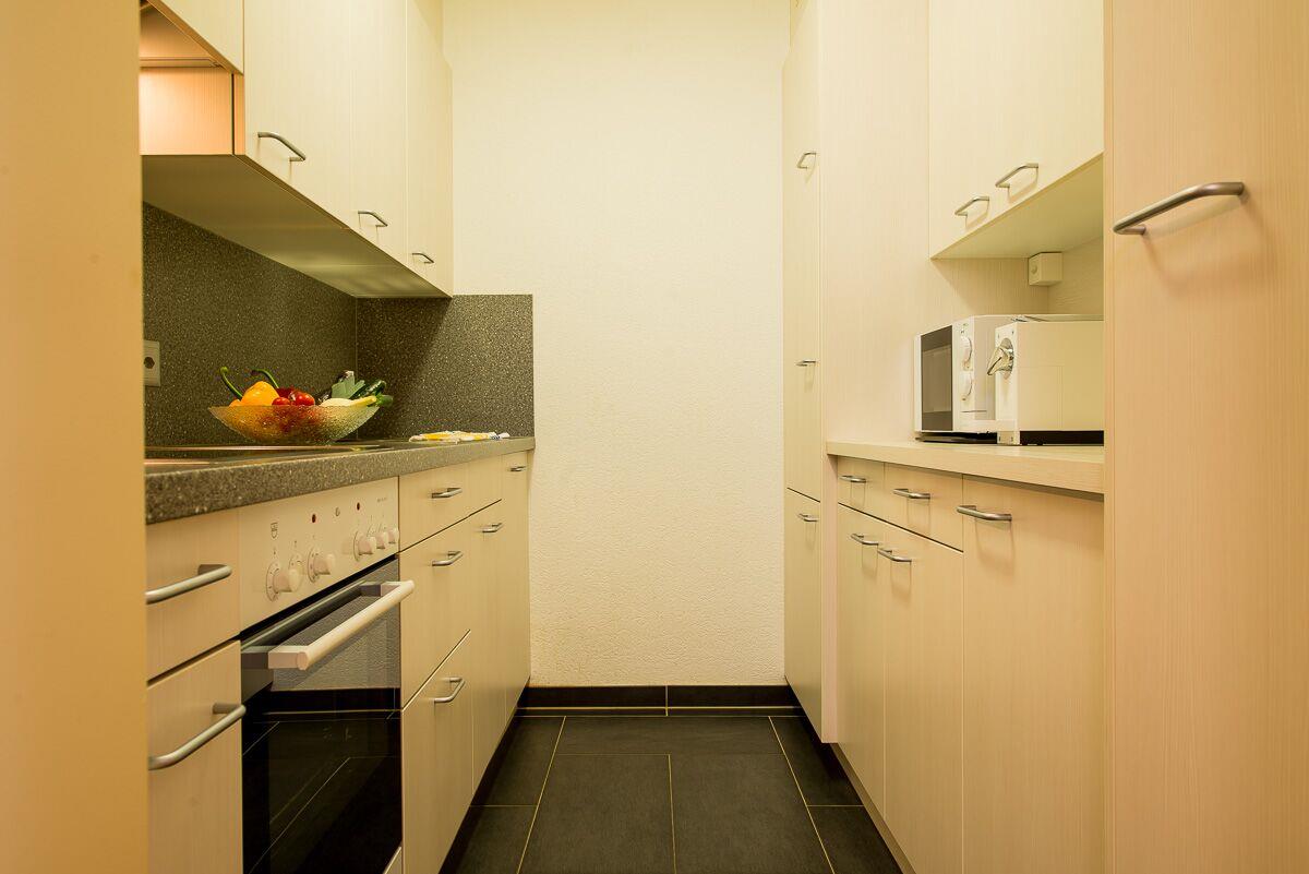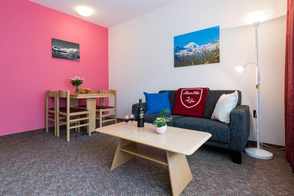 2 Zimmerwohnung (40m2) EG / Nichtraucherwohnung, für Familien und ruhige Personen. Haustiere sind nicht erlaubt. 1 Schlafzimmer mit 2 Betten, Wohnzimmer mit 2 Schrankbetten, Sofaecke, separate Küche mit 4 Kochplatten, Backofen, Geschirrspüler, Kühlschrank, Mikrowelle, Kapselkaffeemaschine und Wasserkocher, Dusche/WC, Haarföhn und Südterrasse. Die Wohnung ist ausgestattet mit Kabel-TV, Radio mit CD Player und kostenlosem ADSL Wireless LAN Internetzugang. Die Wohnung ist gemütlich, modern und zweckmässig eingerichtet. Das Haus liegt im Zentrum und ist trotzdem ruhig und sehr sonnig gelegen, mit freier Sicht auf die faszinierende Bergwelt. In nächster Nähe der Einkaufsläden. 5 Min. zu den Skiliften und Bergbahnen.