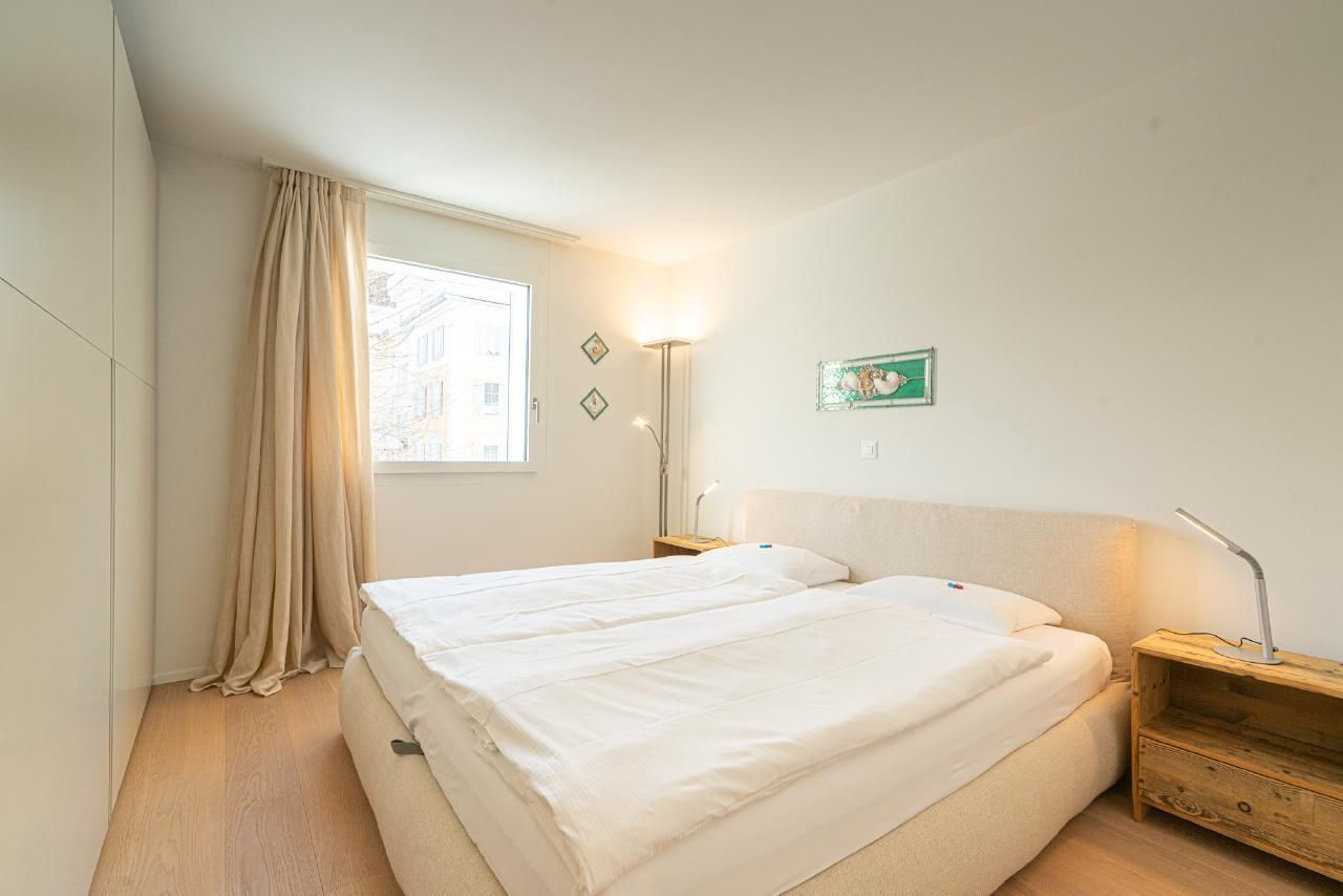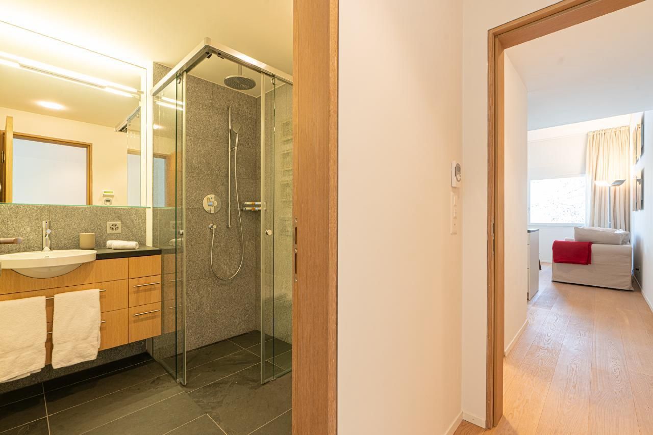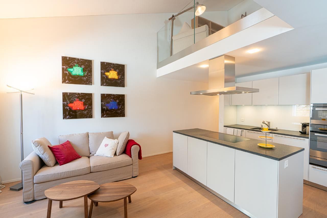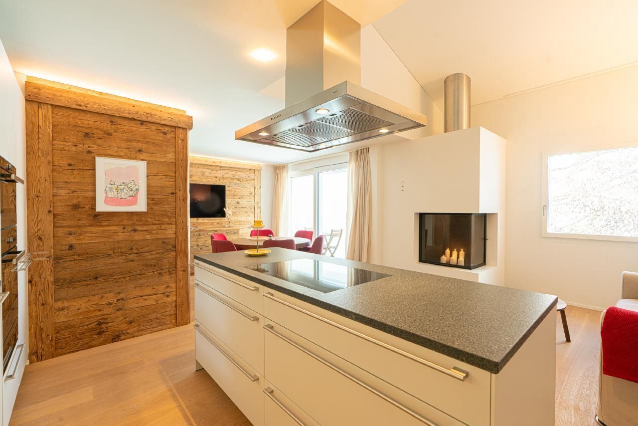 Die Wohnung verfügt über 2 Doppelschlafzimmer, 2 Badezimmer und ein separates WC. Die ganze Wohnung ist mit Parkett ausgestattet. Die Küche ist vollständig eingerichtet. Auf Wunsch sind Racletteofen und Fondueausstattung verfügbar. Die Wohnung ist sehr sonnig. Auf der Galerie gibt es einen Arbeitsplatz für unsere Gäste, die im Homeoffice arbeiten. Der Keller, wo sich auch die Waschmaschine und der Wäschetrockner befindet, bietet genügend Platz für Skier und Skischuhe mit Trockner, Fahrräder und dergleichen. Es gibt 2 reservierte Garagenplätze in der Tiefgarage.