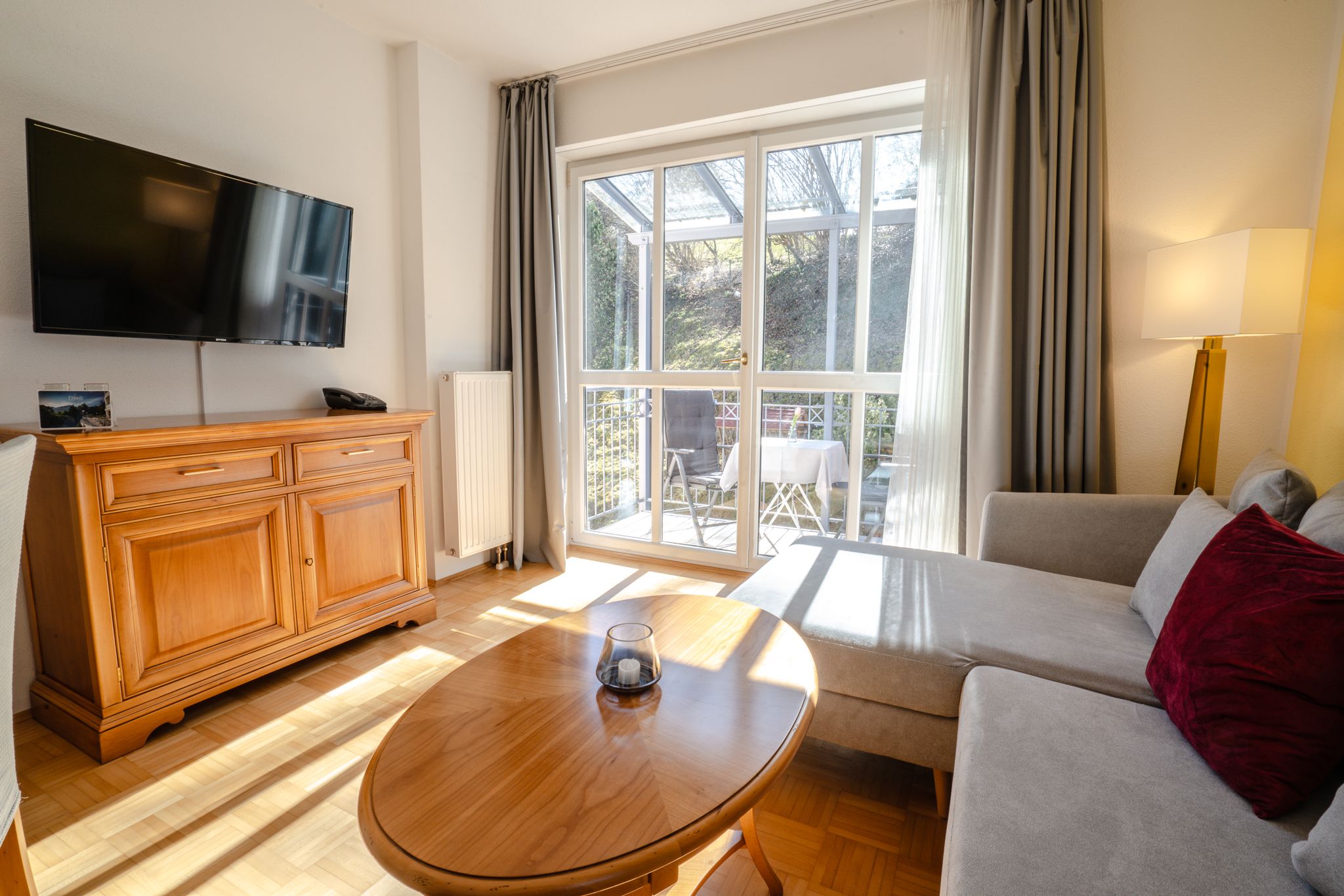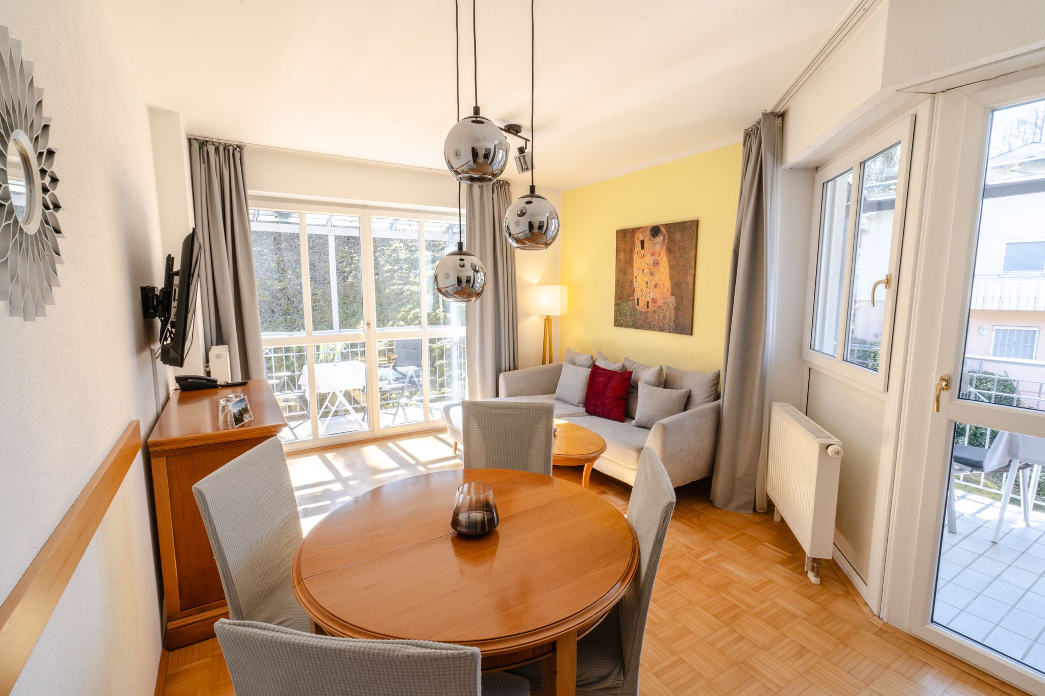 Unser schönes, gemütliches Appartement ist im klassisch- eleganten Stil eingerichtet. Die Wohnung befindet sich im 2. OG und verfügt über ein separates Schlafzimmer mit einem Doppelbett (Boxspringmatratzen - 1,80 x 2,00), ein Wohnzimmer mit Sofa und Essecke, eine voll ausgestattete Küche mit Geschirrspüler, sowie ein Bad mit Dusche/WC. Zur Wohnung gehören 2 Balkone, auf welchen Sie unter anderem auch auf unsere Alpenstadt mit Bergpanorama blicken können.