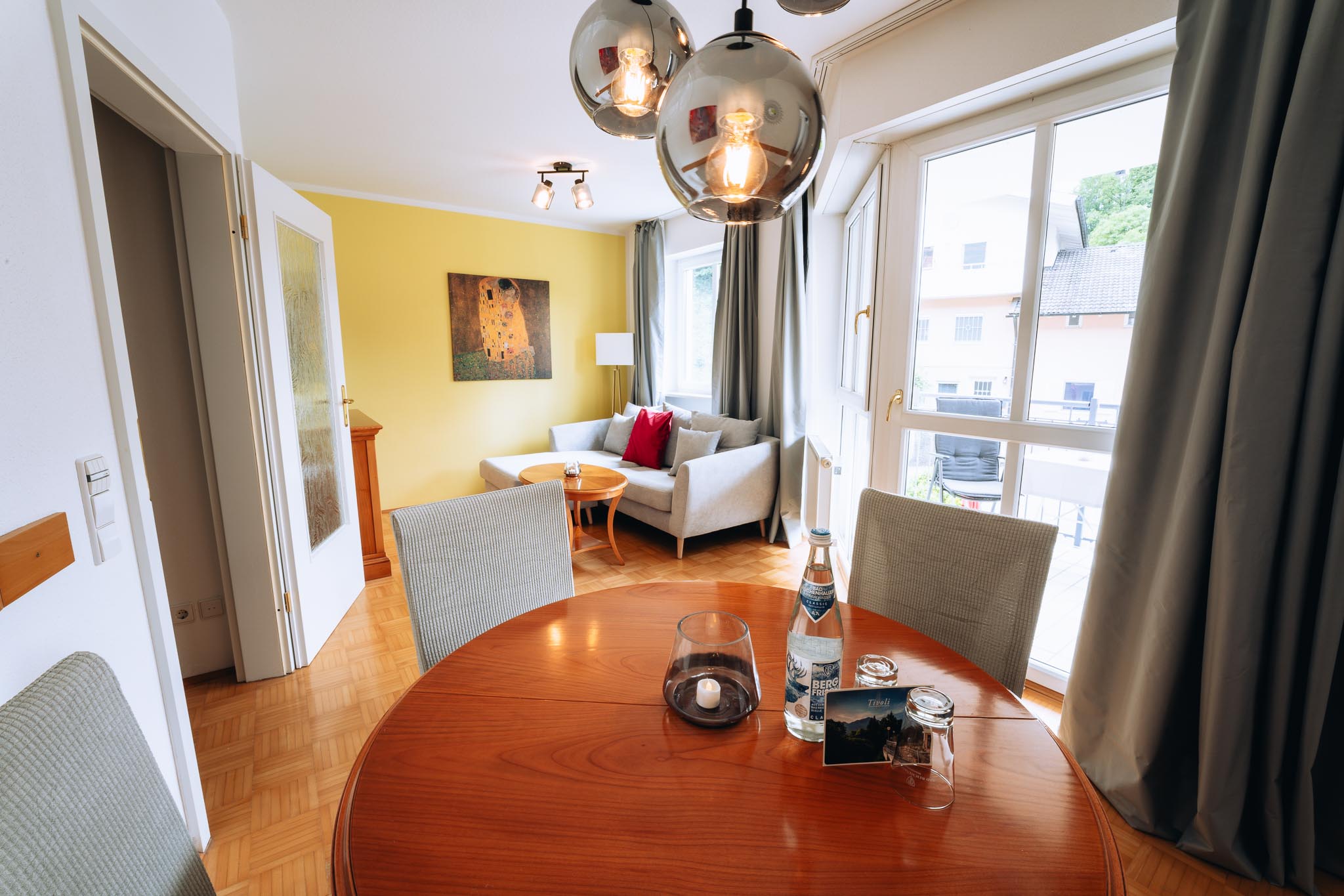 Unser schönes, gemütliches Appartement ist im klassisch- eleganten Stil eingerichtet. Die Wohnung befindet sich im 2. OG und verfügt über ein separates Schlafzimmer mit einem Doppelbett (180 cm x 200 cm - Boxspringmatratzen), ein Wohnzimmer mit Essecke, eine kleine Küchenzeile mit Geschirrspüler, sowie ein Bad mit Dusche/WC. Auf dem Balkon können Sie das herrliche Bergpanorama der Alpenstadt genießen!