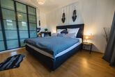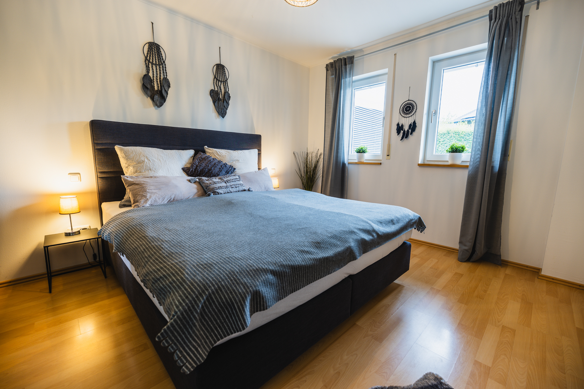Das separate Schlafzimmer hält ein gemütliches 180x200m Boxspring-Doppelbett und einen geräumigen Kleiderschrank bereit. Die Fenster lassen sich komplett verdunkeln. Falls ihr ein Kinderreisebettchen braucht, ist das kein Problem. Meldet euch gern bei uns.
