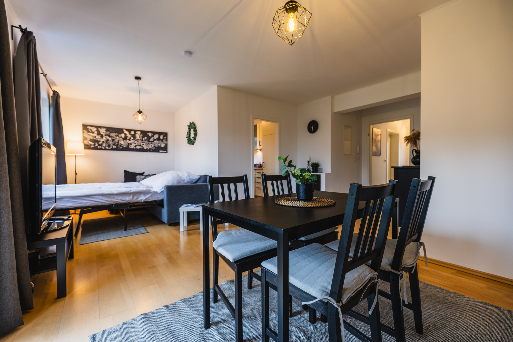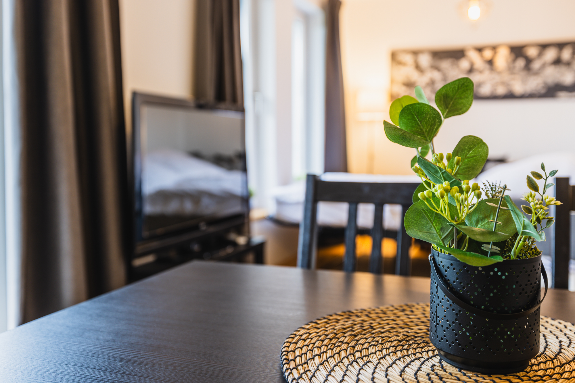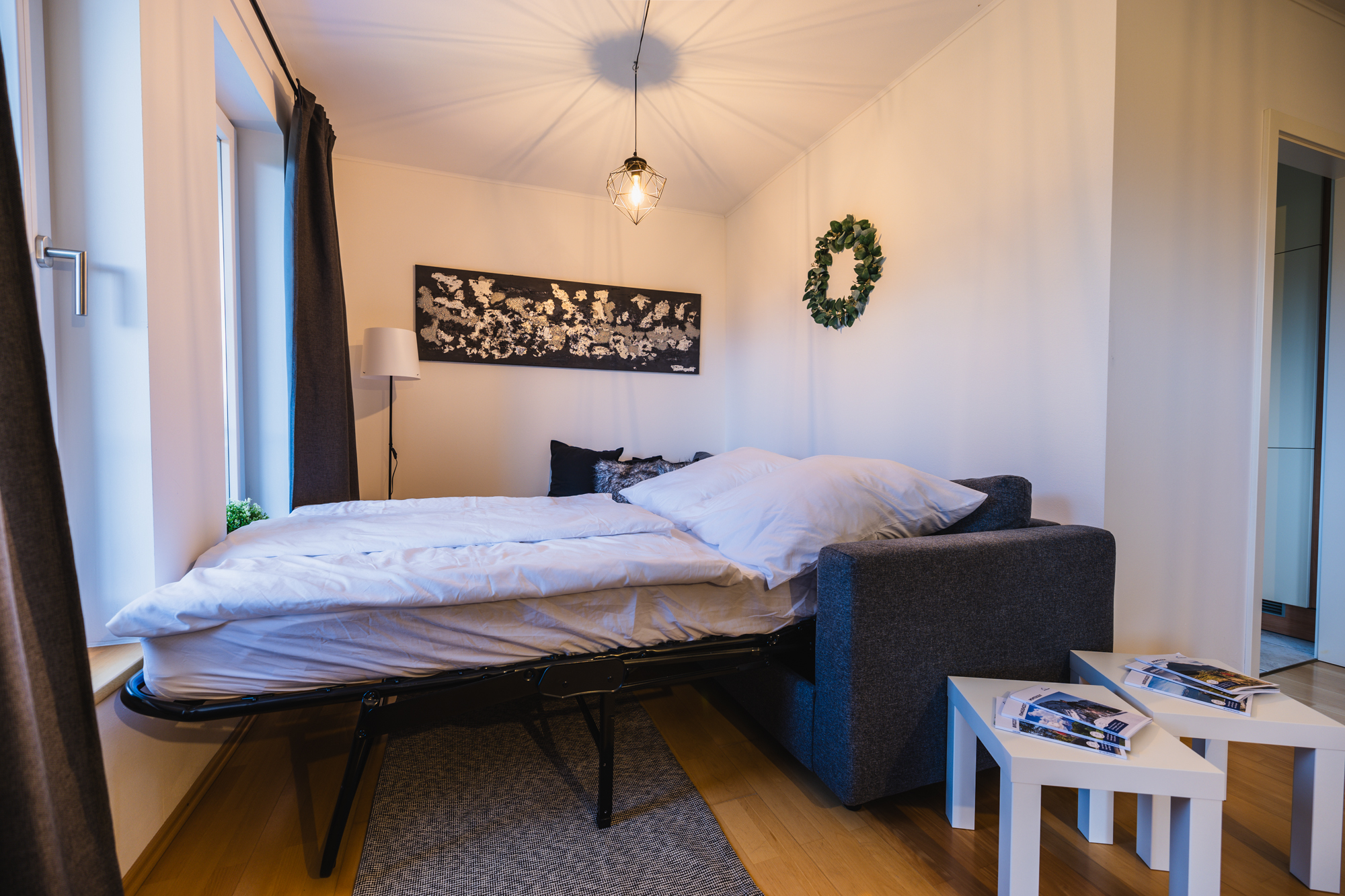 Im Wohn- und Essbereich findet ihr, eine gemütliche Couch, die zur Schlafcouch umfunktioniert werden kann, einen Fernseher, sowie ein paar Bücher und Prospekte mit Ausflugstipps und einige Spiele. Kostenfreies W-Lan ist selbstverständlich auch dabei.