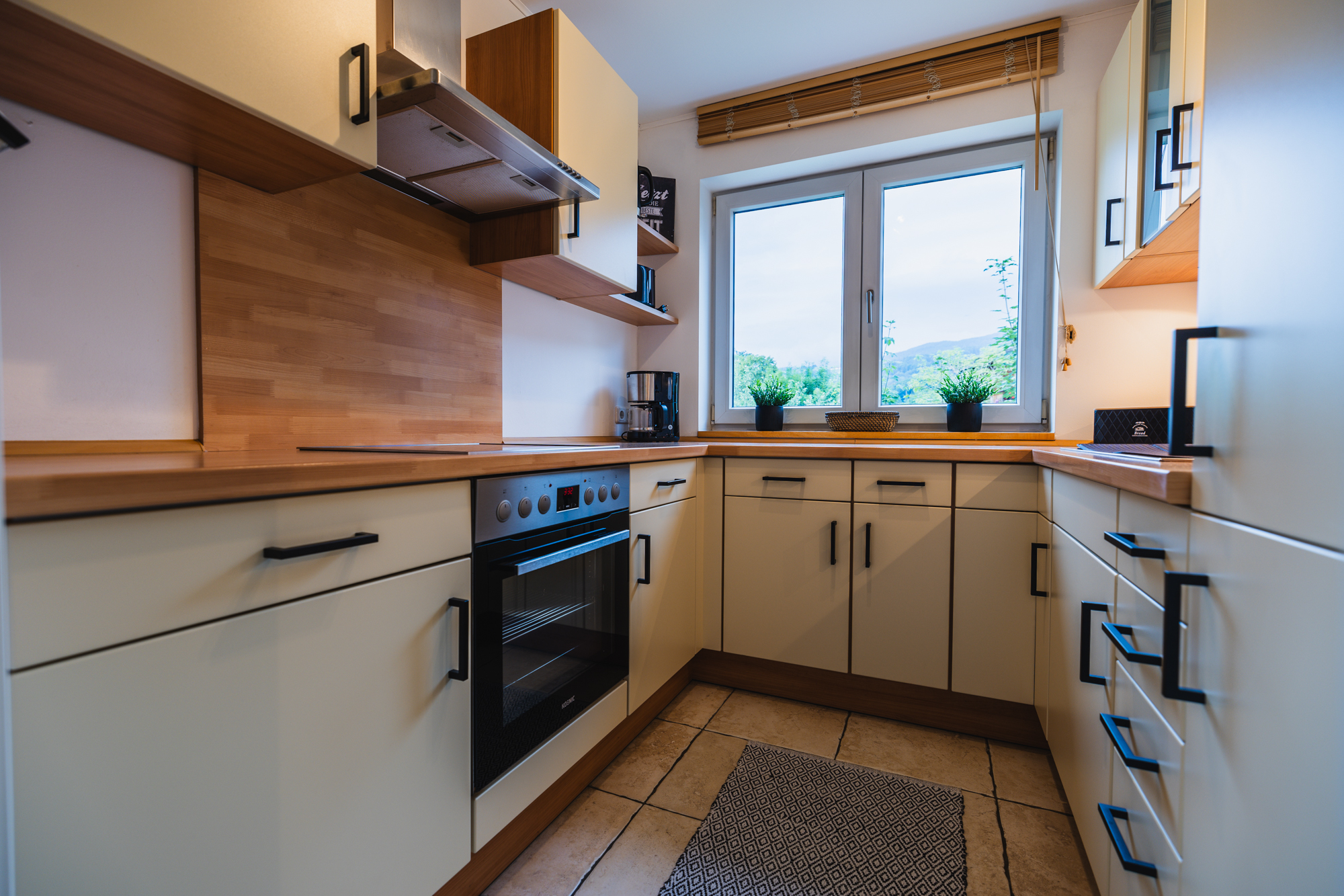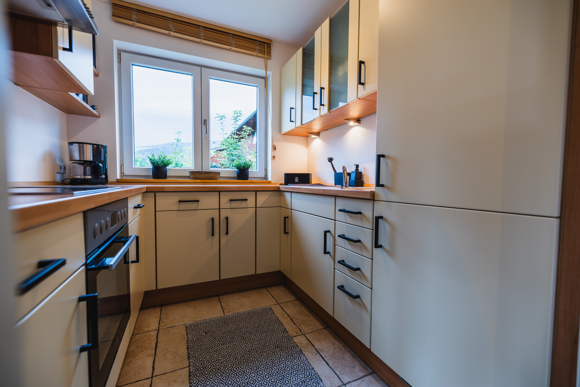Zum Kochen und Essenmachen ist alles Notwendige da. Kühlschrank, Herd mit Ceran-Kochfeld, Backofen gehören genauso zur Ausstattung der Küche wie eine Kaffeemaschine, Wasserkocher und ein Toaster.