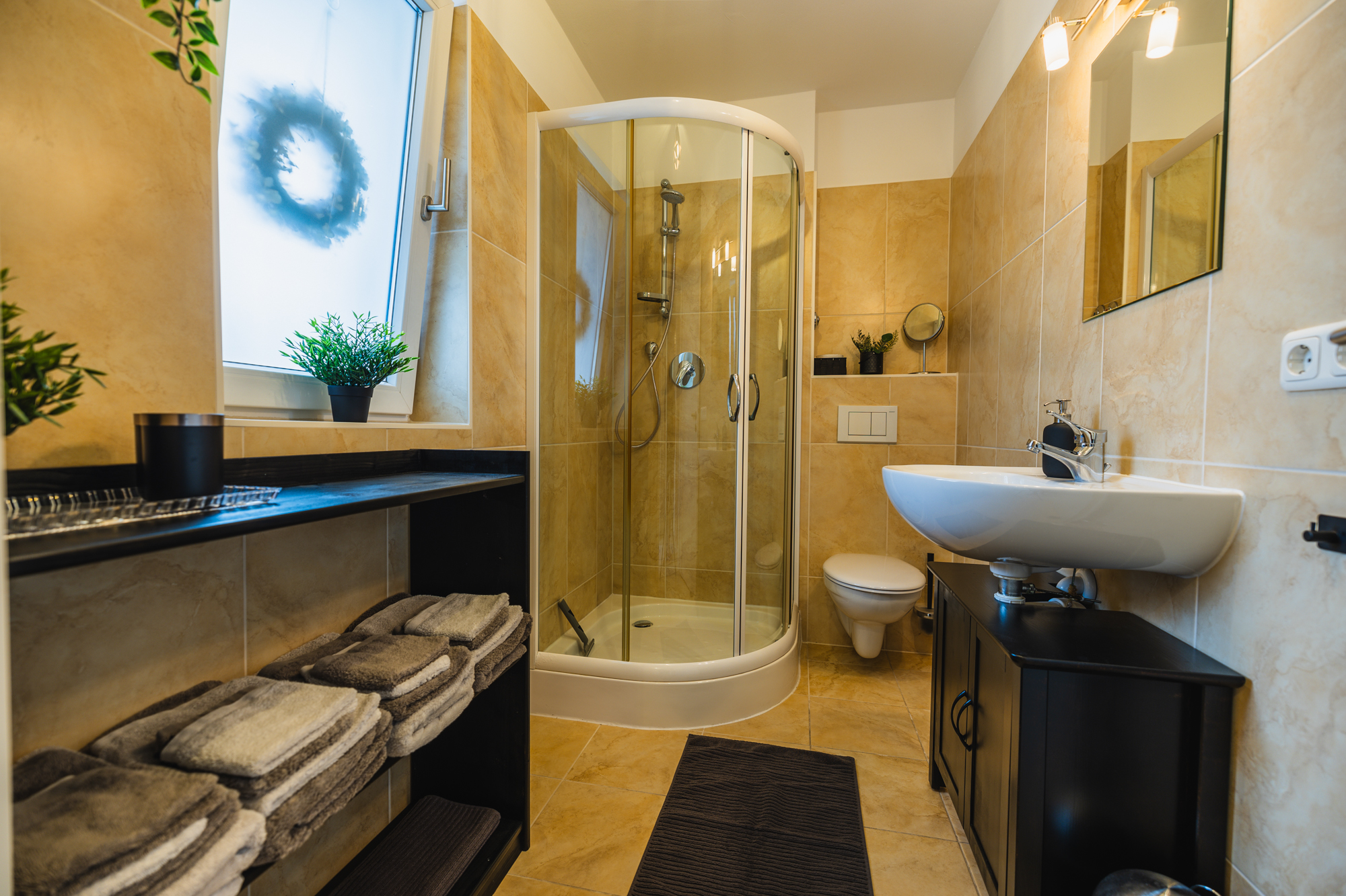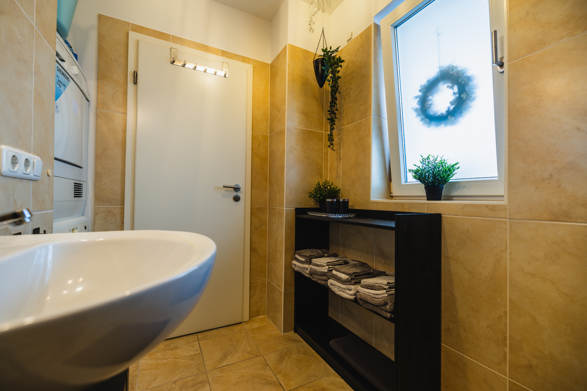 Das behagliche Badezimmer ist voll ausgestattet mit Dusche, Waschmaschine und Trockner. Handtücher zum duschen sind ebenfalls vorhanden.
