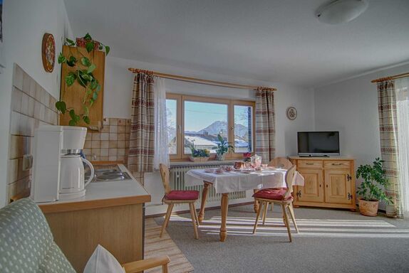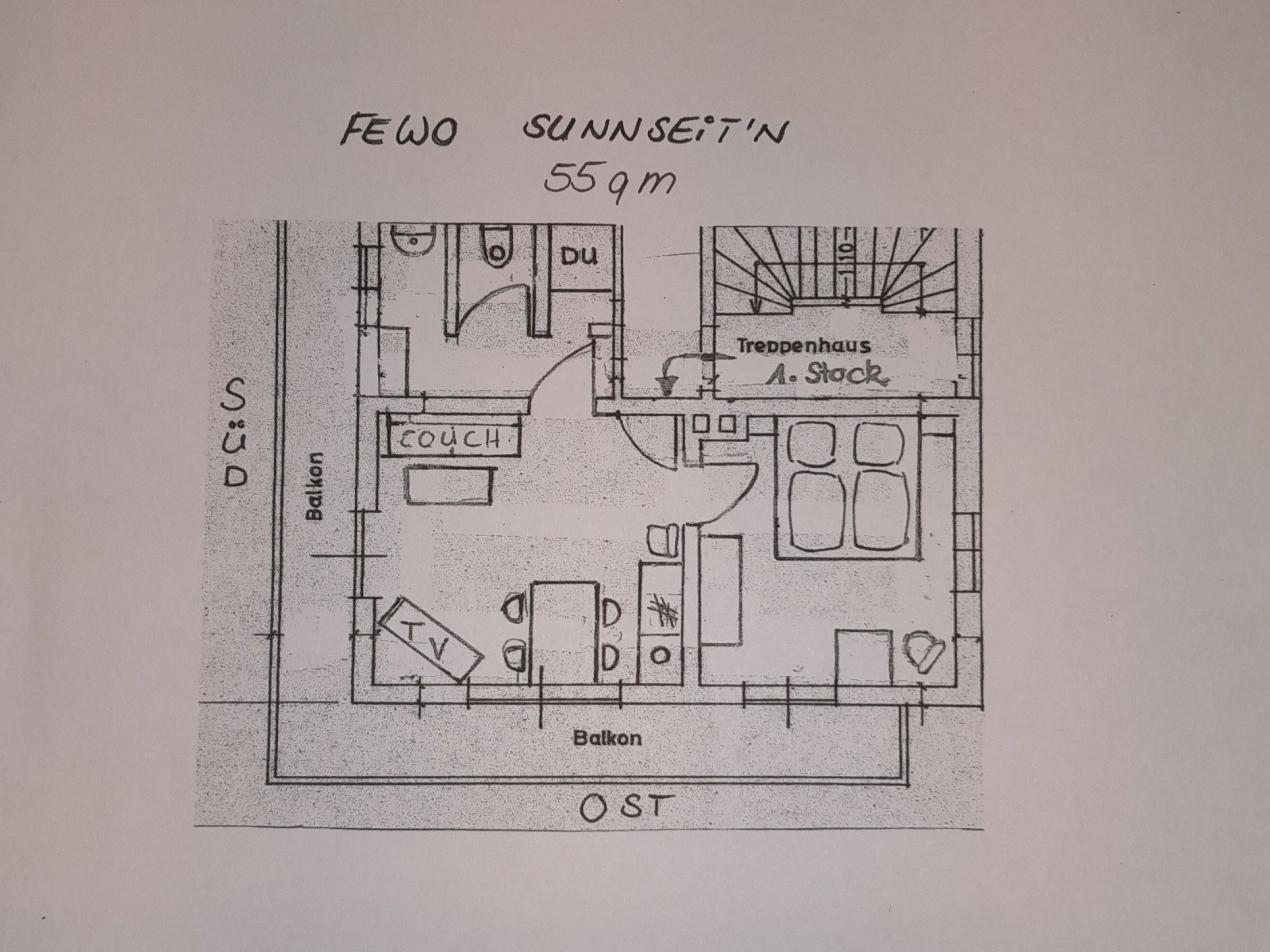 Unsere gemütliche Ferienwohnung „Sonnseit´n“ mit ca. 55 qm befindet sich in der ersten Etage.