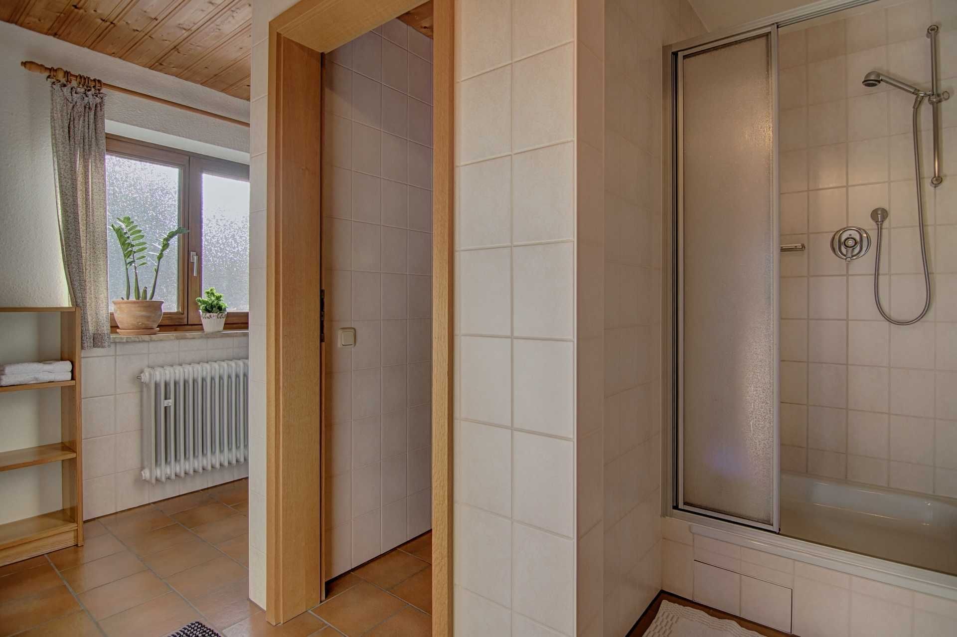 An die Wohnküche grenzt das Badezimmer mit WC, Dusche und Waschraum