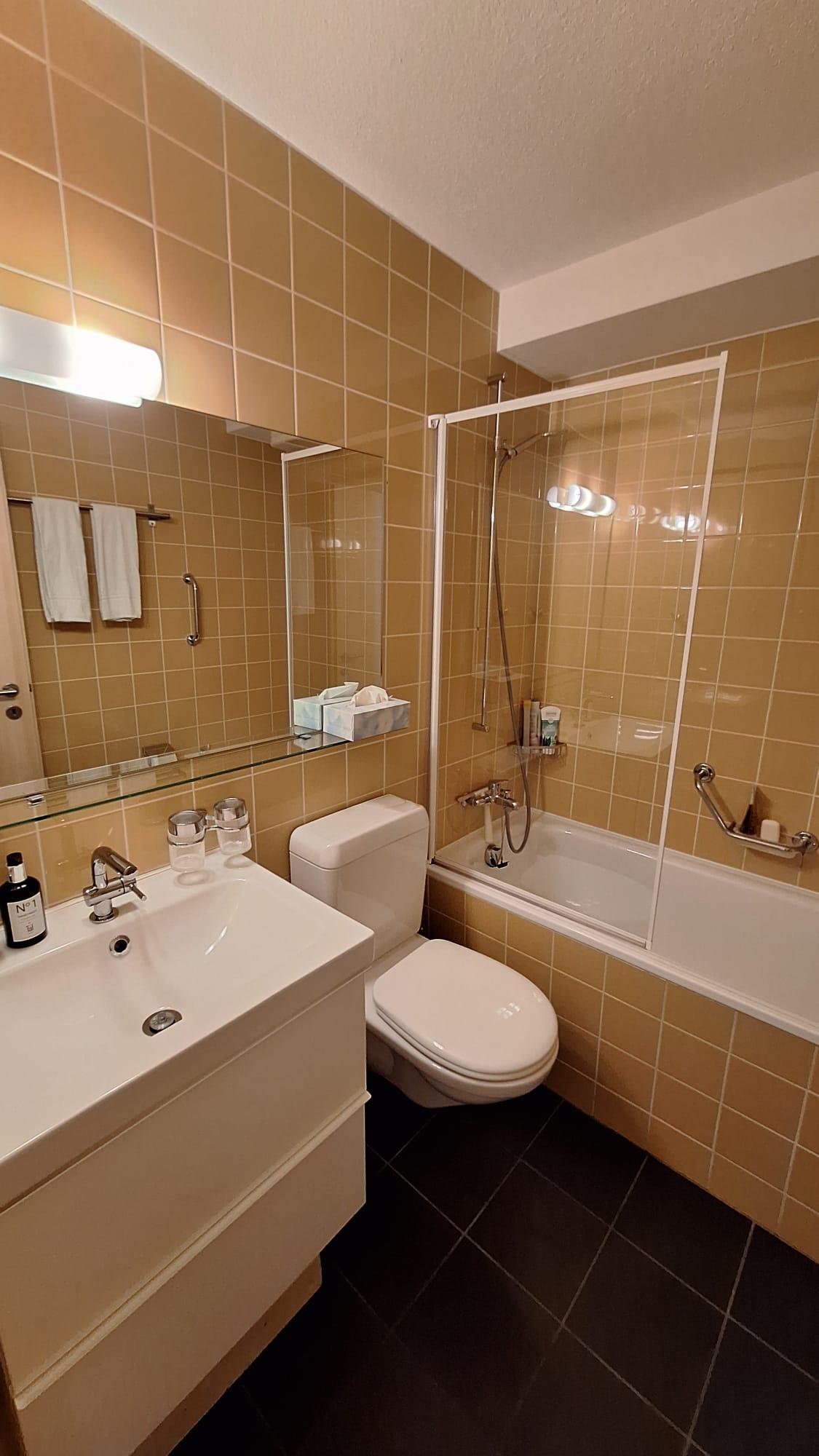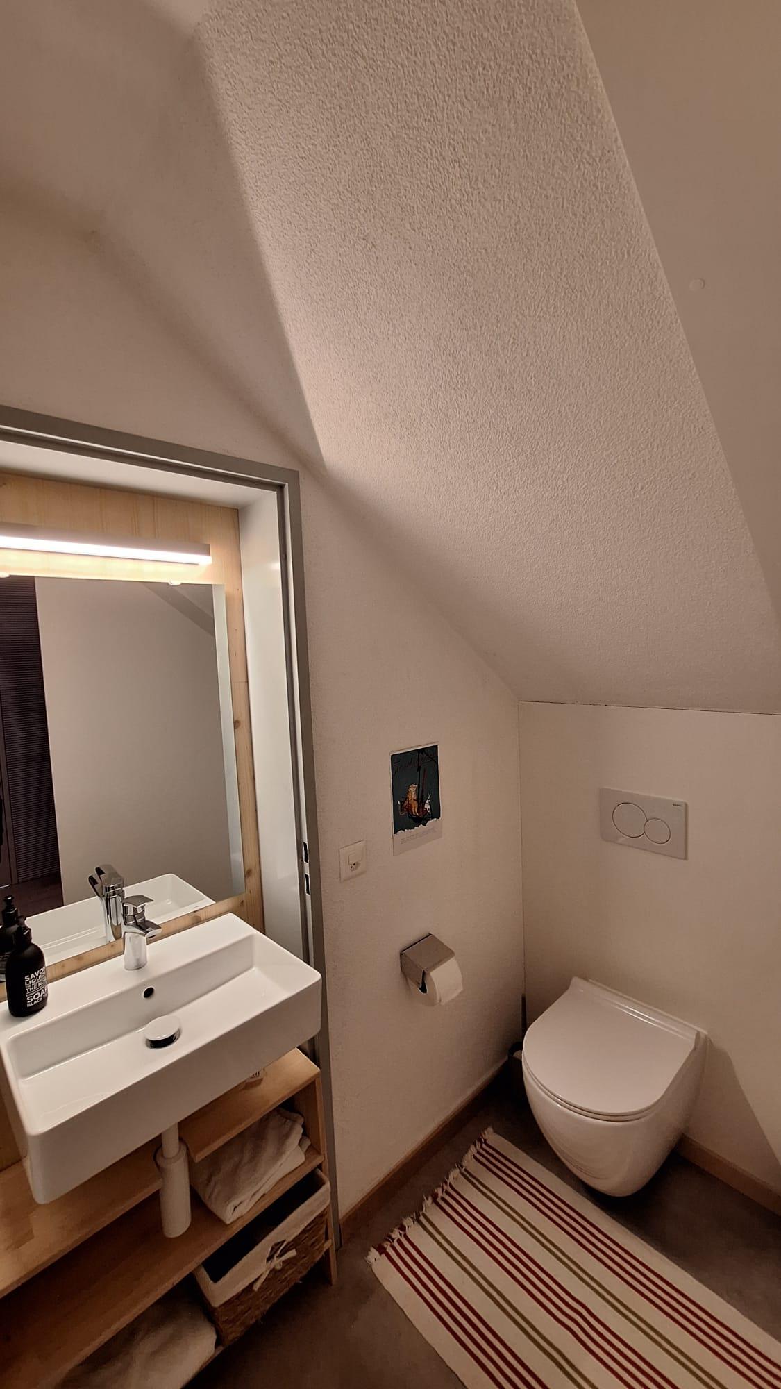 • Badezimmer mit Badewanne/Dusche, separates WC mit Waschbecken, Dusche bei der Sauna