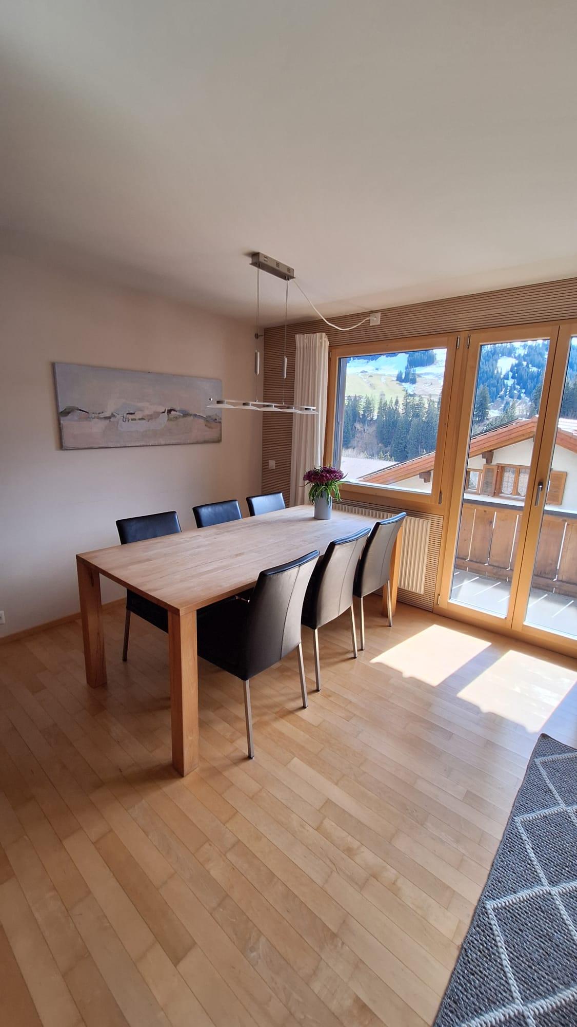 Sie finden in der Wohnung alle Annehmlichkeiten für einen entspannten Aufenthalt. Gemütliche Sitzecken, einen grossen Tisch zum Essen, Spielen oder Arbeiten im Home-Office, einen Schwedenofen für das Hüttenzauber-Gefühl, bequeme Betten und zweckmässige sanitäre Einrichtungen. Nach einem sportlichen Tag dürfen Sie in der Sauna die Muskeln verwöhnen.