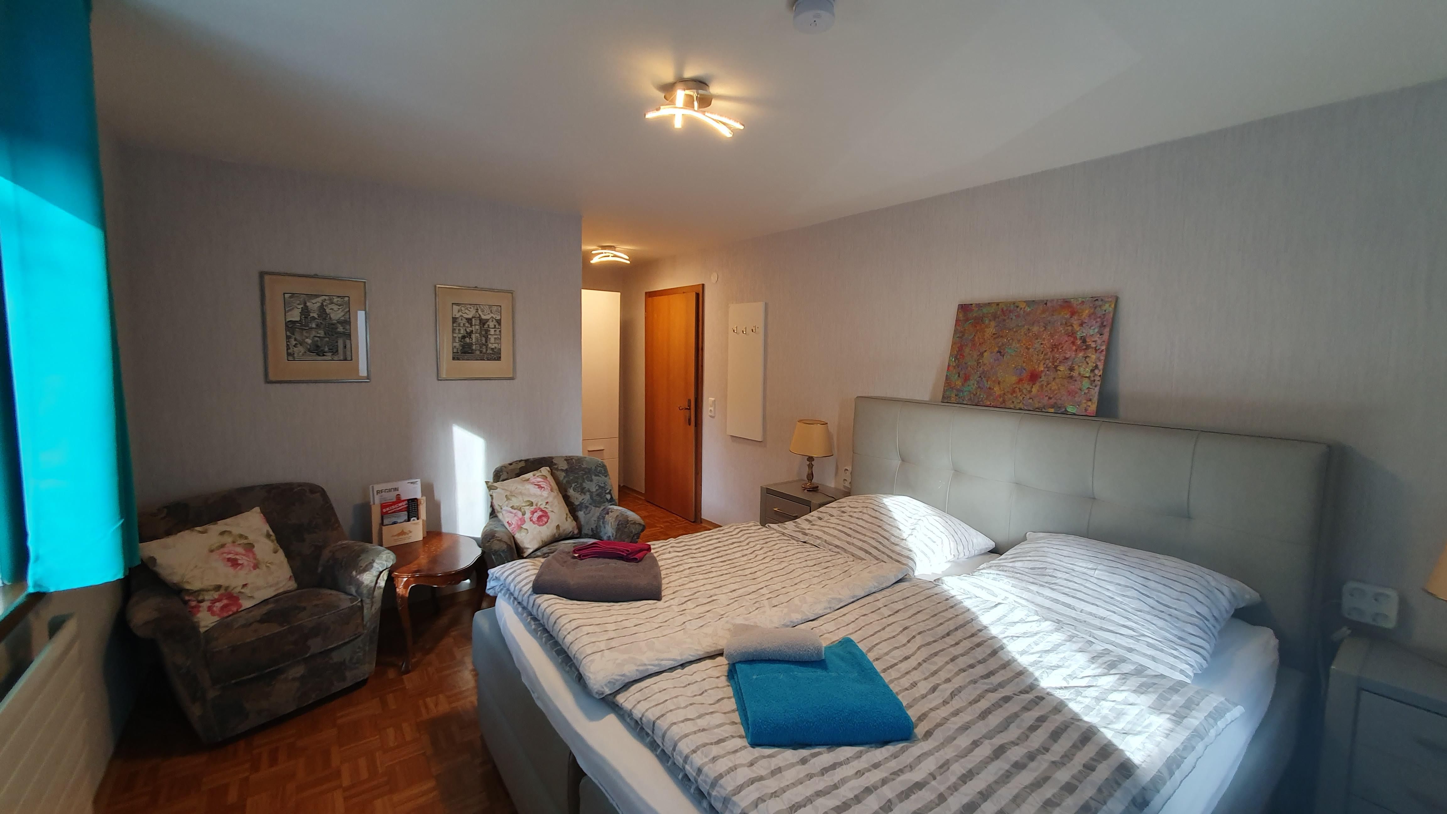Boxspringbett 1,80 m x 2,00 m. / Kleiderschrank / Allergiker geeignete Bettwäsche (wöchentlicher Wechsel) / Eigene Fensterbad mit Dusche / WC en Suite / Handtücher / Duschtücher (Bademantel gegen Pfand) / Duschgel / Shampoo / Seife / Kosmetiktücher / Kosmetikspiegel / Föhn / Nähetui / Schuhanzieher / Schuhputzzeug / Kuscheldecken / Flachbildschirm TV, Radio / Kostenfreies WLAN / Regionale Tageszeitung / Leselampe / Haus Safe / Weckservice