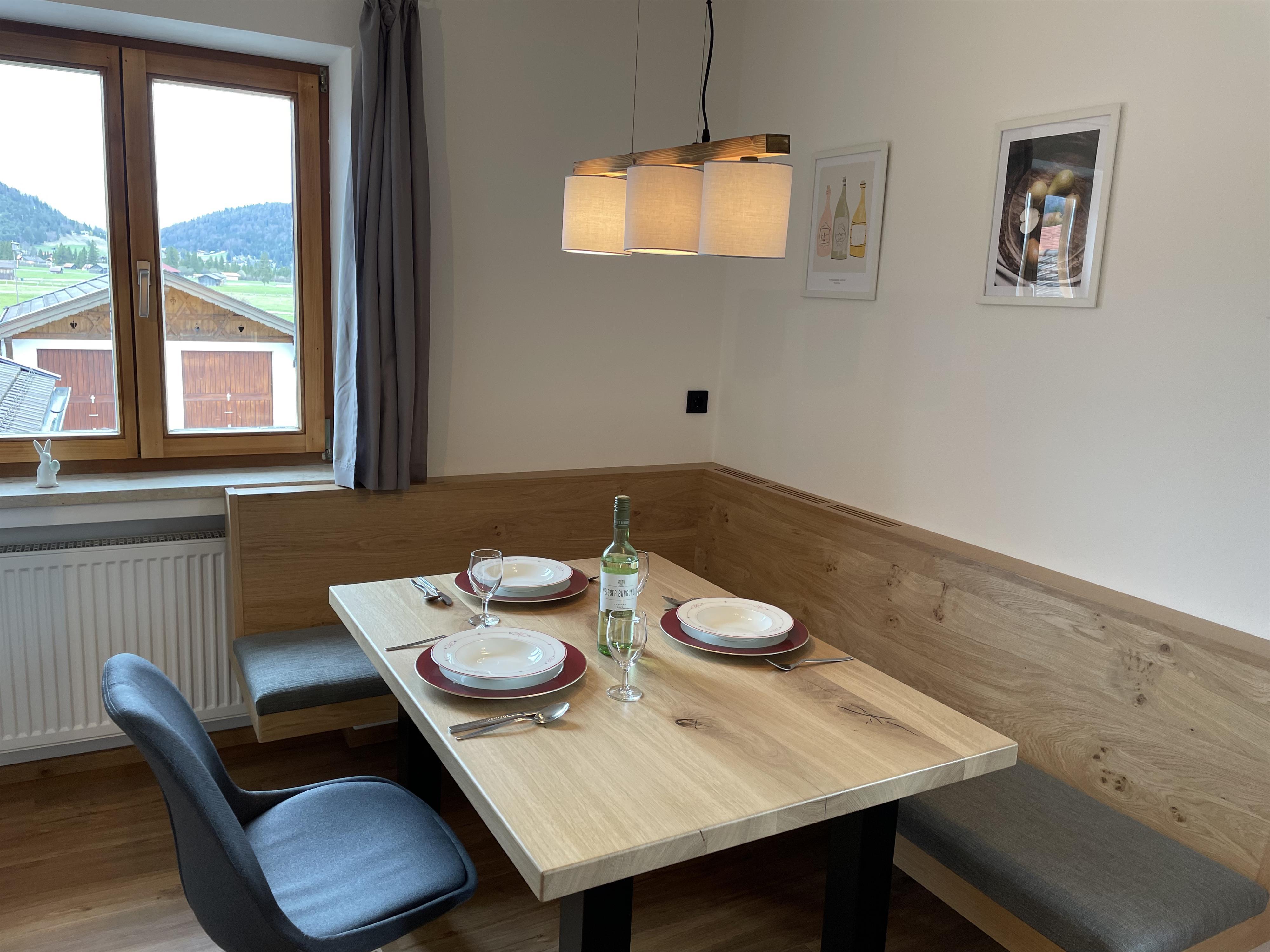 Unsere Ferienwohnung Alpspitze bietet mit einem westlich ausgerichteten Balkon traumhafte Sonnenuntergänge und einen herrlichen Ausblick auf das gesamte Karwendel- und Wettersteinmassiv inkl. Zugspitze. Die Ferienwohnung verfügt über eine geschmackvolle & rustikale Einrichtung, eine separate Küche inkl. Geschirrspülmaschine und 3-Plattenceranfeld, Flachbild-TV und kostenfreies WLan. Das Bad ist mit einem WC und einer Dusche ausgestattet. Mit einer großen Fensterfront im Wohnzimmer, haben Sie uneingeschränkten Blick auf das tolle Bergpanorama von Krün. Eine große Couch lädt zum Entspannen vor toller Bergkulisse ein. Eine Ausziehmöglichkeit der Couch ist vorhanden. Erholsamen Schlaf finden sie in einem handgefertigtem Bett aus Eschenholz. Die Couch im Wohnzimmer ist ausziehbar und bietet ein vollwertiges Bett mit Matratzengröße 160cm x 200cm. Das macht die Ferienwohnung auch für 3 Erwachsene oder Zwei Erwachsene und zwei Kinder buchbar.