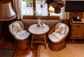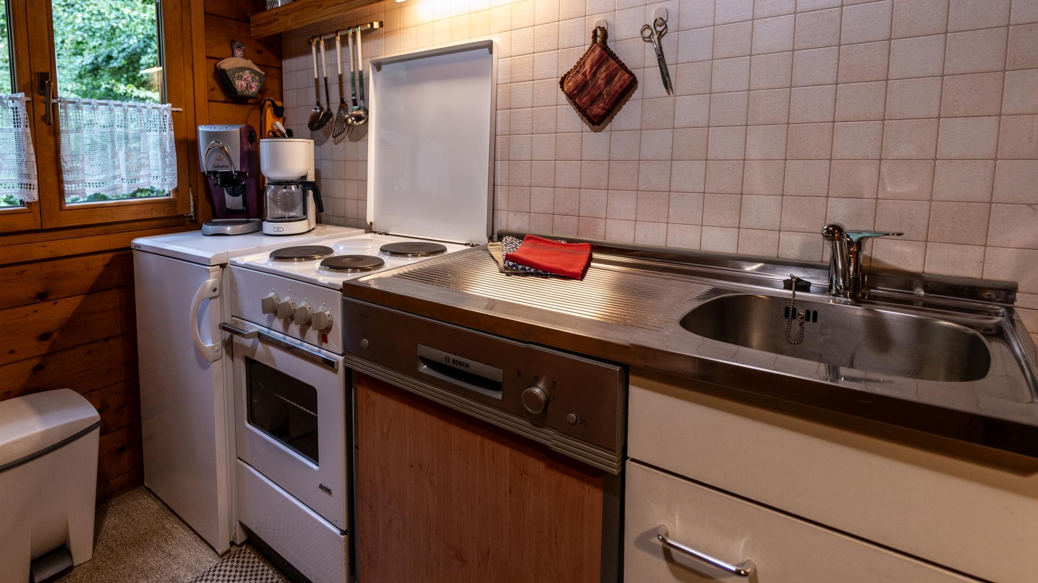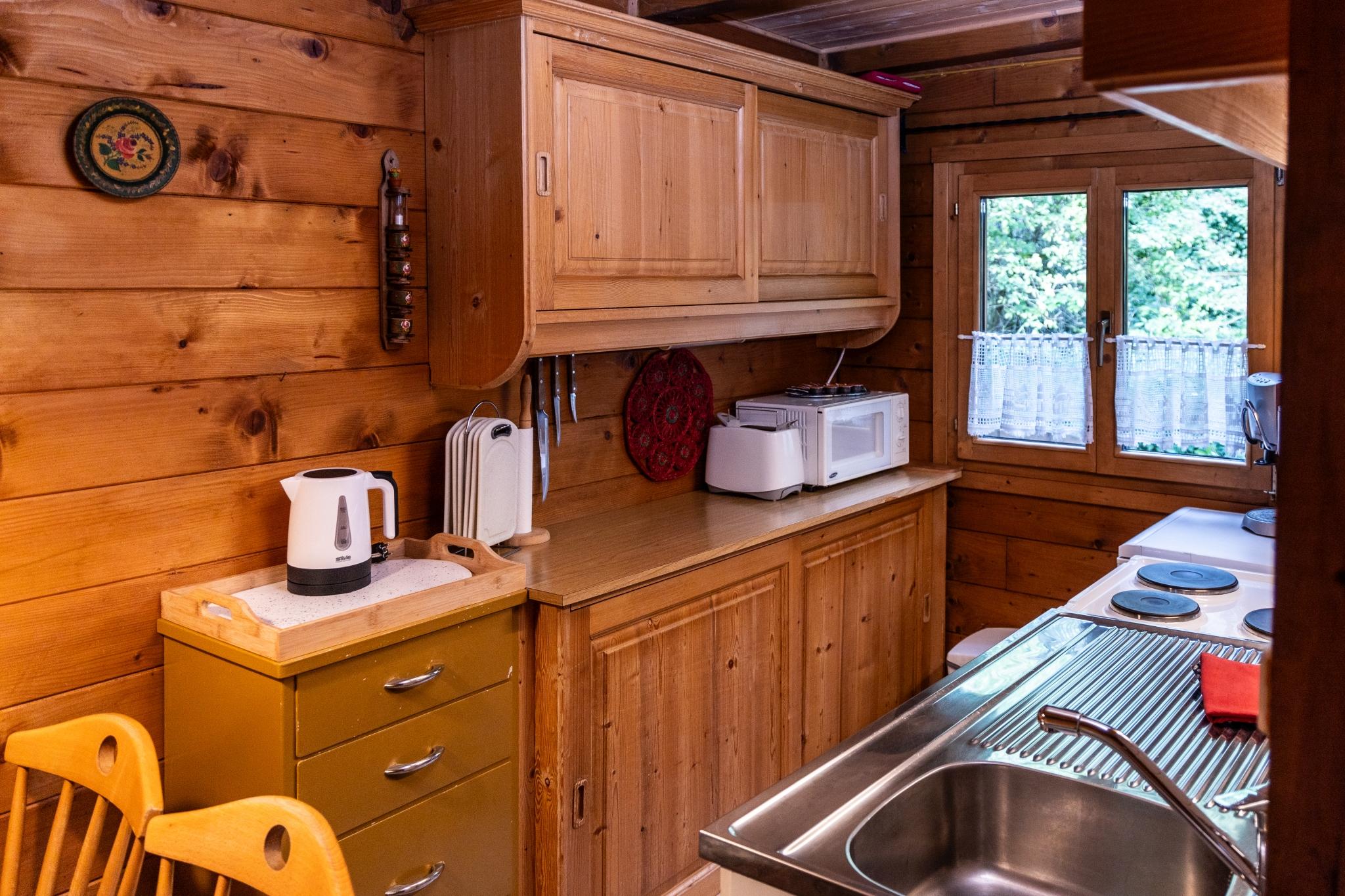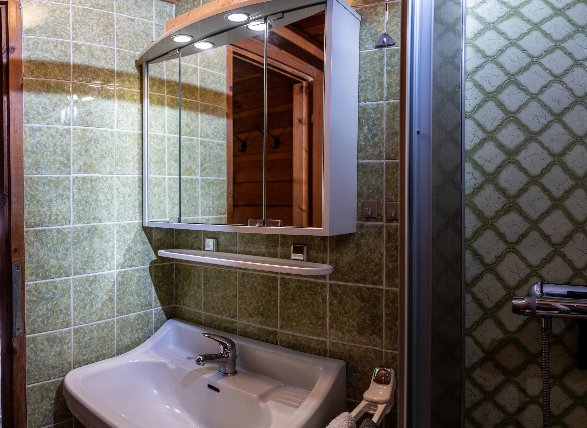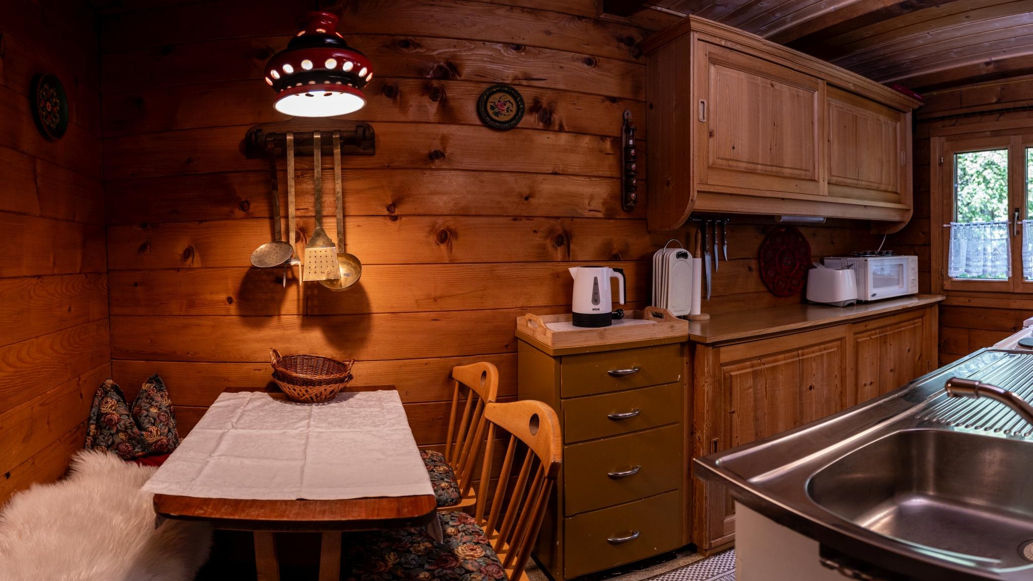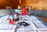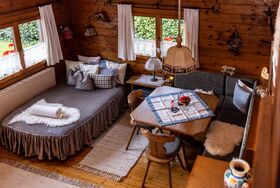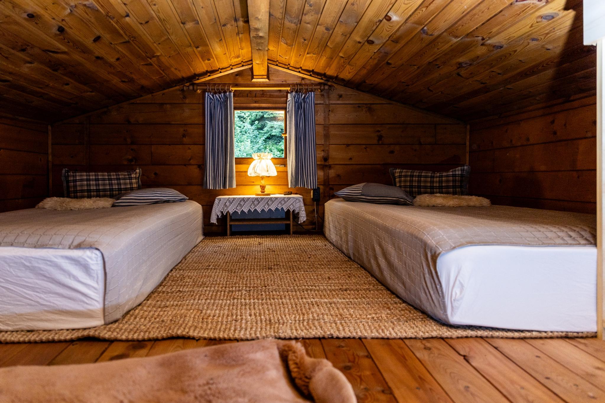 Die Hütte verfügt über ein gemütliches Wohnzimmer mit Esstisch und Fernsehcouch. Das Hauptschlafzimmer mit Doppelbett ist vom Wohnzimmer aus zugänglich. Zusätzlich gibt es ein zweites Schlafzimmer mit Etagenbett und Einzelbett. Das kleine, zweckmäßige Bad verfügt über eine Dusche, WC und ein Waschbecken. Die Küche ist mit sämtlichen Geräten und Geschirr ausgestattet. Ebenso eine kleine Sitzgelegenheit gibt es in der Küche.