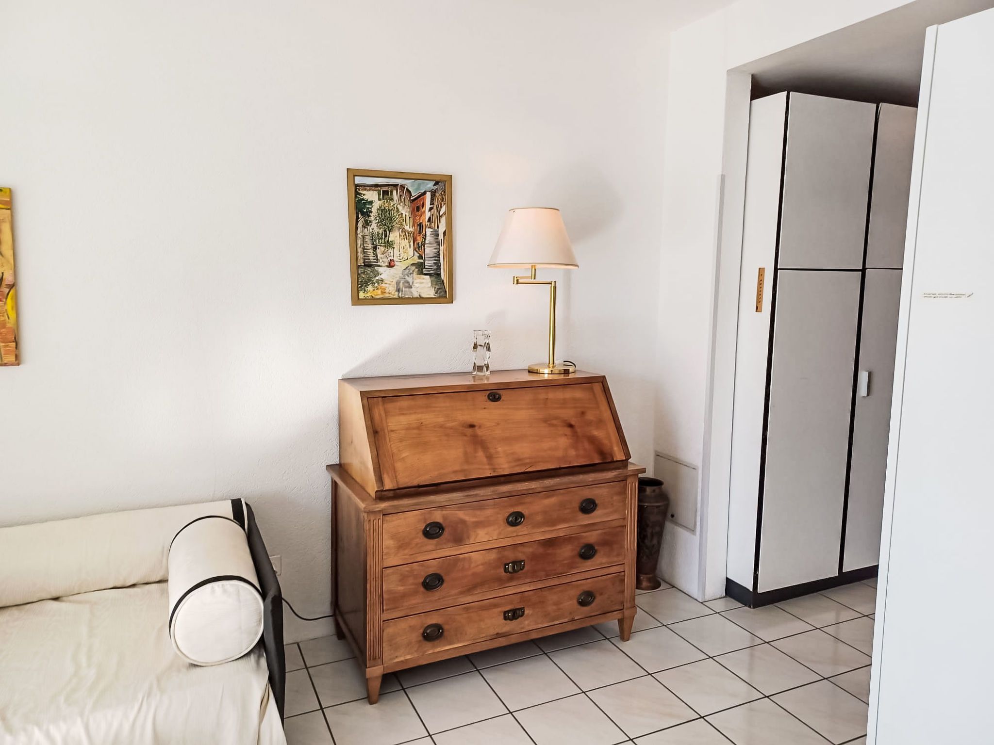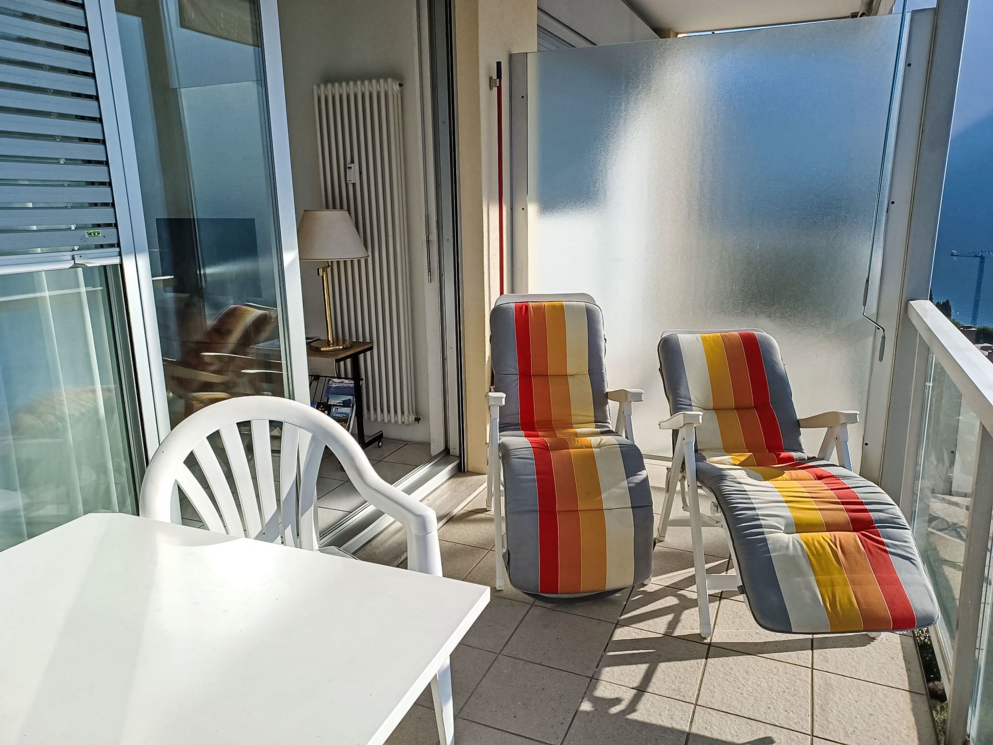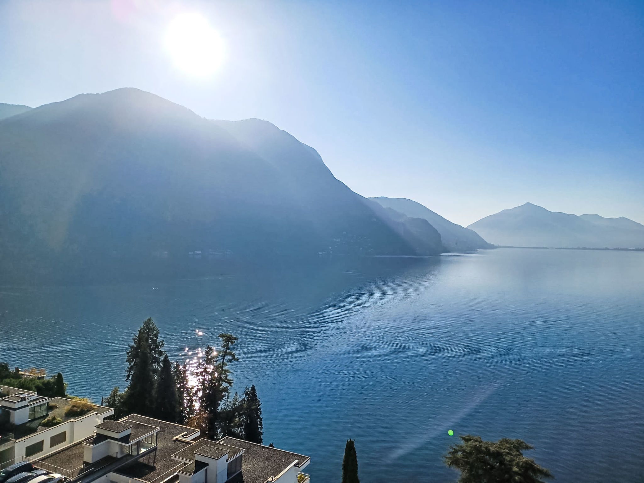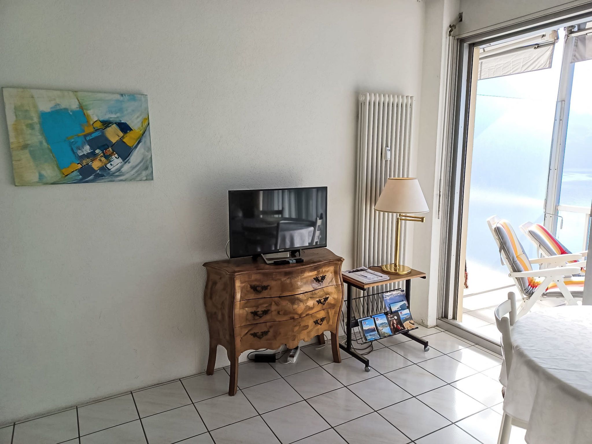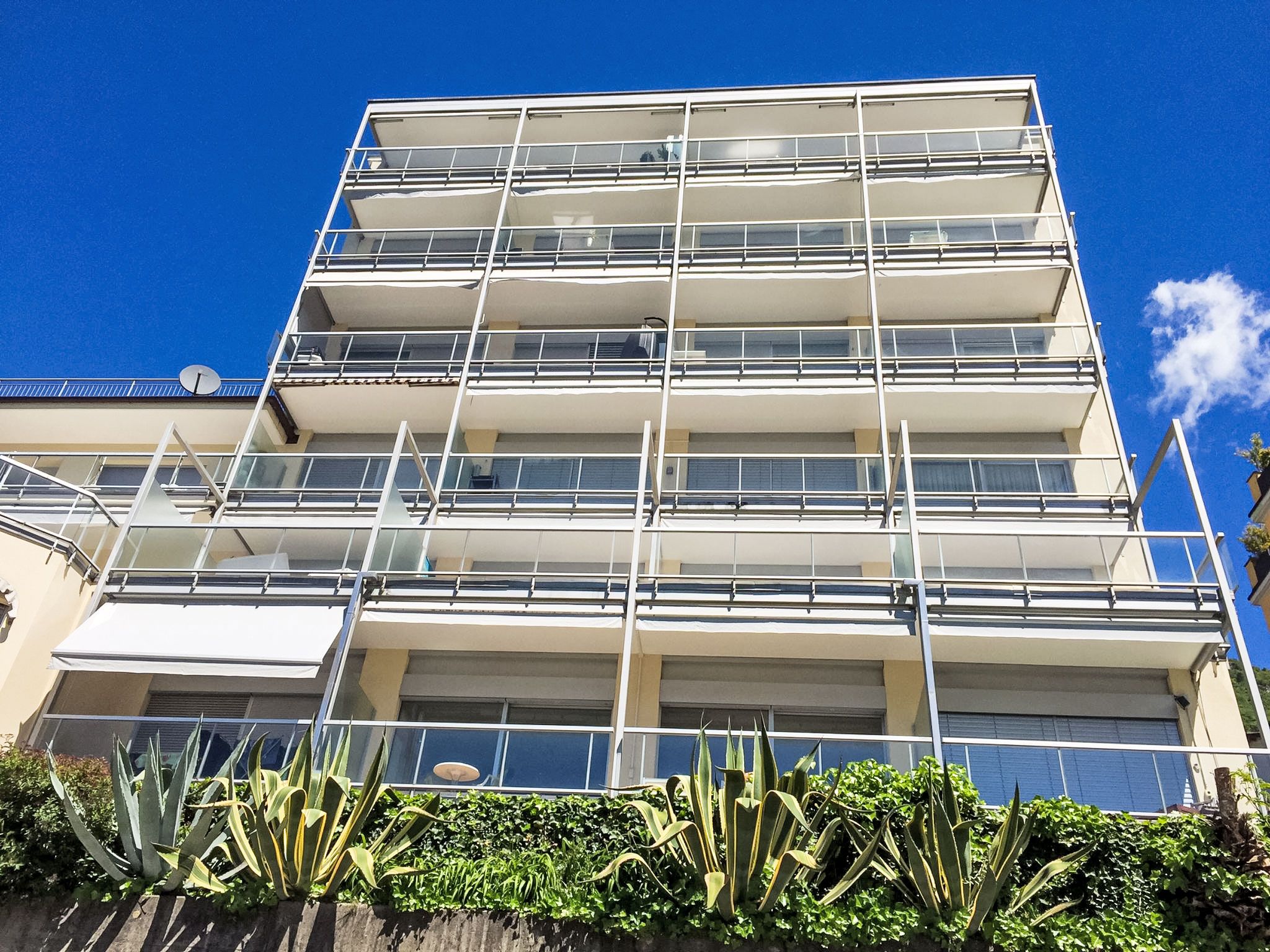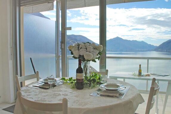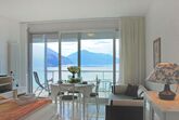 Vista Lago, 1-Zimmer-Studio 35 m2 im 6. Stock, Südlage. Geräumig und hell, komfortabel und modern eingerichtet: offenes Wohn-/Schlafzimmer mit Panoramafenster mit 1 Doppelwandschrankbett (2 x 90 cm, Länge 200 cm), Esstisch und Sat-TV (Flachbildschirm). Ausgang zur Terrasse. Kleine Küche (4 Kochplatten, Backofen, Geschirrspüler). Dusche/WC. Terrasse 8 m2 teilweise überdacht, Südlage. Terrassenmöbel. Herrliche Panoramasicht auf den See, die Berge, die Landschaft und die Ortschaft. Zur Verfügung: Kinderhochstuhl, Babybett bis 2 Jahre (extra). Internet (Wireless LAN, gratis). Parkplatz Nr. 20 (überdacht), Höhe 290 cm, Breite 230 cm. Bitte beachten: Nichtraucher-Unterkunft. TV nur DE, EN, ES. NL-