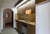 Offene Küche mit Dampfabzug, mit 3-Plattenherd, Kühlschrank mit Tiefgefrierfach,
