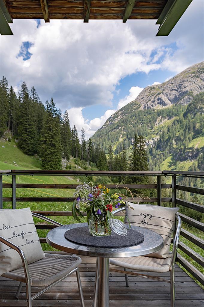 Jeder dieser Ferienwohnungen verfügt über einen Südbalkon mit Sitzmöbel und einem fantastischen Ausblick in Richtung Lech. Im Sommer grasen die Kühe direkt vorm Balkon.