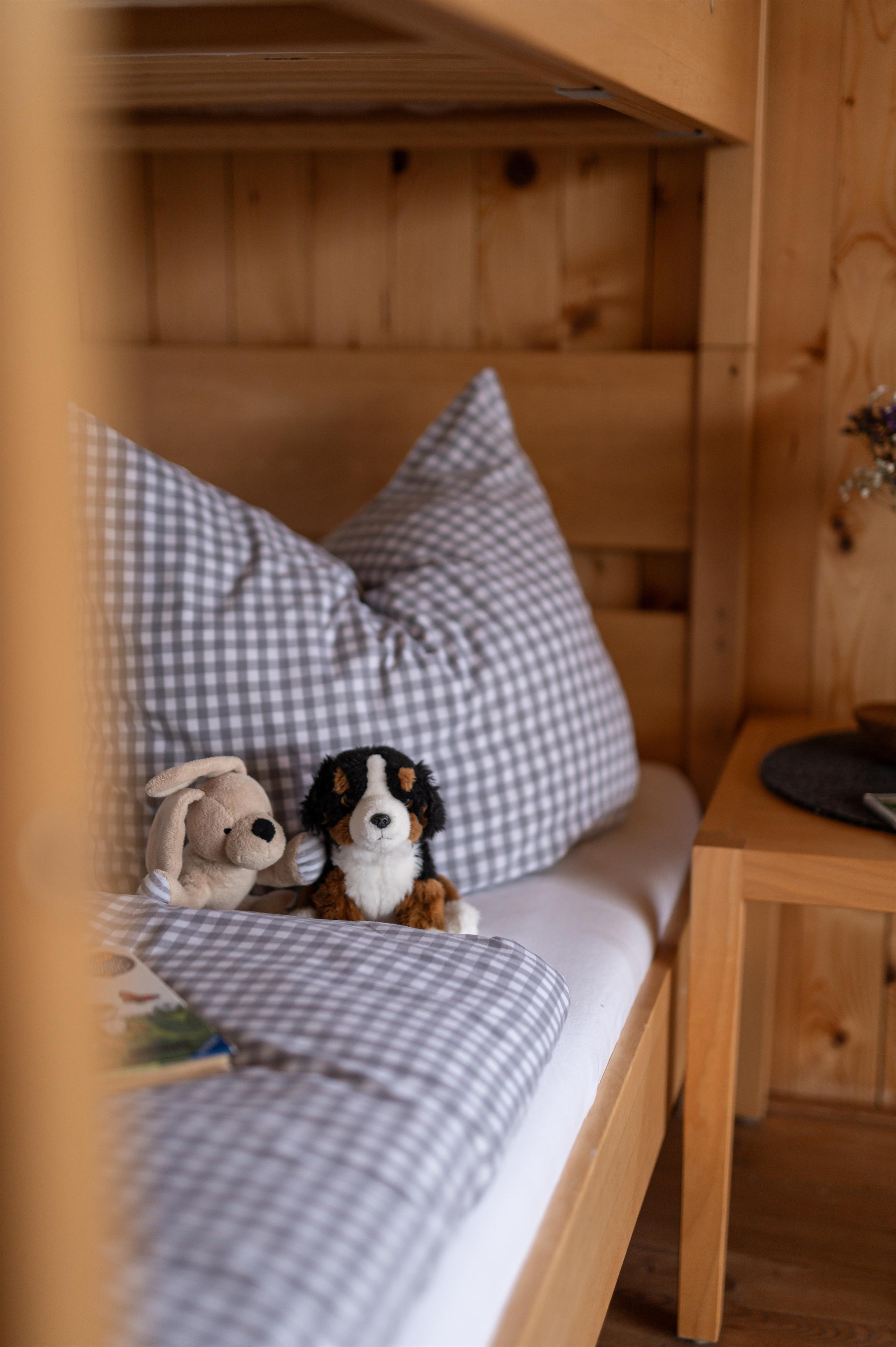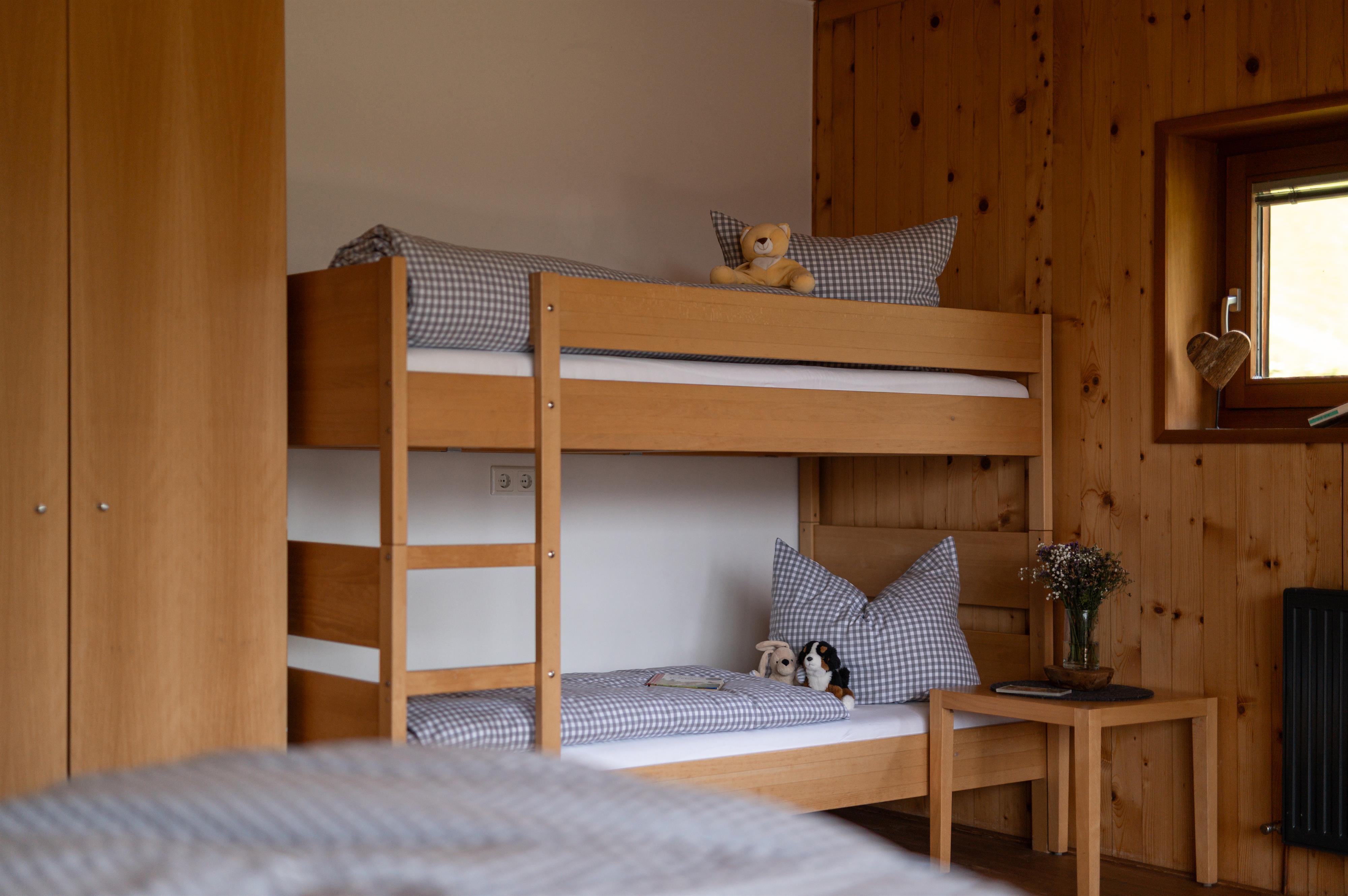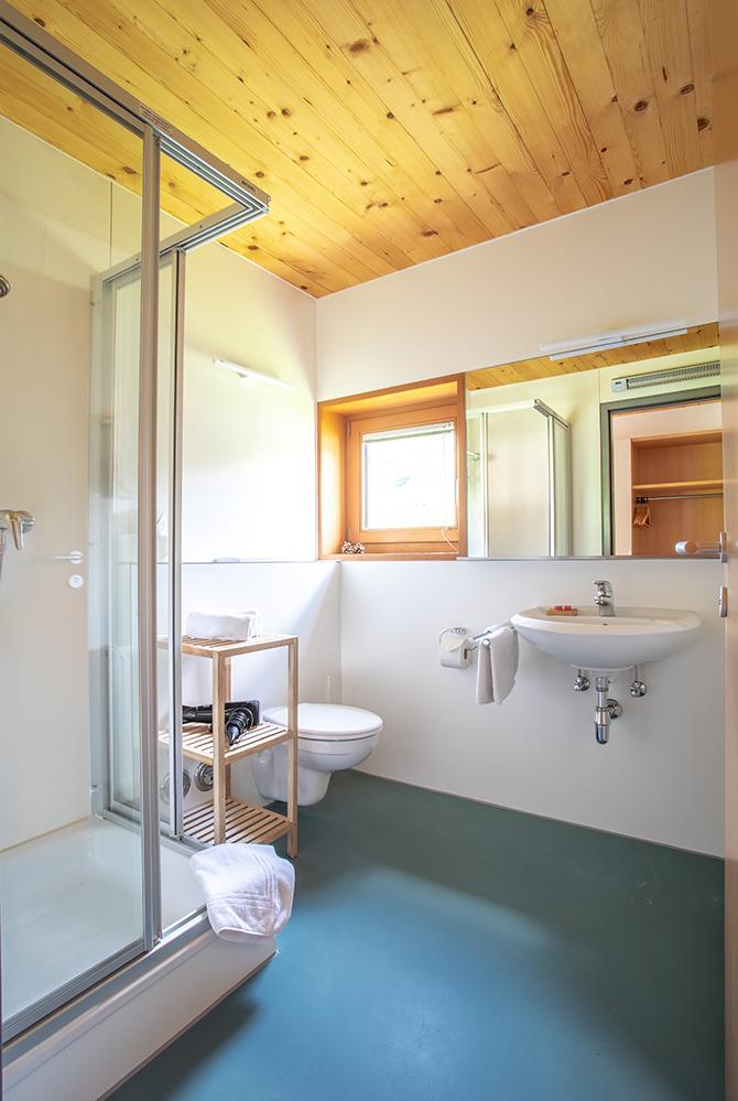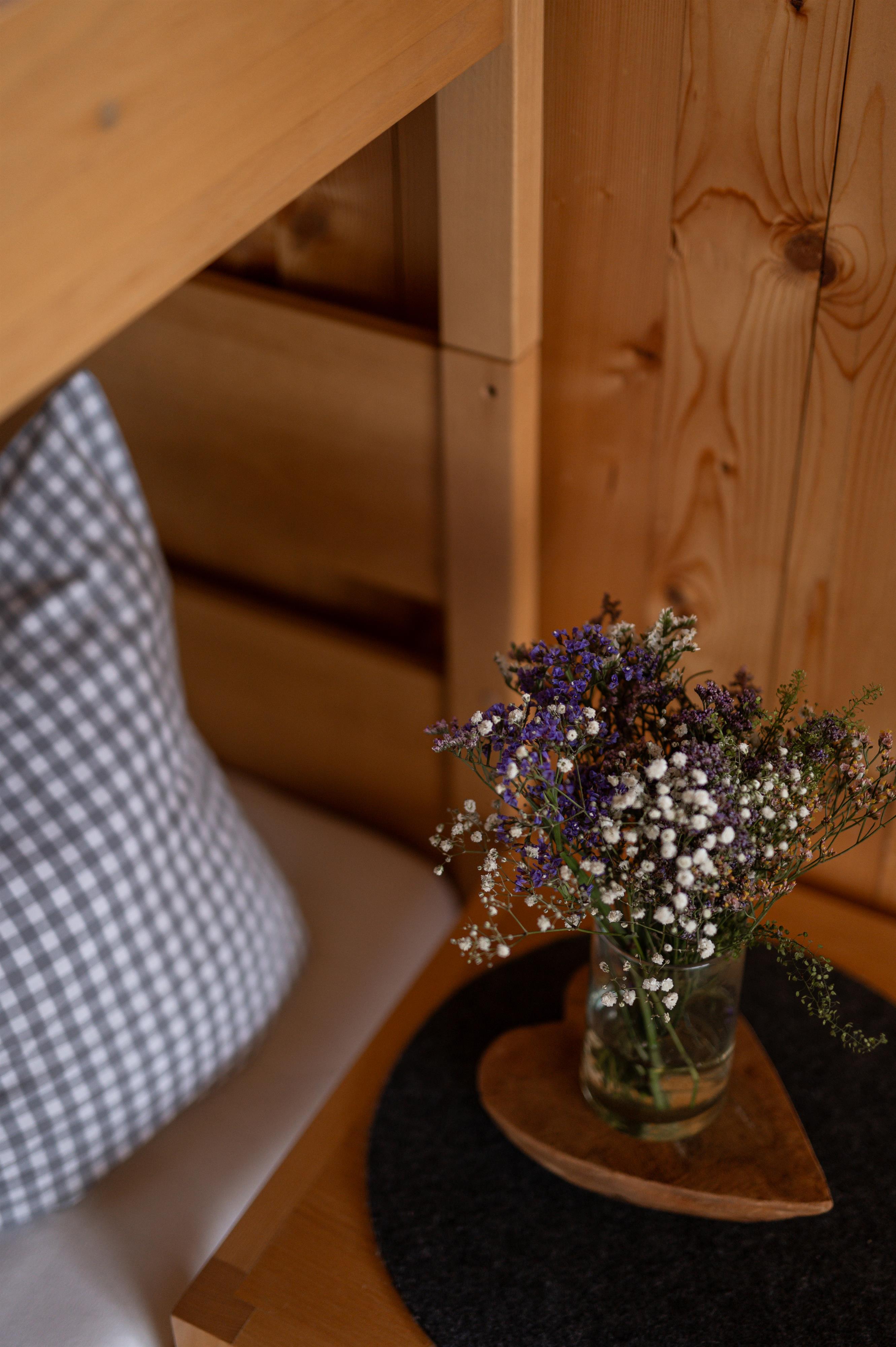 Das Appartement Mittagspitze verfügt über ein Schlafzimmer mit Doppelbett aus heimischem Zirbenholz, einem Schlafsofa im Wohnzimmer und einem Badezimmer mit Dusche/WC.